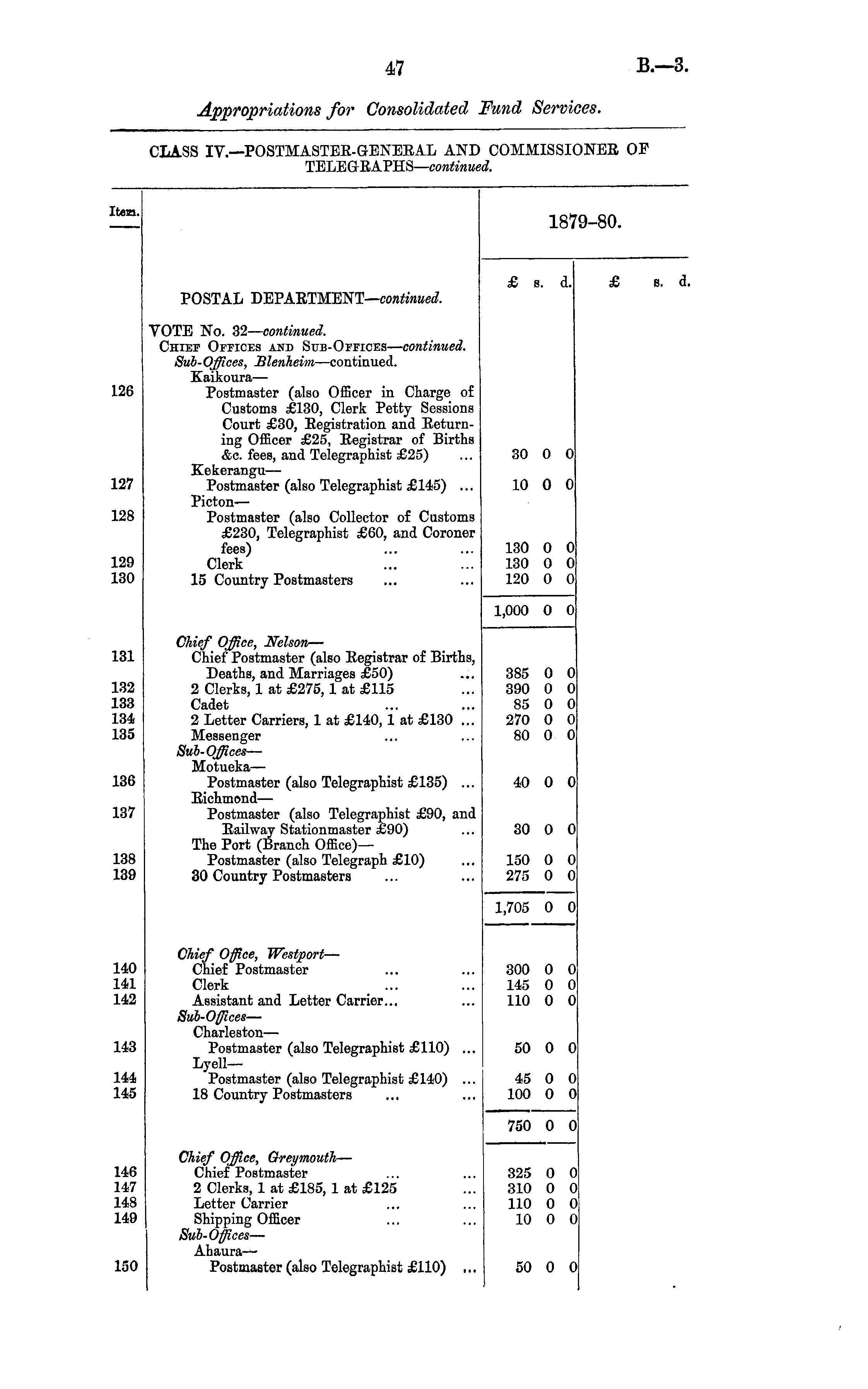 Appropriations for Consolidated Fund Services. CLASS IV.—POSTMASTER-GENERAL ANI TELEGRAPHS— continu, | COMMISSIONER OF ;d. Ite». 18' 9-80. £ s. d. £ B. d POSTAL DEPARTMENT— continued. 126 VOTE No. 32— continued. Chief Offices and Sub-Offices— continued. Sub-Offices, Blenheim —continued. Kaikoura — Postmaster (also Officer in Charge of Customs £130, Clerk Petty Sessions Court £30, Eegistration and Returning Officer £25, Registrar of Births &c. fees, and Telegraphist £25) Kekerangu — Postmaster (also Telegraphist £145) ... Picton— Postmaster (also Collector of Customs £230, Telegraphist £60, and Coroner fees) Clerk 15 Country Postmasters 30 0 0 127 10 0 0 128 130 130 120 0 0 0 0 0 0 129 130 1,000 0 0 131 132 133 134 135 Chief Office, Nelson — Chief Postmaster (also Registrar of Births, Deaths, and Marriages £50) 2 Clerks, 1 at £275,1 at £115 Cadet 2 Letter Carriers, 1 at £140, 1 at £130 ... Messenger Sub-Offices— Motueka— Postmaster (also Telegraphist £135) ... Richmond — Postmaster (also Telegraphist £90, and Railway Stationmaster £90) The Port (Branch Office)— Postmaster (also Telegraph £10) 30 Country Postmasters 385 390 85 270 80 40 0 0 0 0 0 0 0 0 0 0 0 0 136 137 30 0 0 138 139 150 275 0 0 0 c 1,705 0 0 140 141 142 Chief Office, Westport— Chief Postmaster Clerk Assistant and Letter Carrier... Sub-Offices— Charleston — Postmaster (also Telegraphist £110) ... Lyell— Postmaster (also Telegraphist £140) ... 18 Country Postmasters 300 0 145 0 110 0 0 0 0 143 50 0 0 144 145 45 0 100 0 0 0 750 0 0 146 147 148 149 Chief Office, Greymouth — Chief Postmaster 2 Clerks, 1 at £185, 1 at £125 Letter Carrier Shipping Officer Sub-Offices— Ahaura— Postmaster (also Telegraphist £110) ... 325 310 110 10 0 0 0 0 0 0 0 0 50 0 (. 150