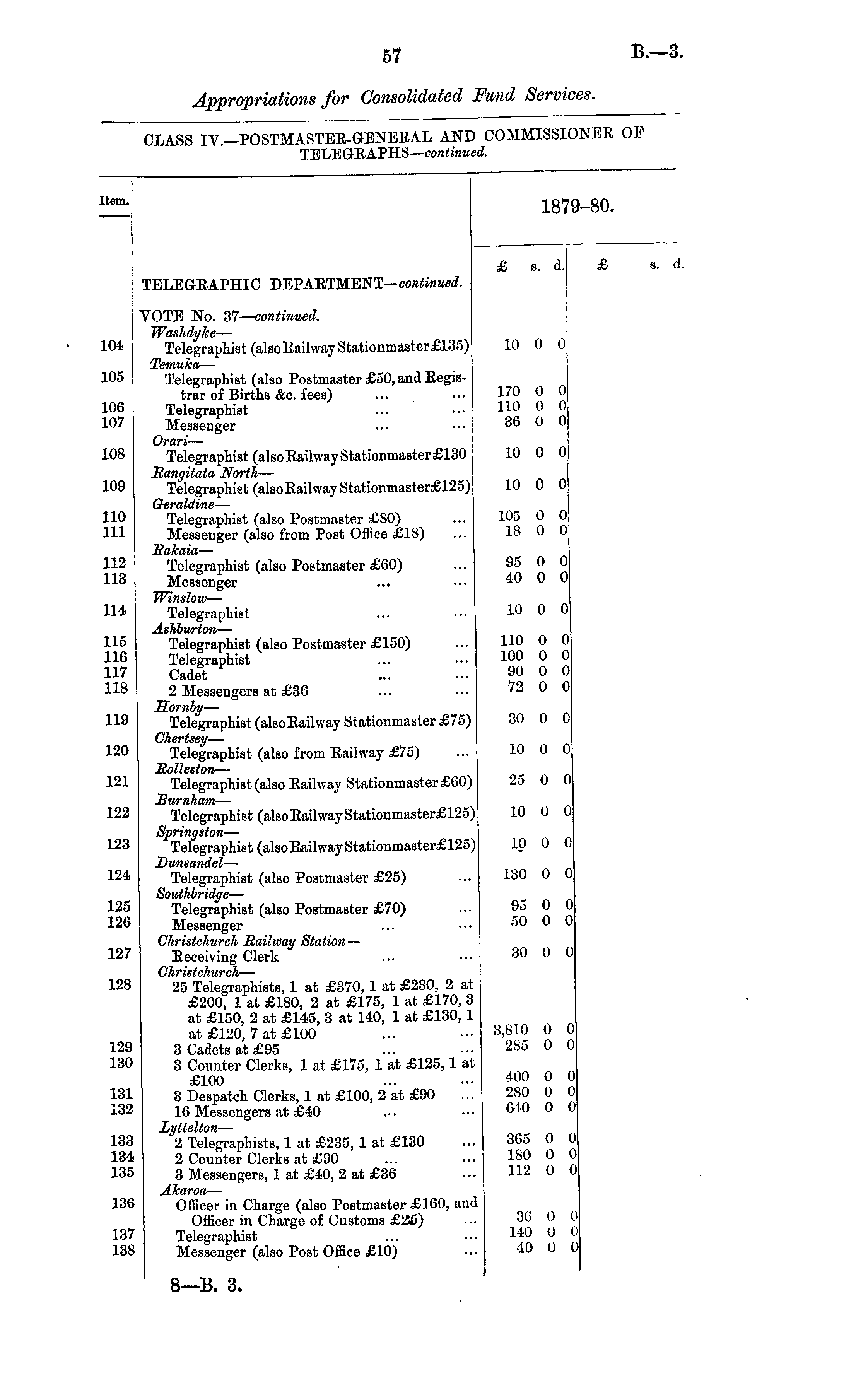Appropriations for Consolidated Fund Services. CLASS IV— POSTMASTEE-GENEEAL ANI TELEGEAPHS— continue i COMM1SSIONEE OP Item. 18 9-80. £ s. d. £ s. a TELEGEAPHIC DEPARTMENT—continued. 104 ; 105 106 107 108 109 110 111 112 113 114 115 116 117 118 119 120 121 VOTE ~No. 37— continued. Washdyke — Telegraphist (also EailwayStationmaster£135) Temuka — Telegraphist (also Postmaster £50, and Eegistrar of Births &c. fees) Telegraphist Messenger Orari — Telegraphist (also Eailway Stationmaster £130 Rangitata North — Telegraphist (alsoEailway Stationmaster£125) Qeraldine — Telegraphist (also Postmaster £80) Messenger (also from Post Office £18) Rakaia — Telegraphist (also Postmaster £60) Messenger Winsloic — Telegraphist Asliburton — Telegraphist (also Postmaster £150) Telegraphist Cadet 2 Messengers at £36 Hornby — Telegraphist (alsoEailway Stationmaster £75) Chertsey — Telegraphist (also from Eailway £75) Rolleston — Telegraphist (also Eailway Stationmaster £60) Burnham — Telegraphist (alsoEailwayStationmaster£125) Springston — Telegraphist (alsoEailway Stationmaster£125) Dunsandel — Telegraphist (also Postmaster £25) Southbridge — Telegraphist (also Postmaster £70) Messenger Cliristchurcli Railway Station — Eeceiving Clerk Christchurch — 25 Telegraphists, 1 at £370, 1 at £230, 2 at £200, 1 at £180, 2 at £175, 1 at £170, 3 at £150, 2 at £145, 3 at 140, 1 at £130, 1 at £120, 7 at £100 3 Cadets at £95 3 Counter Clerks, 1 at £175, 1 at £125,1 a £100 3 Despatch Clerks, 1 at £100, 2 at £90 16 Messengers at £40 Lyttelton — 2 Telegraphists, 1 at £235,1 at £130 2 Counter Clerks at £90 3 Messengers, 1 at £40, 2 at £36 Akaroa — Officer in Charge (also Postmaster £160, and Officer in Charge of Customs £25) Telegraphist Messenger (also Post Office £10) 10 0 0 170 0 0 110 0 0 36 0 0 10 0 0 10 0 0 105 0 0 18 0 0 95 0 0 40 0 0 10 0 0 110 0 0 100 0 0 90 0 0 72 0 0 30 0 0 10 0 0 25 0 0 122 10 0 0 123 10 0 0 124 130 0 0 125 126 95 0 0 50 0 0 127 30 0 0 128 3,810 0 0 2S5 0 0 129 130 131 132 400 0 0 280 0 0 640 0 0 133 134 135 365 0 0 180 0 0 112 0 0 136 3G 0 0 140 0 (i 40 0 0 137 138 8—B. 3.