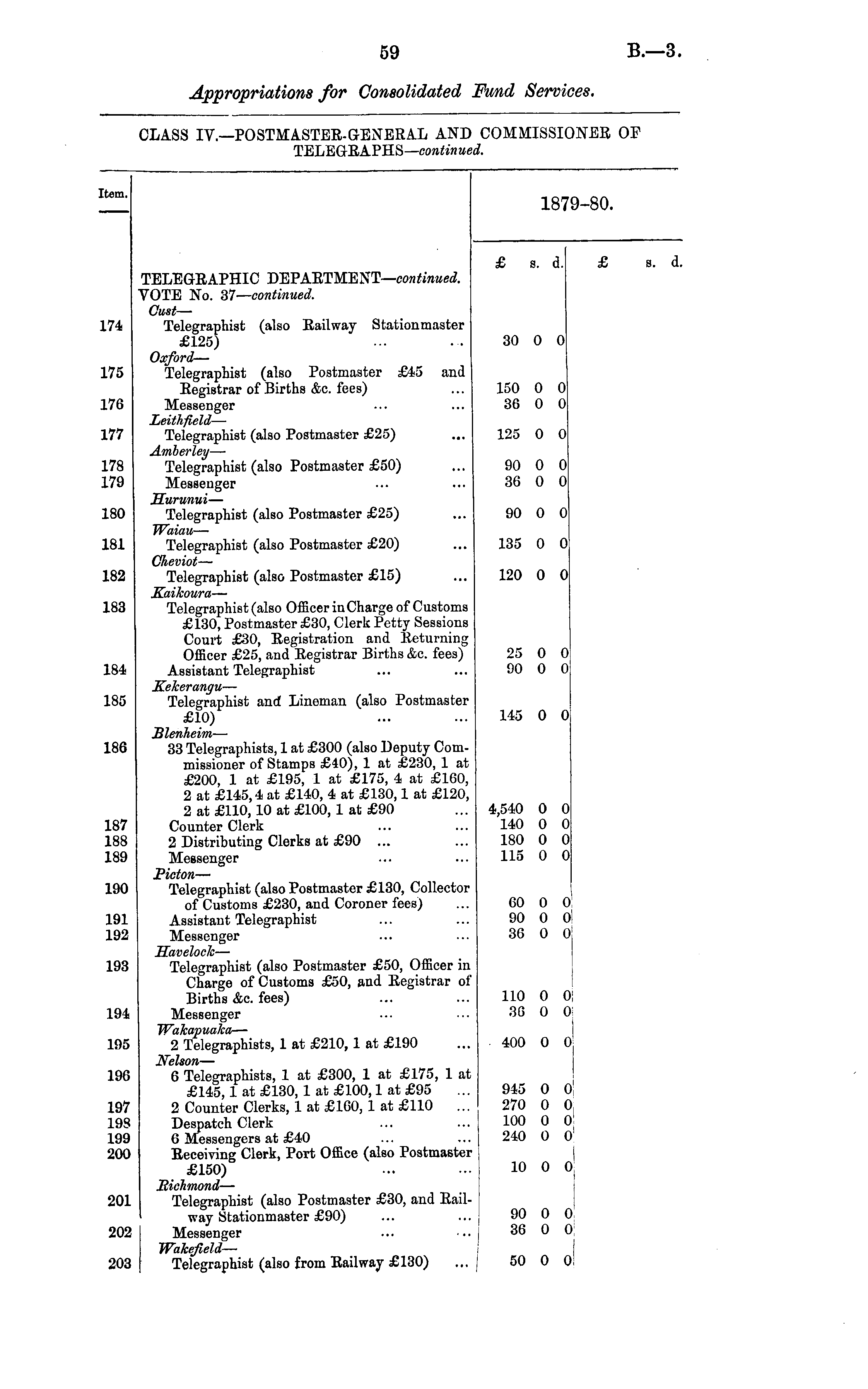 Appropriations for Consolidated Fund Services. CLASS IV—POSTMASTER-GENERAL ANI TELEGRAPHS— continue COMMISSIONER OF >,d. Item. 9-80. 18 TELEGRAPHIC DEPARTMENT— continued. VOTE No. 37— continued. Gust — Telegraphist (also Railway Stationmaster £125) Oxford — Telegraphist (also Postmaster £45 and Registrar of Births &c. fees) Messenger Leithfield — Telegraphist (also Postmaster £25) Amherley — Telegraphist (also Postmaster £50) Messenger Hurunui — Telegraphist (also Postmaster £25) TVaiau — Telegraphist (also Postmaster £20) Clieviot — Telegraphist (also Postmaster £15) Kaikoura — Telegraphist (also Officer inCharge of Customs £130, Postmaster £30, Clerk Petty Sessions Court £30, Registration and Returning Officer £25, and Registrar Births &c. fees) Assistant Telegraphist Kekerangu — Telegraphist and Lineman (also Postmaster £10) Blenheim— 33 Telegraphists, 1 at £300 (also Deputy Commissioner of Stamps £40), 1 at £230, 1 at £200, 1 at £195, 1 at £175, 4 at £160, 2 at £145,4 at £140, 4 at £130,1 at £120, 2 at £110,10 at £100, 1 at £90 Counter Clerk 2 Distributing Clerks at £90 ... Messenger JPicton — Telegraphist (also Postmaster £130, Collector of Customs £230, and Coroner fees) Assistant Telegraphist Messenger Haveloclc — Telegraphist (also Postmaster £50, Officer in Charge of Customs £50, and Registrar ot Births &c. fees) Messenger TVakapualca — 2 Telegraphists, 1 at £210, 1 at £190 Nelson — 6 Telegraphists, 1 at £300, 1 at £175, 1 at £145,1 at £130, 1 at £100,1 at £95 2 Counter Clerks, 1 at £160, 1 at £110 ... Despatch Clerk 6 Messengers at £40 Receiving Clerk, Port Office (also Postmaster £150) " ... Miehmond — Telegraphist (also Postmaster £30, and Railway Stationmaster £90) Messenger Wakefield— Telegraphist (also from Railway £130) £ s. i d. £ 3. d, 174 30 0 0 175 150 36 0 0 0 0 176 177 125 0 0 178 179 90 36 0 0 0 0 180 90 0 0 181 135 0 0 182 120 0 0 183 25 90 0 0 0 0 184 185 145 0 0 186 187 188 189 4,540 140 180 115 0 0 0 0 0 0 0 0 190 60 90 36 0 0 0 o; o! 0 191 192 193 110 36 0 0 oi 0 194 195 - 400 0 0 196 945 270 100 240 0 0 0 0 o! °l 0 0 197 198 199 200 10 0 ' 0 201 90 36 0 0 0 o; 202 203 50 0 0