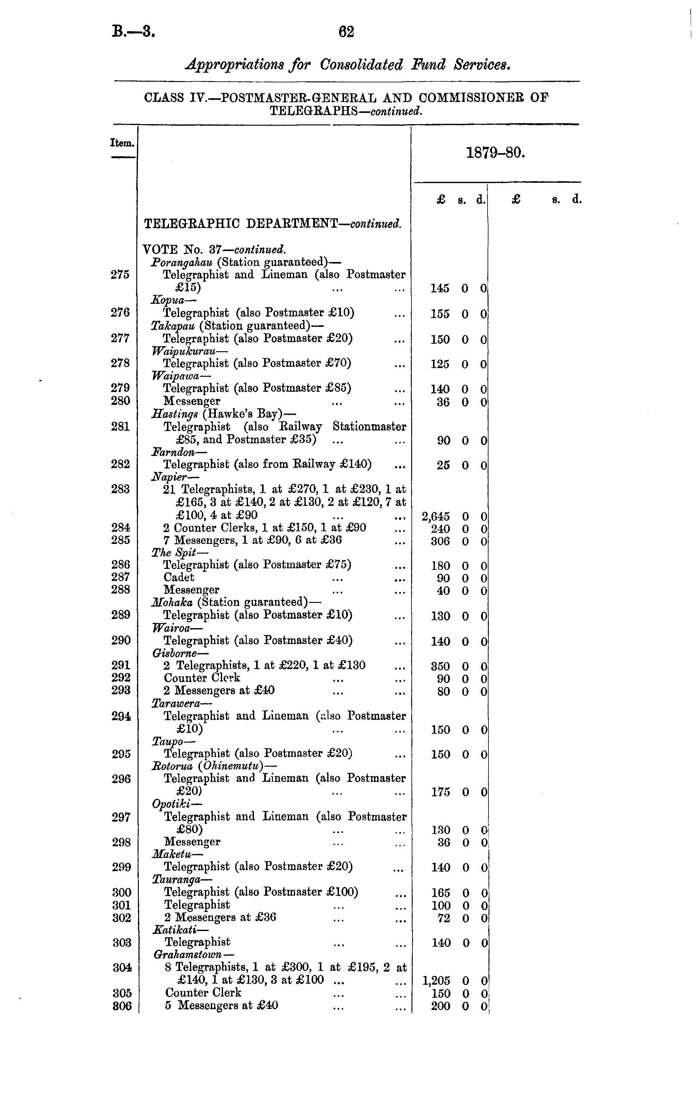Appropriations for Consolidated Fund Services. CLASS IV.—POSTMASTEE-GENERAL AN! TELEGEAPHS— continue COMMISSIONEE OF 4. Item. 18 9-80. £ s. d. £ 8. d TELEGEAPHIC DEPAETMENT— continued. VOTE No. 37— continued. Porangaliau (Station guaranteed)— Telegraphist and Lineman (also Postmaster £15) 275 145 0 0 276 277 278 279 280 281 282 283 Kopua — Telegraphist (also Postmaster £10) Tahapau (Station guaranteed)— Telegraphist (also Postmaster £20) Whip ukurau — Telegraphist (also Postmaster £70) Waipawa — Telegraphist (also Postmaster £85) Messenger Hastings (Hawke's Bay)— Telegraphist (also Railway Stationmaster £85, and Postmaster £35) ... Farndon — Telegraphist (also from Eailway £140) Napier — 21 Telegraphists, 1 at £270, 1 at £230, 1 at £165, 3 at £140, 2 at £130, 2 at £120, 7 at £100, 4 at £90 2 Counter Clerks, 1 at £150, 1 at £90 7 Messengers, 1 at £90, 6 at £36 The Spit— Telegraphist (also Postmaster £75) Cadet Messenger Mohaka (Station guaranteed)— Telegraphist (also Postmaster £10) Wairoa — Telegraphist (also Postmaster £40) Gishorne — 2 Telegraphists, 1 at £220, 1 at £130 Counter Clerk 2 Messengers at £40 Tarawera — Telegraphist and Lineman (ulso Postmaster £10) 155 150 125 140 36 90 25 2,645 240 306 0 0 0 0 0 0 0 0 0 0 0 0 0 0 0 0 0 0 0 (I 284 285 286 287 288 180 90 40 0 0 0 0 0 0 289 130 0 0 290 140 0 0 291 292 293 350 90 80 0 0 0 0 0 0 294 150 0 0 295 296 297 298 299 Taupo — Telegraphist (also Postmaster £20) Rotorua (OJiinemutu) — Telegraphist and Lineman (also Postmaster £20) Opotiki — Telegraphist and Lineman (also Postmaster £80) Messenger Maketu — Telegraphist (also Postmaster £20) Tauranga — Telegraphist (also Postmaster £100) Telegraphist 2 Messengers at £36 Katikati — Telegraphist Grahamstown — 8 Telegraphists, 1 at £300, 1 at £195, 2 at £140, 1 at £130, 3 at £100 ... Counter Clerk 5 Messengers at £40 150 175 130 36 140 0 0 0 0 0 0 0 0 0 I 0 300 301 302 165 100 72 0 0 0 0 0 0 303 140 0 0 304 1,205 150 200 0 0 0 0 0 0 305 30G