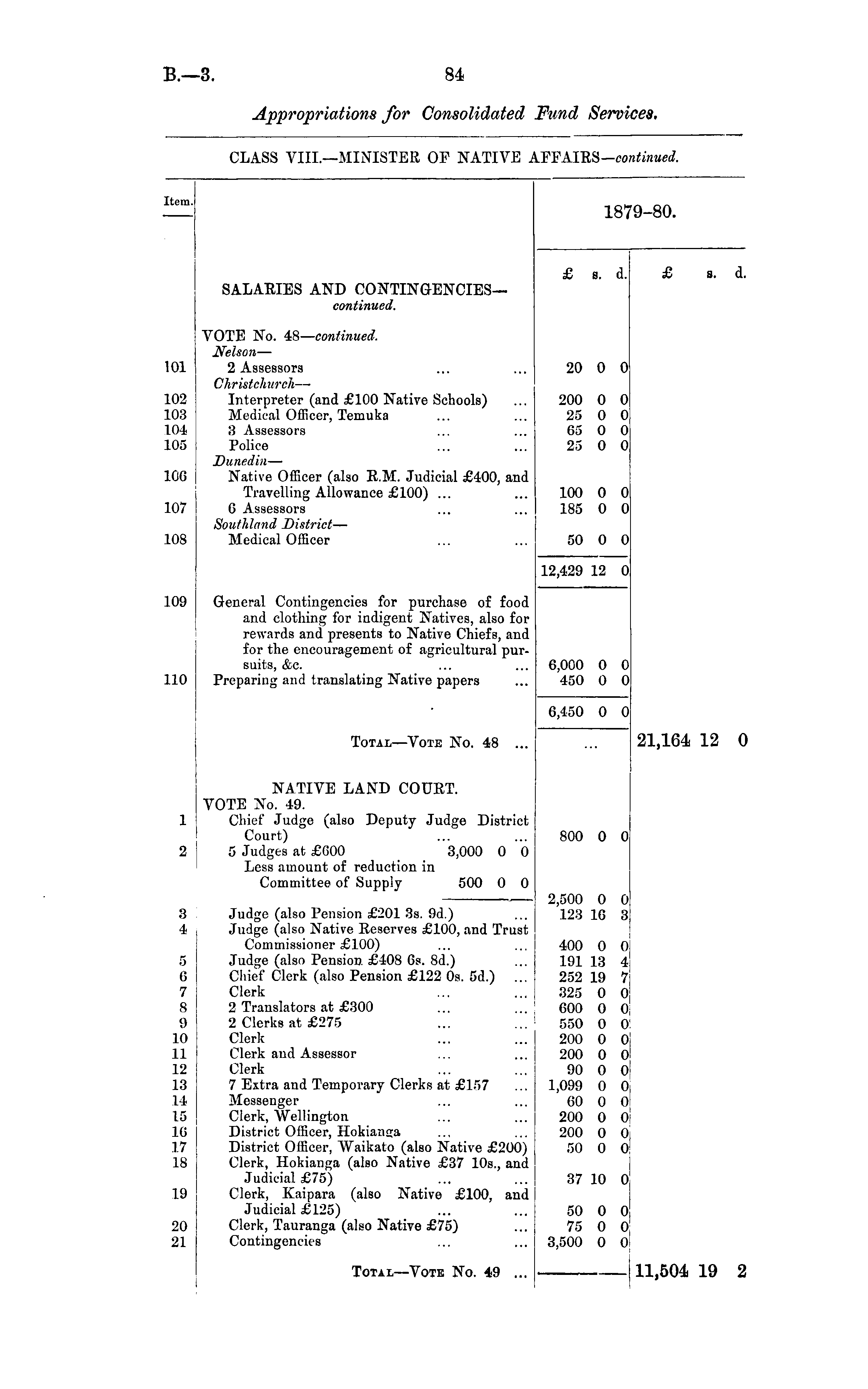 Appropriations for Consolidated Fund Services, CLASS VIII.—MINISTER OP NATIVE FFAIRS— continued. Item. 18 9-80. £ s. d. £ a. d. SALARIES AND CONTINGENCIES— continued. 101 102 103 104 105 01 .02 ; .03 .04 .05 I .06 .07 .08 VOTE No. 48— continued. Nelson — 2 Assessors Christchurch — Interpreter (and £100 Native Schools) Medical Officer, Temuka 3 Assessors Police Dunedin — Native Officer (also E.M. Judicial £400, and Travelling Allowance £100) ... 6 Assessors Southland District — Medical Officer 20 200 25 65 25 0 0 0 0 0 0 0 0 0 0 106 100 185 0 0 0 0 107 108 50 0 0 09 .10 General Contingencies for purchase of food and clothing for indigent Natives, also for rewards and presents to Native Chiefs, and for the encouragement of agricultural pursuits, <fec. Preparing and translating Native papers 12,429 12 0 109 6,000 450 0 0 0 o 110 6,450 0 0 Total—Vote No. 48 ... 21,164 12 0 i! 2 l NATIVE LAND COURT. VOTE No. 49. Chief Judge (also Deputy Judge District Court) 5 Judges at £GO0 3,000 0 0 Less amount of reduction in Committee of Supply 500 0 0 800 0 0 ■i 2,500 0 123 16 0 3 8 4 5 6 7 8 9 10 11 12 13 14 15 1G 17 18 19 20 21 Judge (also Pension £201 3s. 9d.) Judge (also Native Reserves £100, and Trust Commissioner £100) Judge (also Pension £408 6s. 8d.) Chief Clerk (also Pension £122 0s. 5d.) ... Clerk 2 Translators at £300 2 Clerks at £275 Clerk Clerk and Assessor Clerk 7 Extra and Temporary Clerks at £157 Messenger Clerk, Wellington District Officer, Hokianca District Officer, Waikato (also Native £200) Clerk, Hokianga (also Native £37 10s., and Judicial £75) Clerk, Kaipara (also Native £100, and Judicial £125) Clerk, Tauranga (also Native £75) Contingencies 400 0 191 13 252 19 325 0 600 0 550 0 200 0 200 0 90 0 1,099 0 60 0 200 0 200 O 50 0 0 4 7 0 0 0 x 0 o ;: s 37 10 o 50 0 75 0 3,500 0 o o 0 Total —Vote No. 49 ... 11,504 19 2