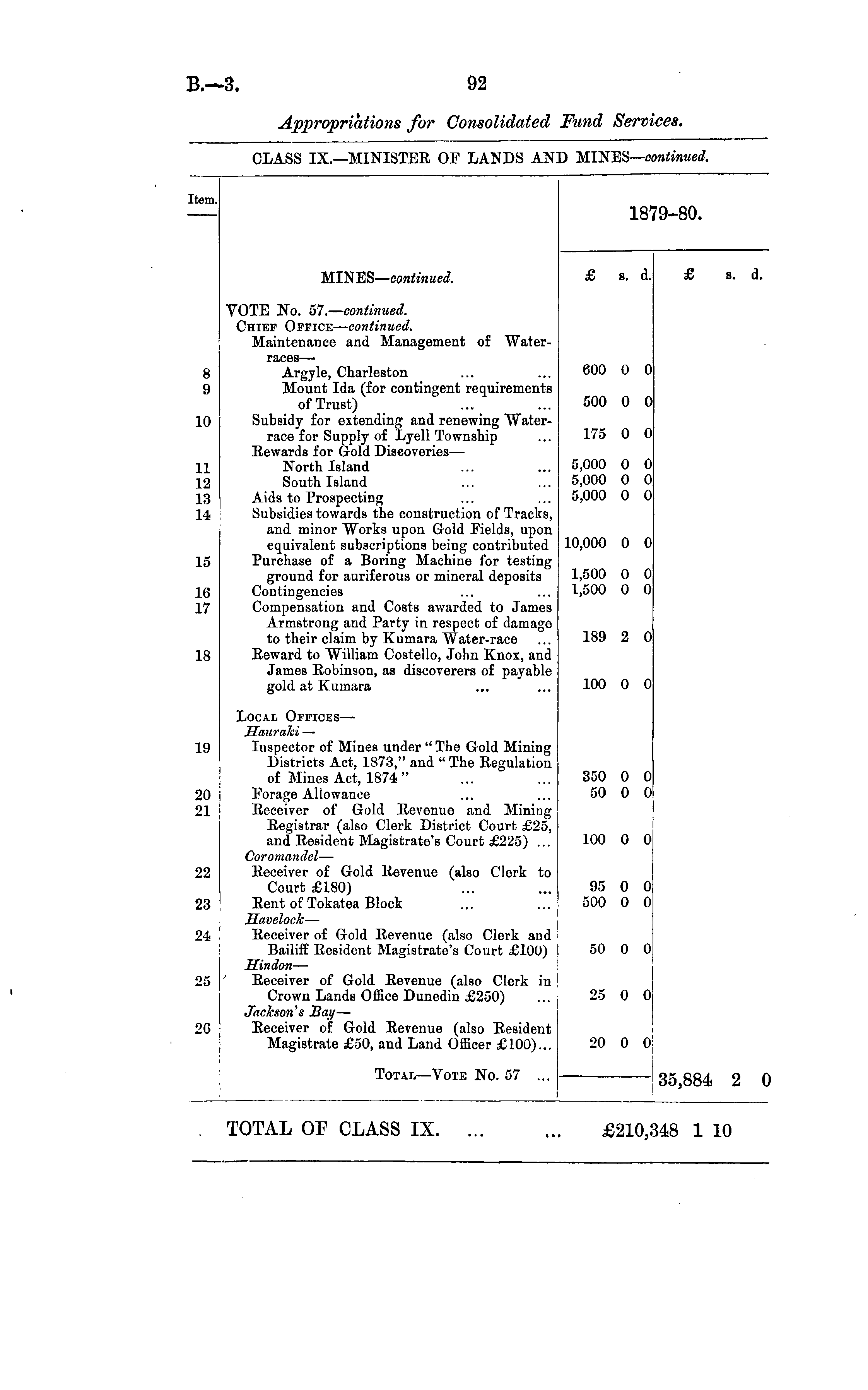 Appropriations for Consolidated 'kind Services. CLASS IX.—MINISTER OF LANDS AN MINES — continued. Item. 18 1 9-80. MINIS— continued. VOTE No. 57 .—continued. Chief Office — continued. Maintenance and Management of Water- £ s. d. £ s. d. races— Argyle, Charleston Mount Ida (for contingent requirements of Trust) Subsidy for extending and renewing Waterrace for Supply of Lyell Township Eewards for Gold Discoveries— North Island South Island Aids to Prospecting Subsidies towards the construction of Tracks, and minor Works upon Gold Fields, upon equivalent subscriptions being contributed Purchase of a Boring Machine for testing ground for auriferous or mineral deposits Contingencies Compensation and Costs awarded to James Armstrong and Party in respect of damage to their claim by Kumara Water-race Eeward to William Costello, John Knox, and James Robinson, as discoverers of payable gold at Kumara 600 0 0 8 9 500 0 0 10 175 0 0 11 12 l:: 14 5,000 5,000 5,000 0 0 0 0 0 0 10,000 0 0 15 1,500 1,500 0 0 0 0 L6 17 189 2 0 IS 100 0 0 10 20 21 22 Local Offices— Hauraki — Inspector of Mines under " The Gold Mining Districts Act, 1873," and " The Regulation of Mines Act, 1874 " Forage Allowance Receiver of Gold Revenue and Mining Registrar (also Clerk District Court £25, and Resident Magistrate's Court £225) ... Coromandel — Receiver of Gold Revenue (also Clerk to Court £180) Rent of Tokatea Block Havelock — Receiver of Gold Revenue (also Clerk and Bailiff Resident Magistrate's Court £100) Sin don — Receiver of Gold Revenue (also Clerk in Crown Lands Office Dunedin £250) Jackson's Bay — Receiver of Gold Revenue (also Resident Magistrate £50, and Land Officer £100)... 350 50 100 95 500 0 0 0 0 0 0 0 0 0 0 23 21 50 0 0 25 25 0 0 26 20 0 0 Total —Vote No. 57 ... 14 2 0 TOTAL OP CLASS IX. £210,348 1 10