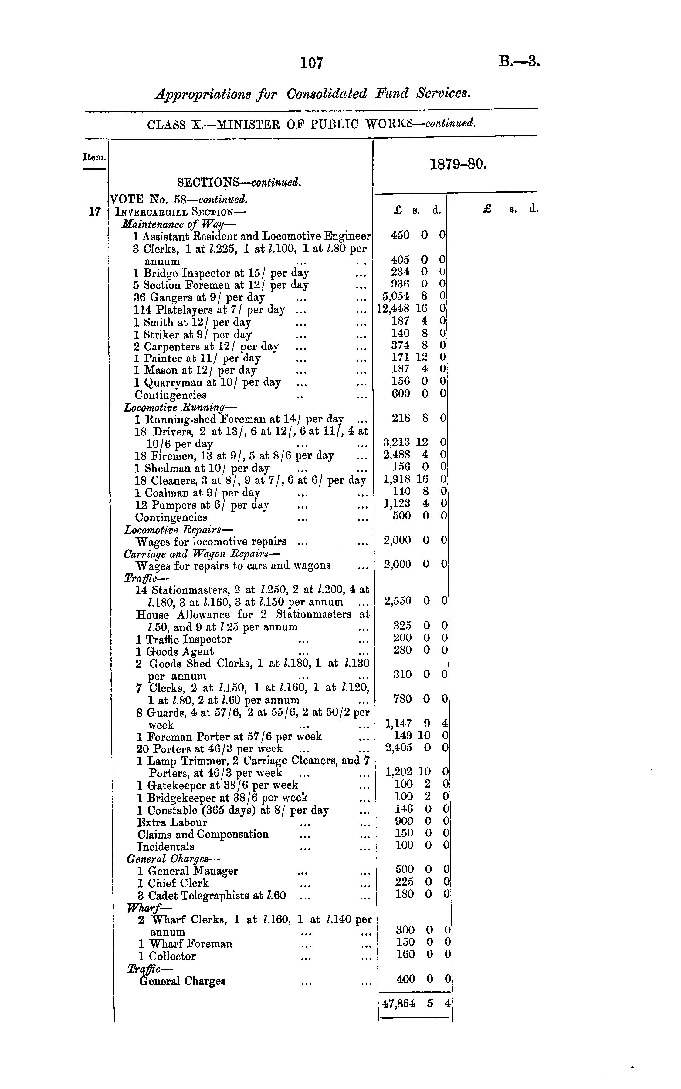 Appropriations for Consolidated \md Services. CLASS X.—MINISTER OF PUBLIC ORES — continued. Item. 1879-80. SE CTIONS— continue d. 17 YOTE No. 58— continued. Intebcabgill Section — Maintenance of Way — 1 Assistant Eesident and Locomotive Engineer 3 Clerks, 1 at Z.225, 1 at Z.100, 1 at Z.8O per annum 1 Bridge Inspector at 15/ per day 5 Section Foremen at 12 / per day 36 Gangers at 9/ per day 114 Platelayers at 7/ per day ... 1 Smith at 12/per day 1 Striker at 9/ per day 2 Carpenters at 12/ per day 1 Painter at 11/ per day 1 Mason at 12/ per day 1 Quarryman at 10/ per day Contingencies Locomotive Running — 1 Running-shed Foreman at 14/ per day ... 18 Drivers, 2 at 13/, 6 at 12/, 6 at 11/, 4 at 10/6 per day 18 Firemen, 13 at 9/, 5 at 8/6 per day 1 Shedman at 10/ per day 18 Cleaners, 3 at 8/, 9 at 7/, 6 at 6/ per day 1 Coalman at 9/per day 12 Pumpers at 6/ per day Contingencies Locomotive Repairs — Wages for locomotive repairs ... Carriage and Wagon Repairs — Wages for repairs to cars and wagons Traffic— 14 Stationmasters, 2 at Z.250, 2 at Z.200, 4 at Z.180, 3 at Z.160, 3 at Z.150 per annum ... House Allowance for 2 Stationmasters at 1.50, and 9 at Z.25 per annum 1 Traffic Inspector 1 Goods Agent 2 Goods Shed Clerks, 1 at Z.180, 1 at Z.130 £ s. d. 450 0 0 405 0 0 234 0 0 936 0 0 5,054 8 0 12,448 16 0 187 4 0 140 8 0 374 8 0 171 12 0 187 4 0 156 0 0 600 0 0 218 8 0 3,213 12 0 2,488 4 0 156 0 0 1,918 16 0 140 8 0 1,123 4 0 500 0 0 £ a. d, 2,000 0 0 2,000 0 0 2,550 0 0 325 0 0 200 0 0 280 0 0 per annum 7 Clerks, 2 at Z.150, 1 at Z.160, 1 at Z.120, 1 at Z.80, 2 at Z.60 per annum 8 Guards, 4 at 57/6, 2 at 55/6, 2 at 50/2 per week 1 Foreman Porter at 57/6 per week 20 Porters at 46/3 per week 1 Lamp Trimmer, 2 Carriage Cleaners, and 7 Porters, at 46/3 per week 1 Gatekeeper at 38/6 per week 1 Bridgekeeper at 3S/6 per week 1 Constable (365 days) at 8/ per day Extra Labour Claims and Compensation Incidentals General Charges — 1 General Manager 1 Chief Clerk 3 Cadet Telegraphists at Z.60 ... Wliarf— 2 Wharf Clerks, 1 at Z.160, 1 at Z.140 per 310 0 0 780 0 0 1,117 9 4 149 10 0 2,405 0 0 1,202 10 0 100 2 0 100 2 0 146 0 0 900 0 0 150 0 0 100 0 0 500 0 0 225 0 0 180 0 0 annum 1 Wharf Foreman 1 Collector Traffic— General Charges 300 0 0 150 0 0 160 0 0 400 0 0 47,864 5 4