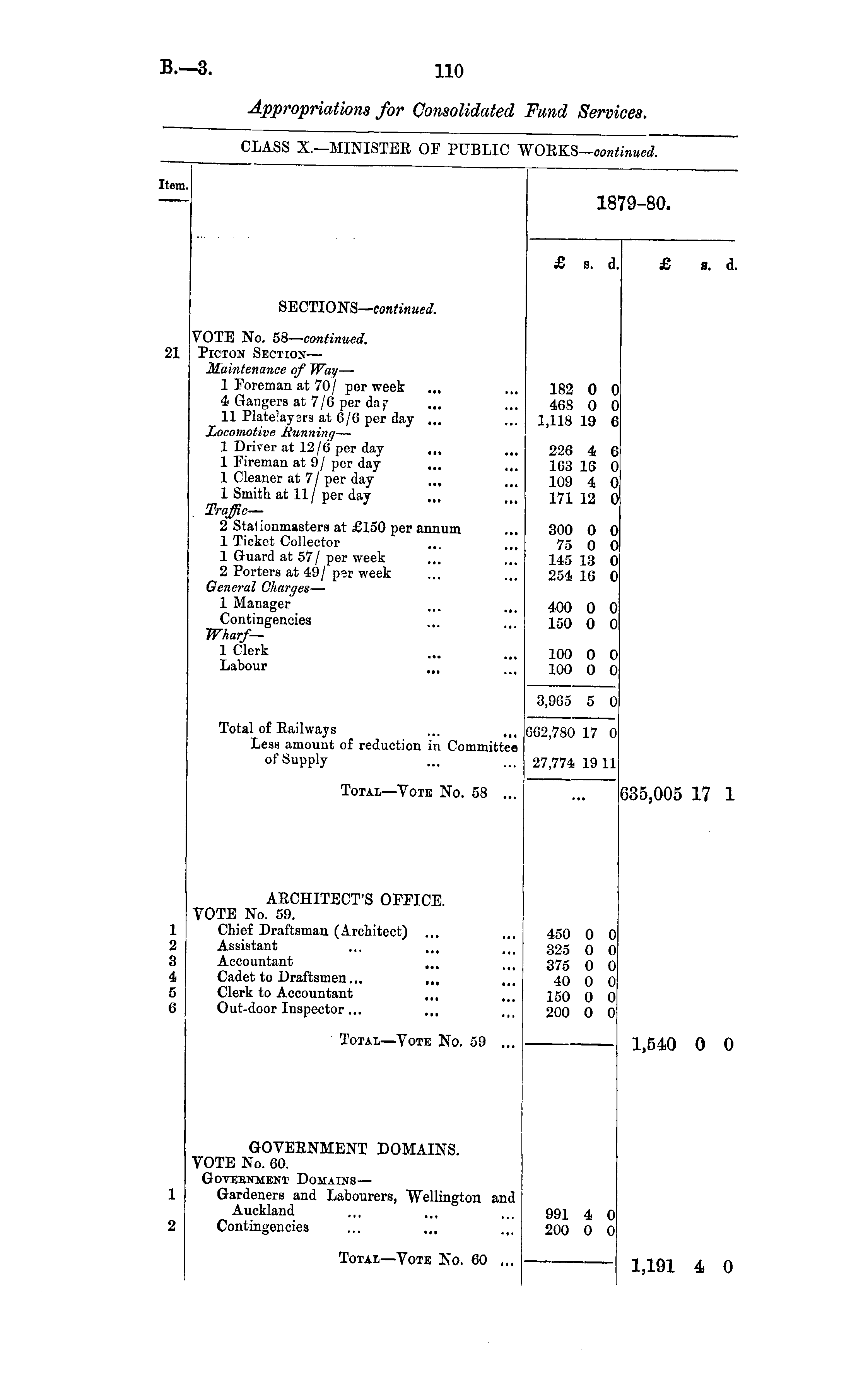 Appropriations for Consolidated Fund Services. CLASS X.—MINISTER OF PUBLIC WOUKS—continued. Item 1879-80. 21 SECTIONS— continued. VOTE No. 58—continued. Picton Section— Maintenance of Way — I Foreman at 70/ per week 4 Gangers at 7/6 per dap II Platelayers at 6/6 per day ... ... Locomotive Stunning — 1 Driver at 12/6 per day ... 1 Fireman at 9/ per day 1 Cleaner at 7/ per day 1 Smith at 11/ per day Traffic— 2 Stalionmastera at £150 per annum 1 Ticket Collector 1 Guard at 57/ per week 2 Porters at 49/ p?r week ... ,,| General Charges — 1 Manager Contingencies Wharf— 1 Clerk Labour M1 (i< 182 0 0 468 0 0 1,118 19 C £ B. d. £ s. d. 226 4 6 163 16 0 109 4 0 171 12 0 300 0 0 75 0 0 145 13 0 254 16 0 635,005 17 1 400 0 0 150 0 0 100 0 0 100 0 0 Total of Eailways Less amount of reduction in Committee of Supply 3,965 5 0 662,780 17 0 27,774 19 11 Total—Vote No. 58 ... 1 2 8 4 5 G AECHITECT'S OFFICE VOTE No. 59. Chief Draftsman (Architect) ... Assistant Accountant ... Cadet to Draftsmen... ... Clerk to Accountant ... Out-door Inspector... 450 325 375 40 150 200 0 0 0 0 0 0 0 0 0 0 0 0 1,540 0 0 Totai—Vote No. 59 ... GOVEENMENT DOMAINS. VOTE No. 60. GOVEBNMENT DOMAINS— Gardeners and Labourers, Wellington and Auckland Contingencies 1,191 4 0 1 2 991 4 0 200 0 0 Totai—Vote No. 60 ...