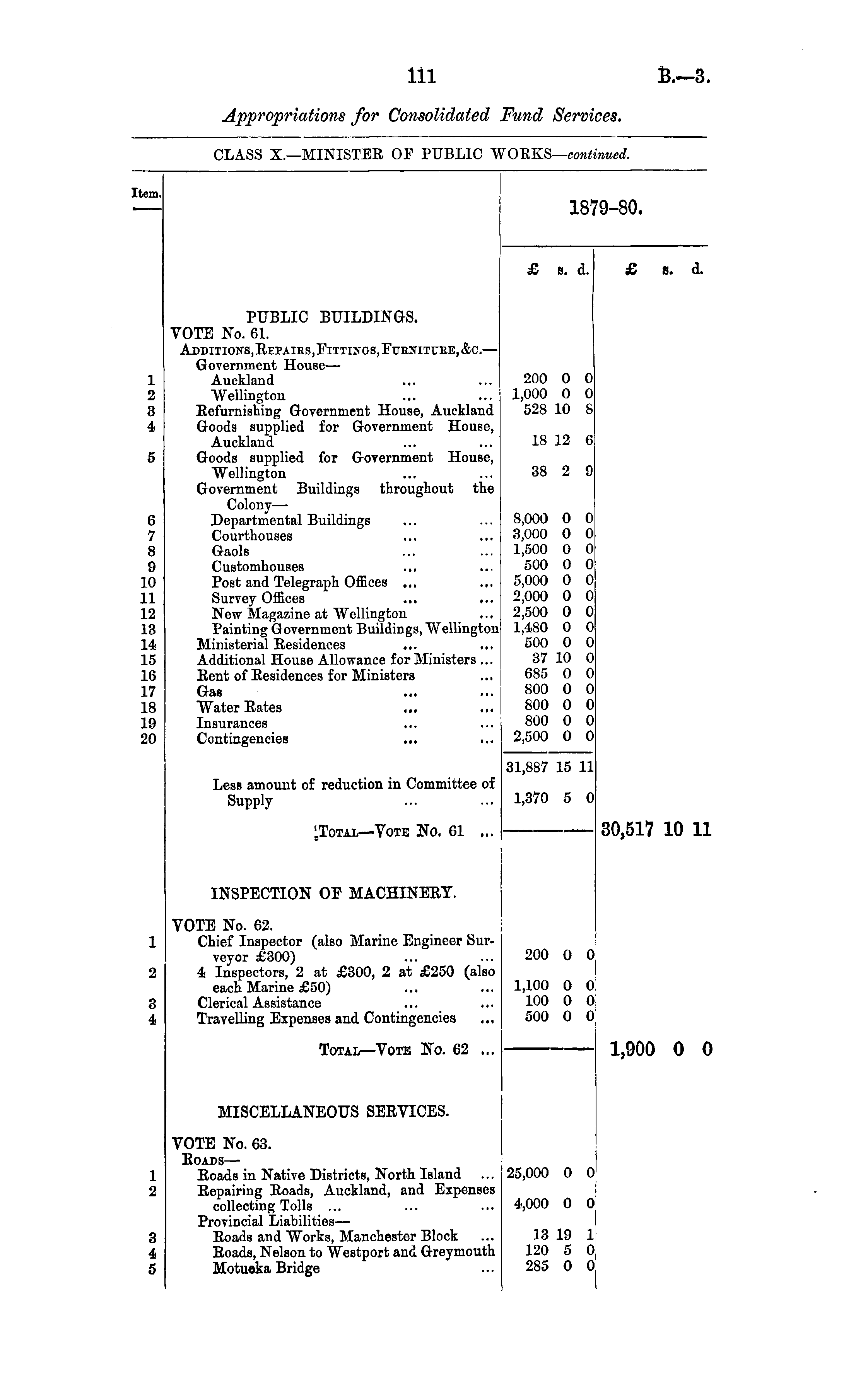Appropriations for Consolidated Fund Services. CLASS X.—MINISTER OF PUBLIC OEKS — continued. Item. 18 9-80. £ b. d. £ 8. d. 6 7 8 9 10 11 12 18 11 15 16 17 IS 19 20 1 2 8 4 5 PUBLIC BUILDINGS. VOTE No. 61. Ai>ditioijs,Repaies,Fitti:ngs,Fitr:nituee,&c.— Government House— Auckland "Wellington Refurnishing Government House, Auckland Goods supplied for Government House, Auckland Goods supplied for Government House, "Wellington Government Buildings throughout the Colony — Departmental Buildings Courthouses Gaols Customhouses Post and Telegraph Offices ... Survey Offices New Magazine at "Wellington Painting Government Buildings, "Wellington Ministerial Residences ... ... Additional House Allowance for Ministers ... Rent of Residences for Ministers Gas Water Rates ... Insurances Contingencies ... ... 200 0 0 1,000 0 0 528 10 S 18 12 6 38 2 9 8,000 0 0 3,000 0 0 1,500 0 0 500 0 0 5,000 0 0 2,000 0 0 2,500 0 0 1,480 0 0 500 0 0 37 10 0 685 0 0 800 0 0 800 0 0 800 0 0 2,500 0 0 Less amount of reduction in Committee of Supply 31,887 15 11 1,370 5 0 jTotal—Vote No. 61 ... 30,517 10 11 INSPECTION OF MACHINERY. 1 a VOTE No. 62. Chief Inspector (also Marine Engineer Surveyor £300) 4- Inspectors, 2 at £300, 2 at £250 (also each Marine £50) Clerical Assistance Travelling Expenses and Contingencies ... 200 1,100 100 500 0 0 0 0 0 0 0 0 1,900 0 0 3 •1 Total—Vote No. 62 ... MISCELLANEOUS SERVICES. 1 2 VOTE No. 63. Roads— Roads in Native Districts, North Island Repairing Roads, Auckland, and Expenses collecting Tolls ... Provincial Liabilities— Roads and "Works, Manchester Block Roads, Nelson to Westport and Greymouth Motueka Bridge 25,000 0 4,000 0 0 0 3 4 5 13 19 120 5 285 0 1 o o