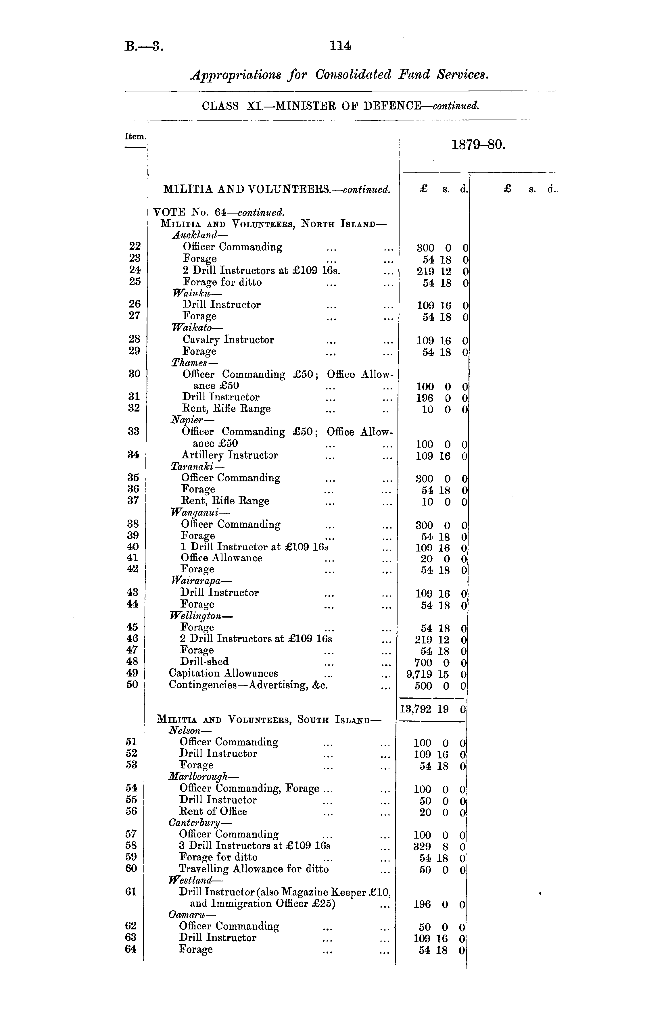 Appropriations for Consolidated hmd Services. CLASS XL—MINISTER OF DEFE CE — continued. Item. 18 9-80. MILITIA AND VOLUNTEEES.— continued. £ 8. d. £ 8. d 22 23 24 25 26 27 28 29 30 31 32 33 34 VOTE No. 64— continued. Militia and Volunteers, Nobth Island— Auckland — Officer Commanding Forage 2 Drill Instructors at £109 16s. Forage for ditto JVaiuku — Drill Instructor Forage Waikato — Cavalry Instructor Forage Thames — Officer Commanding £50; Office Allowance £50 Drill Instructor ltent, Rifle Range Napier — Officer Commanding £50; Office Allowance £50 Artillery Instructor Taranaki — Officer Commanding Forage Rent, Rifle Range Wanganui — Officer Commanding Forage 1 Drill Instructor at £109 16s Office Allowance Forage Wairarapa — Drill Instructor Forage Wellington — Forage 2 Drill Instructors at £109 16s Forage Drill-shed Capitation Allowances Contingencies—Advertising, &c. 300 0 54 18 219 12 54 18 109 16 54 18 109 16 54 18 100 0 196 0 10 0 100 0 109 16 0 0 0 0 0 0 0 0 0 0 0 0 0 35 36 37 300 0 54 18 10 0 0 0 0 38 39 40 41 42 300 0 54 18 109 16 20 0 54 18 0 0 0 0 0 43 44 109 16 54 18 0 0 45 46 47 48 49 50 54 18 219 12 54 18 700 0 9,719 15 500 0 0 0 0 0 0 0 51 52 5S 54 55 56 Militia and Volunteers, South Island — Nelson — Officer Commanding Drill Instructor Forage Marlborough — Officer Commanding, Forage ... Drill Instructor Rent of Office Canterbury — Officer Commanding 3 Drill Instructors at £109 16s Forage for ditto Travelling Allowance for ditto Westland — Drill Instructor (also Magazine Keeper £10, and Immigration Officer £25) 13,792 19 100 0 109 16 54 18 100 0 50 0 20 0 0 0 o 0 0 0 (t 57 58 59 80 100 0 329 8 54 18 50 0 I 0 0! «1 196 0 0 «2 64 Oamaru — Officer Commanding Drill Instructor Forage 50 0 109 16 54 18 0 0 0
