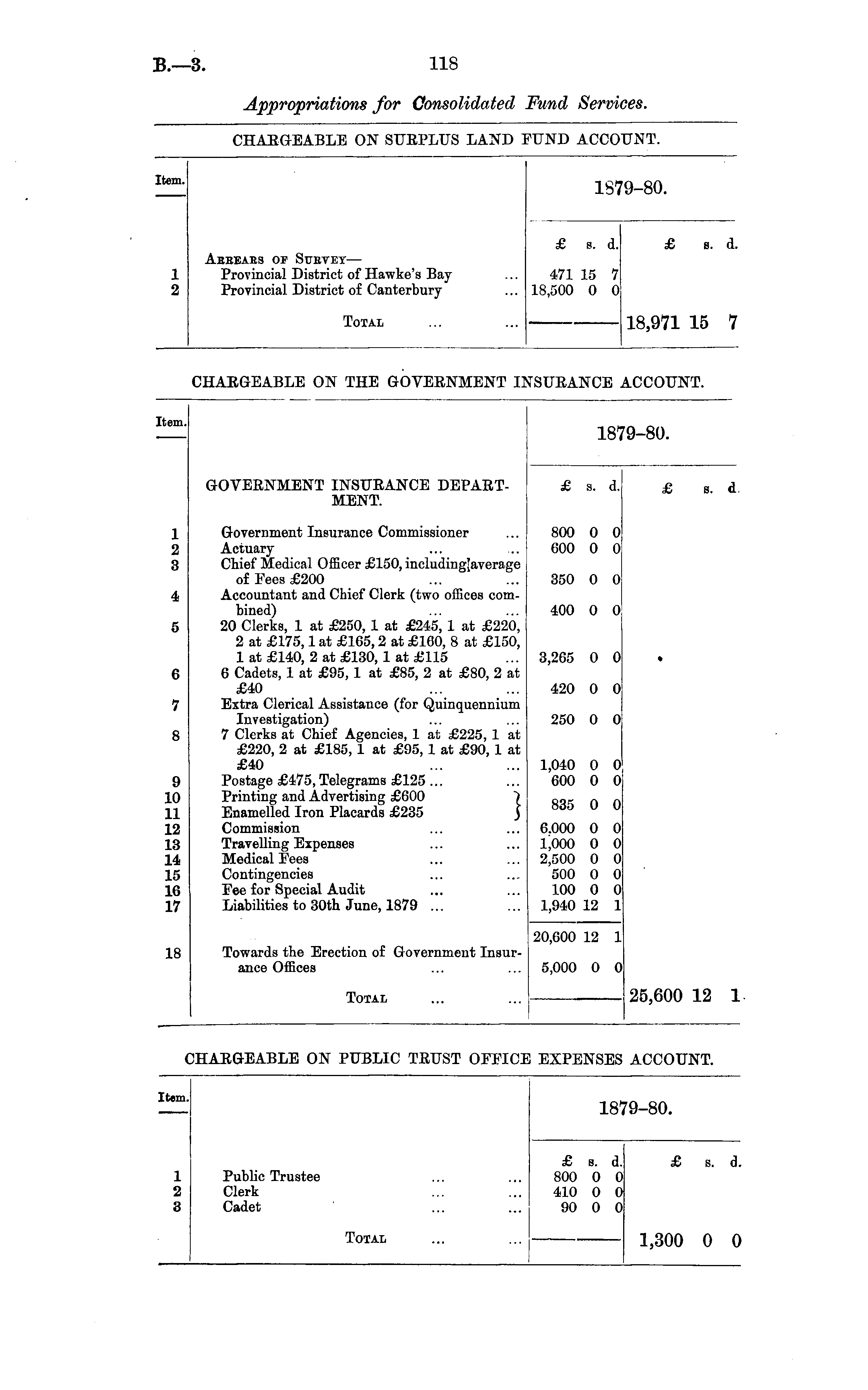 Item. 18' 9-80. Aebeaes of Stjetet— Provincial District of Hawke's BayProvincial District of Canterbury £ s. d. 471 15 7 18,500 0 0 £ s. d. 1 2 18,971 15 7 Total CHAEGEABLE ON THE GOVERNMENT I SURANCE ACCOUNT. item. 18' 9-80. GOVERNMENT INSURANCE DEPARTMENT. £ s. d. £ 8. d 1 2 B Government Insurance Commissioner Actuary Chief Medical Officer £150, including'average of Fees £200 Accountant and Chief Clerk (two offices combined) 20 Clerks, 1 at £250, 1 at £245, 1 at £220, 2 at £175,1 at £165,2 at £160, 8 at £150, 1 at £140, 2 at £130, 1 at £115 6 Cadets, 1 at £95, 1 at £85, 2 at £80, 2 at £40 Extra Clerical Assistance (for Quinquennium Investigation) 7 Clerks at Chief Agencies, 1 at £225, 1 at £220, 2 at £185, 1 at £95, 1 at £90, 1 at £40 Postage £475, Telegrams £125 ... Printing and Advertising £600 7 Enamelled Iron Placards £235 ) Commission Travelling Expenses Medical Fees Contingencies Fee for Special Audit Liabilities to 30th June, 1879 ... 800 0 0 600 0 0 350 0 0 4 400 0 0 5 3,265 0 0 0 420 0 0 7 250 0 0 S 1,040 0 0 600 0 0 9 10 11 12 13 11 15 10 17 835 0 0 6.000 0 0 1,000 0 0 2,500 0 0 500 0 0 100 0 0 1,940 12 1 is Towards the Erection of Q overnment Insurance Offices 20,600 12 5,000 0 L 0 Total 25,600 12