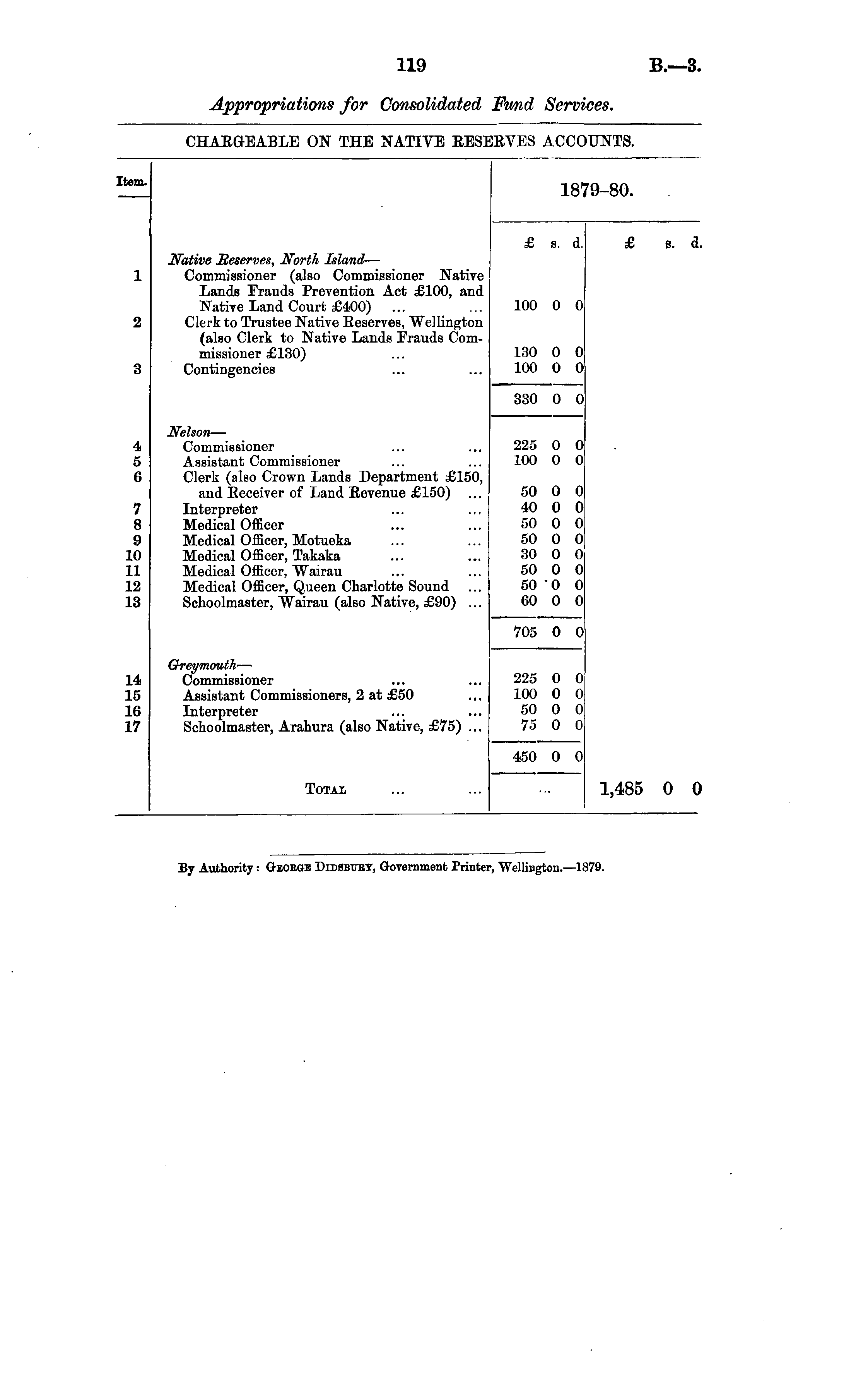 item. 18 9-80. Native Reserves, North Island — Commissioner (also Commissioner Native Lands Frauds Prevention Act £100, and Native Land Court £400) ... Clerk to Trustee Native Eeserves, Wellington (also Clerk to Native Lands Frauds Commissioner £130) Contingencies £ 100 s. d. 0 0 £ ft. d. 130 100 0 0 0 0 330 0 4 5 e 7 8 9 10 11 12 13 Nelson — Commissioner Assistant Commissioner Clerk (also Crown Lands Department £150, and Eeceiver of Land Revenue £150) ... Interpreter Medical Officer Medical Officer, Motueka Medical Officer, Takaka Medical Officer, Wairau Medical Officer, Queen Charlotte Sound Schoolmaster, Wairau (also Native, £90) ... 225 0 100 0 50 0 40 0 50 0 50 0 30 0 50 0 50 "0 60 0 0 0 0 0 0 0 0 0 0 0 14 15 16 17 Qreymouth — Commissioner Assistant Commissioners, 2 at £50 Interpreter Schoolmaster, Arahura (also Native, £75) ... 705 225 100 50 75 0 0 0 0 0 0 0 0 0 0 1,485 0 0 450 0 0 Total Authorit- : Geoege DiDSBtTBY, Government Printer, Wellin| -ton.—1879.