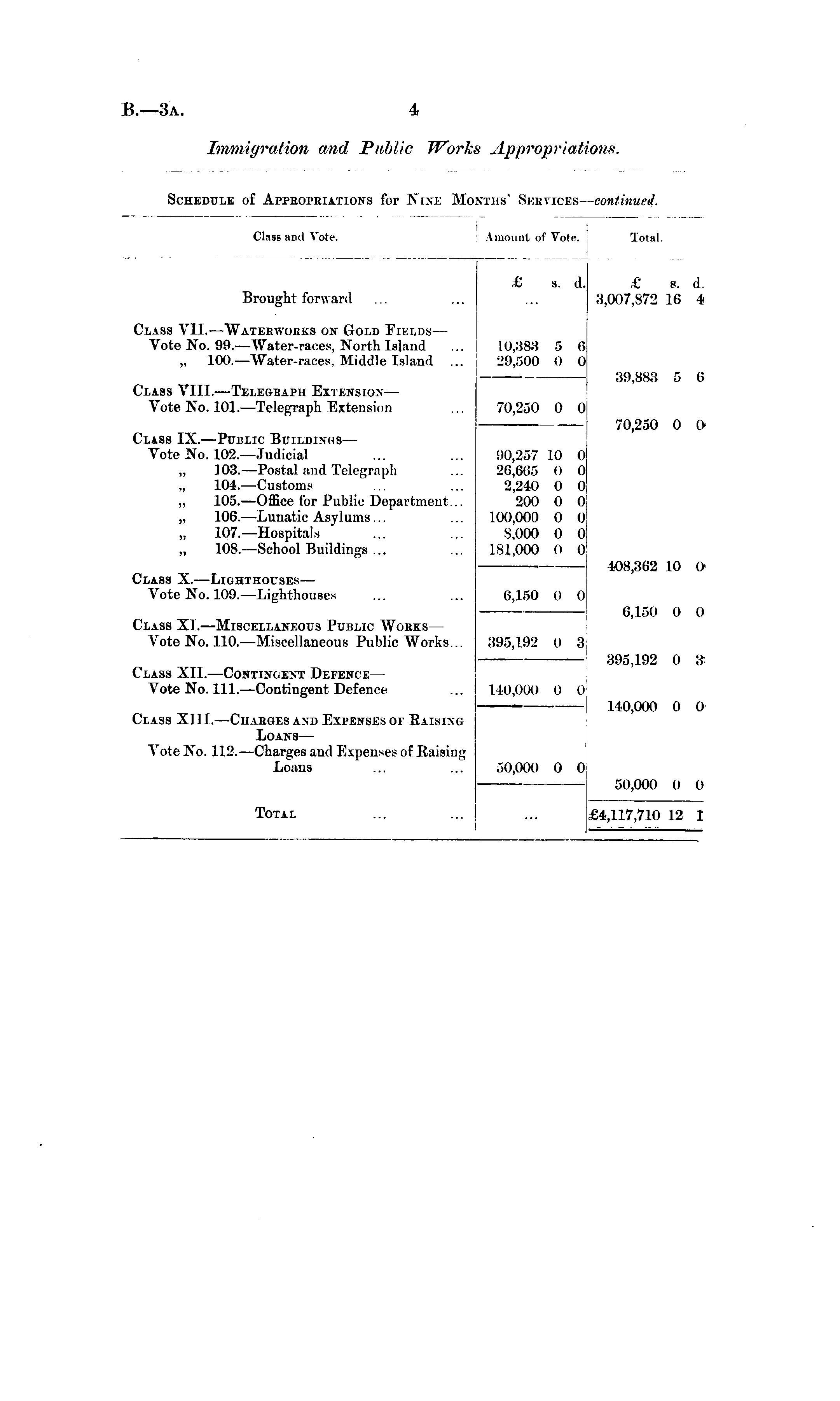 Schedule of Appbopkiations for Nine Mi (. NTHS' SkkvtcES■continued. Class and Tote. A mount of Vote. Total. Brought forward £ s. d. £ s. d. 8,007,872 lfi 4 Class VII.—Waterworks on Gold Fields — Vote No. 9f».—Water-races, North Island „ 100.—-Water-races. Middle Island ... 10,383 5 6 29,500 0 0 39,888 5 6 Class VIII.—Telegbaph Extension— Vote No. 101. —Telegraph Extension Class IX. —Public Buildings— Vote No. 102.—Judicial ]03.—Postal and Telegraph „ 104. —Customs „ 105.—Office for Public Department... ,, 106.—Lunatic Asylums... „ 107.—Hospitals 108.—School Buildings ... 70,250 0 O 70,250 0 O !>0,257 10 26,605 0 2,240 0 200 0 100,000 0 8,000 0 181,000 0 0 0 0 0 0 0 0 408,362 10 O Class X. —Lighthouses— Vote No. 109.—Lighthouses Class XL—Miscellaneous Public Wobks — Vote No. 110. —Miscellaneous Public Works... 6,150 0 0 6,160 0 0 Class XII.—Contingent Defence — Vote No. 111.—Contingent Defence 895,192 0 3 395,192 0 9 Class XIII.—Cuabges axd Expenses of Raising Loans — Vote No. 112.—Charges and Expenses of Raising Loans 140,000 0 0; 140,000 0 0 50,000 0 0 50,000 0 0 Total £4,117,710 12 1