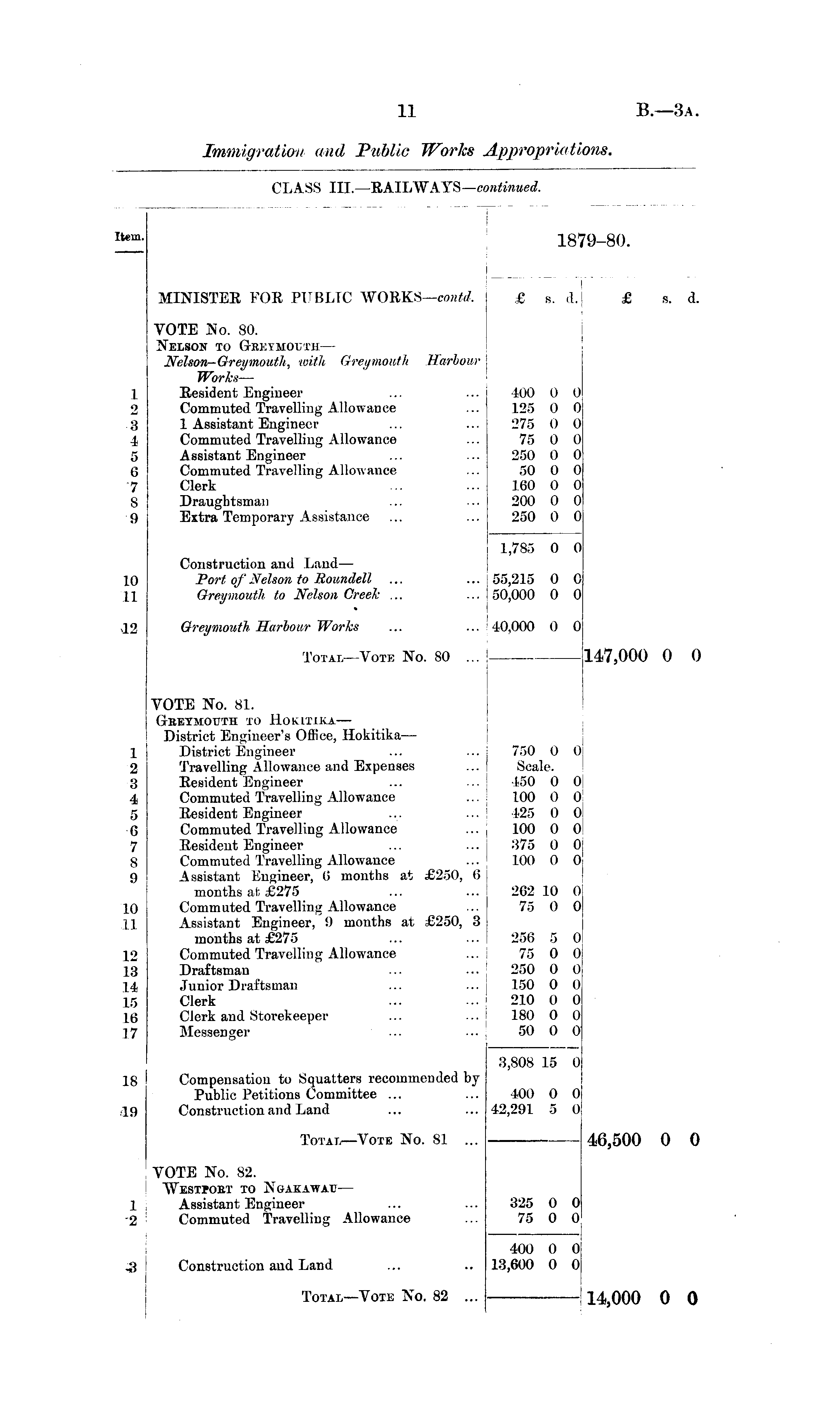 CLASS III.—RAILWAYS— a mtinued. Item. 187 79-80. MINISTER FOR PFBLTC WORKS— contd, VOTE No. 80. Nelson to Gtrkymolth— Nelson-Greymoutli, with Greymoulh Harbour Works — Resident Engineer Commuted Travelling Allowance 1 Assistant Engineer Commuted Travelling Allowance Assistant Engineer Commuted Travelling Allowance, Clerk Draughtsman Extra Temporary Assistance £ s. a. £ s. a. 1 • > 3 4 5 6 7 8 9 400 0 0 125 0 0 275 0 0 75 0 0 250 0 0 50 0 0 160 0 0 200 0 0 250 0 0 1,785 0 0 55,215 0 0 i i i i i i i i i i Construction and Land — Port of Nelson to lioundell Grey mouth to Nelson Creek ... 1,785 55,215 50,000 0 0 0 0 0 0 10 11 so'ooo o o 40,000 0 0 750 0 0 Scale. 450 0 0! 100 0 0 425 0 0 100 0 0! 375 0 0 100 0 0 262 10 0 i i 147,000 I 'I il 0 o • 12 Greymonth Harbour Works 40,000 0 0 Total—Vote No. 80 ... 1 2 3 I: 5 6 7 8 9 VOTE No. 81. GrREYMOUTH TO HoKlTIKA — District Engineer's Office, Hokitika — District Engineer Travelling Allowance and Expenses Resident Engineer Commuted Travelling Allowance Resident Engineer Commuted Travelling Allowance Resident Engineer Commuted Travelling Allowance Assistant Engineer, (i months at £250, 6 months at £275 Commuted Travelling Allowance Assistant Engineer, !) months at £250, 3 months at £275 Commuted Travelling Allowance Draftsman Junior Draftsman Clerk Clerk and Storekeeper Messenger 750 0 Scale. 450 0 100 0 4.25 0 100 0 375 0 100 0 0 0| o 0 o! 0 0 10 11 262 10 75 0 0 0 12 13 14 1.-) it; 17 Compensation to Squatters recommended by Public Petitions Committee ... Construction and Tjand 3,808 15 75 0 0 256 5 0 75 0 0 250 0 0 150 0 0 210 0 0 180 0 0 50 0 0 3,808 15 0 400 0 Ol 42,291 5 0! 325 0 0 75 0 0 256 5 75 0 250 0 150 0 210 0 180 0 50 0 0 o 0 0 0 0 0 0 46,500 0 0 18 400 0 42,291 5 oi 19 Total—Vote No. 81 ... VOTE No. 82. WESTrORT TO NttAKAWATJ — Assistant Engineer Commuted Travelling Allowance 325 75 0 0 0 I) 1 2 Construction aud Land 400 13,600 i a v v 400 0 0 13,600 0 0 0 0 0 0 I 14,000 0 0 Total—Vote No. 82 ...