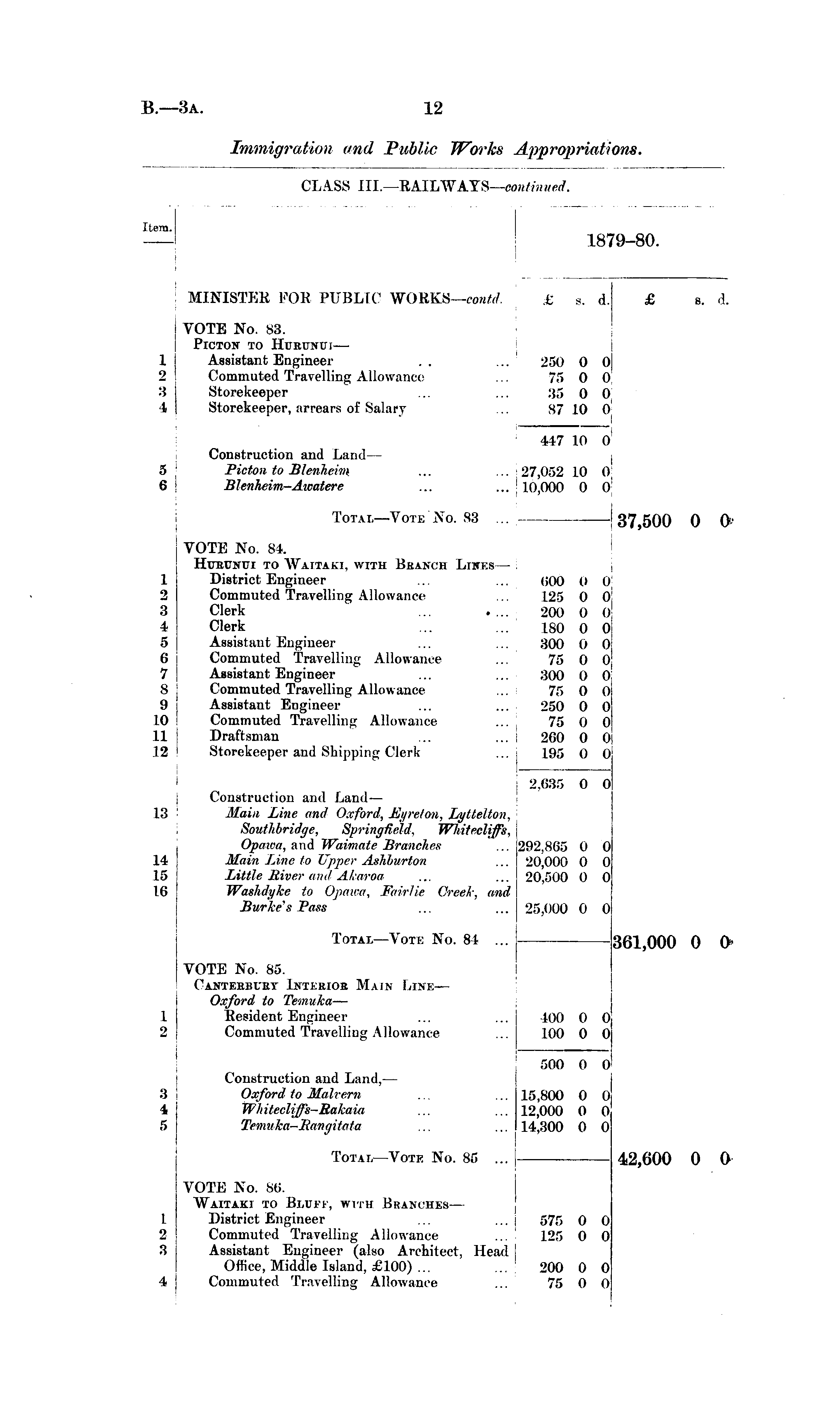 CLASS III.—E AIL WATS— continued. Item. 1879-80. ! MINISTER FOB PUBLIC WORKS— contd. £ s . d. £ s. £ i s. d. I 1 2 :; t VOTE No. S3. PlCTON TO HlTBUNin Assistant Engineer . . ... 250 0 OJ Commuted Travelling Allowance ... 75 0 0, Storekeeper ... ... 35 0 0 Storekeeper, arrears of Salary ... 87 10 0 5 I I I , , 447 10 0 Construction and Land— I Picton to Blenheim ... ...27,052 10 0, Blenheim-Awatere ... ... j 10,000 0 0' Totai,—Vote No. S3 ... . 37 *()0 0 ~ **^ .A 4^ 4f V ~\^ -». » ' A * • *-' » • a V J ■ ( J ■ f ■■ VOTE No. 34. HuBCNn to Waftaki, with Branch Lines — . District Engineer ... ... <;00 O o Commuted Travelling Allowance ... 125 0 Oj Clerk ... . ... 200 0 0 Clerk ... ... 180 0 01 Assistant Engineer ... ... 800 0 ol Commuted Travelling Allowance ... 75 0 oj Assistant Engineer ... ... 300 0 0 Commuted Travelling Allowance ... 75 0 0 Assistant Engineer ... ... 250 0 0 Commuted Travelling Allowance ... 75 0 0 Draftsman ... ... | 260 0 0| Storekeeper and Shipping Clerk ... 195 0 0 I 37,500 s 0 O 1 2 3 4 5 6 7 8 !> 10 11 12 L3 LI L5 Hi I 2,635 0 0 Construction and Land— Main Line and Oxford, Eyreton, Lyttelton, Southbridge, Springfield. Whiteclffi, Opaicti, and Waimate Branches ... 292,865 0 0 Main Line to Upper Aslilmrton ... 20,000 0 0 Little River and Akaroa ... ... 20,500 0 0 Washdyke to Opawa, Fairlie Creek, and Burkes Pass ... ... 25,000 0 0 I 2,635 0 292,865 0 20,000 0 20,500 0 0 0 0 0 I 361,000 I 0 025.000 0 0 Total—Vote No. 84 ... 361,000 0 I VOTE No. 85. Canteebuiiy Interior Main Line— Oxford to Teinuka — Resident Engineer ... ... 400 0 0 Commuted Travelling Allowance 100 0 0 ■ i 1 2 400 100 0 0 3 t 5 500 0 0' Construction and Land, — Oxford to Malrern ... ... 15,800 0 0 Whiteclifs-Rakaia ... ... 12,000 0 0 Teinuka-Rangitnta ... ... 14,300 0 0 500 15,800 12,000 14,300 0 0 0 0 0 I 0 0 I I 42,600 0 0 Total—Vote No. 85 ... 42,600 0 L •_> 3 VOTE No. 86. Waitaki to Bluff, with Branches — District Engineer ... ... | 575 0 0 Commuted Travelling Allowance ... 125 0 0 Assistant Engineer (also Architect, Head j Office, Middle Island, £100) ... ... 200 0 0 Commuted Travelling Allowance ... 75 0 0 575 125 0 0 0 0 4 200 75 0 0 0 0
