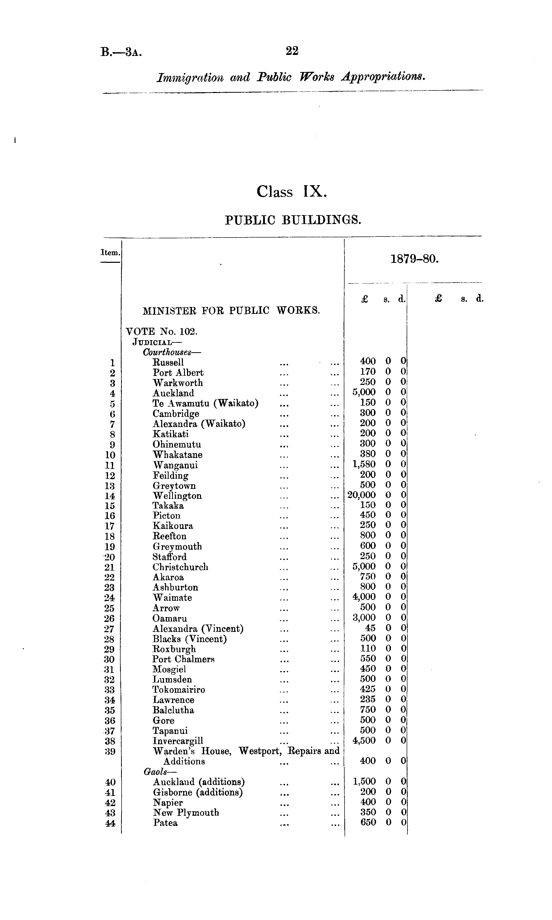tern. 1879-80. MINISTER FOR PUBLIC WORKS. £ s. d. £ s. d, 1 2 3 4 5 0 7 8 9 10 11 12 13 14 15 16 17 18 19 20 21 22 23 24 25 26 27 28 29 30 31 32 33 34 35 36 37 38 39 VOTE No. 102. Judicial — Courthouses — Russell Port Albert Warkworth Auckland Te Awamutu (Waikato) Cambridge Alexandra (Waikato) Katikati Ohinemutu Whakatane Wanganui Feilding Greytown AVellington Takaka Picton Kaikoura Reefton Greymouth Stafford Christchurch Akaroa Ashburton AVaimate Arrow Oamaru Alexandra (Vincent) Blacks (Vincent) Roxburgh Port Chalmers Mosgiel Lumsden Tokomairiro Lawrence Balclutha Gore Tapanui Invercargill Warden's House, Westport, Eepairs and Additions Gaols — Auckland (additions) Gisborne (additions) Napier New Plymouth Patea 400 170 250 5,000 150 300 200 200 300 380 1,580 200 500 20,000 150 450 250 800 000 250 5,000 750 800 4,000 500 3,000 45 500 110 550 450 500 425 235 750 500 500 4,500 0 0 0 0 0 0 0 0 0 0 0 0 0 0 0 0 0 0 0 0 0 0 0 0 0 0 0 0 0 0 0 0 0 0 0 0 0 0 0 0 0 0 0 0 0 0 0 0 0 0 0 0 0 0 0 0 0 0 0 0 0 0 0 0 0 0 0 0 0 0 0 0 0 0 0 0 400 0 0 to 41 42 43 14 1,500 200 400 350 650 0 0 0 0 0 0 0 0 0 0
