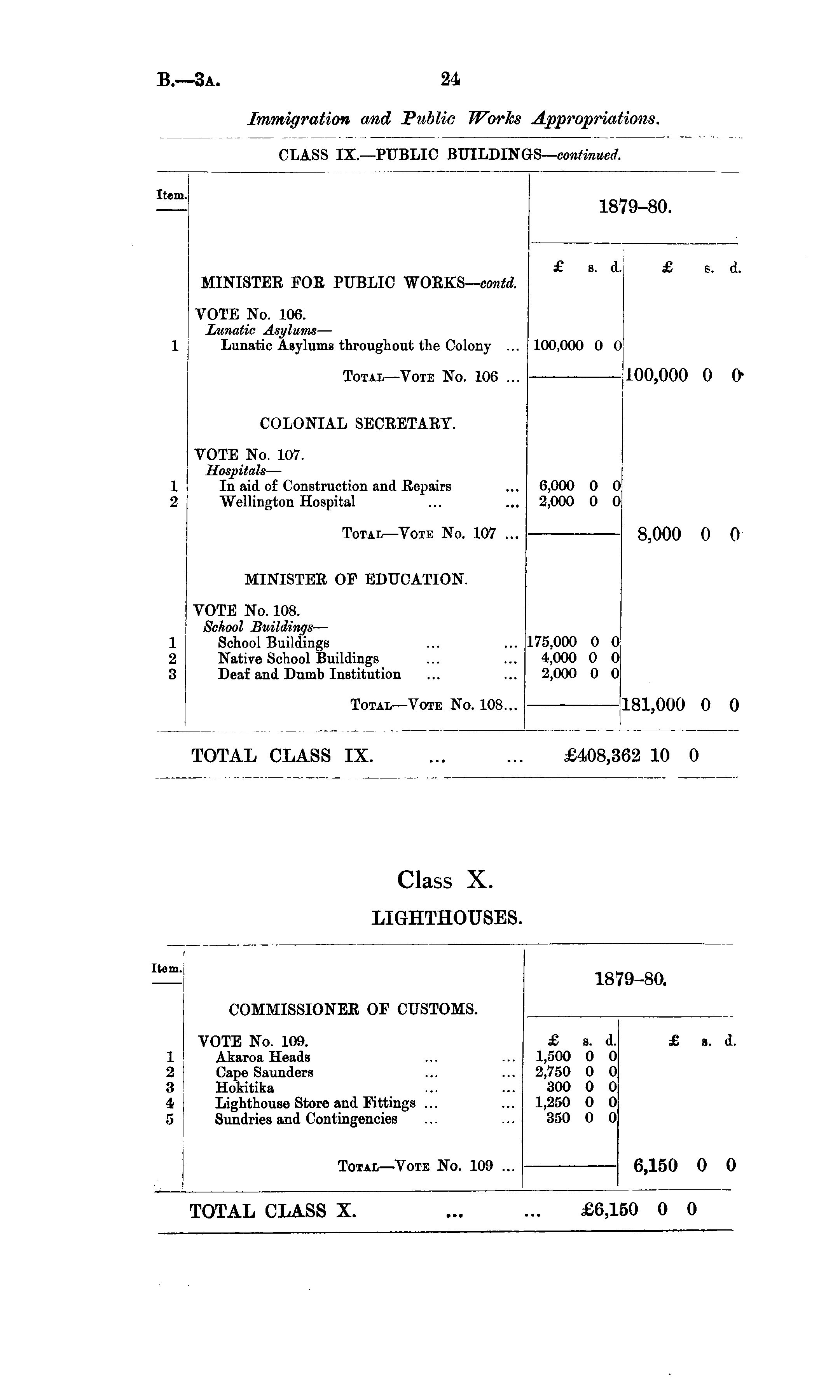 CLASS ■continue^ item. 1879-80. MINISTER FOR PUBLIC WORKS— contd. £ s. d. £ s. d. VOTE No. 106. Lunatic Asylums — Lunatic Asylums throughout the Colony ... 1( 100,000 0 0 00,000 0 0 100,000 0 0Total—Vote No. 106 ... — 100,00< >0 COLONIAL SECRETARY. VOTE No. 107. Hospitals — In aid of Construction and Repairs ... € Wellington Hospital ... ... 2 6,000 0 0 2,000 0 0 8,000 0 0 1 2 6,000 2,000 0 0 Total—Vote No. 107 ... — 8,000 MINISTER OF EDUCATION. 1 2 3 VOTE No. 108. School Buildings — School Buildings ... ... 171 Native School Buildings ... ... 4 Deaf and Dumb Institution ... ... ' 175,000 0 0 4,000 0 0 2,000 0 0 5,000 0 0 4,000 0 0 2,000 0 0 181,000 0 0 Total—Vote No. 108... — 181,00( ] TOTAL CLASS IX. £408,362 10 0