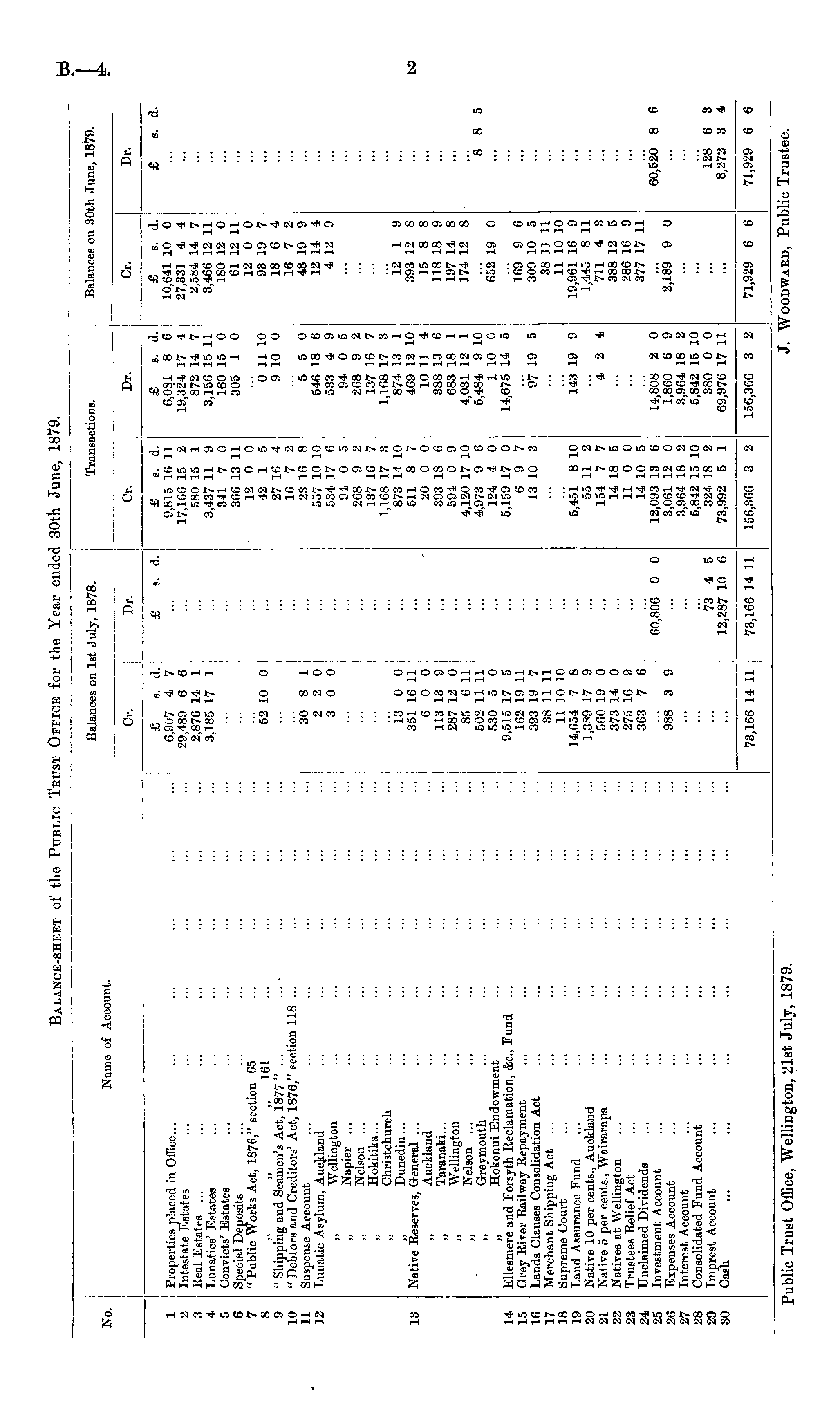 Balances on 1st July, 1878. Transi ctions. Balances on 30th June, 1879. No. Name of Account. Cr. Dr. Cr. Dr. Cr. Dr. 1 4 5 6 7 8 9 10 11 12 18 Properties placed in Office... Intestate Estates Real Estates ... Lunatics' Estates Convicts' Estates Special Deposits " Public Works Act, 1876," section 65 „ 161 " Shipping and Seamen's Act, 1877 " ... ... ■ "Debtors and Creditors' Act, 1876," section 118 ... Suspense Account Lunatic Asylum, Auckland ,, Wellington „ Napier ... „ Nelson ... ,, Hokitika... ,, Christchurch ... " „ Dunedin... Native Reserves, General ... ... - ,, Auckland „ Taranaki... ,, Wellington ,, Nelson ... ,, Greymouth „ Hokonui Endowment Ellesmere and Forsyth Reclamation, &c, Fund Grey River Railway Repayment Lands Clauses Consolidation Act Merchant Shipping Act Supreme Court Land Assurance Fund Native 10 per cents., Auckland Native 5 per cents, Wairarapa Natives at Wellington Trustees Relief Act ... ... Unclaimed Dividends Investment Account Expenses Account Interest Account Consolidated Fund Account Imprest Account Cash £ s. d. | 6,907 4 7 29,489 6 6 2,876 14 1 3,185 17 1 52 10 0 30 8 1 2 2 0 3 0 0 13 0 0 351 16 11 6 0 0 113 13 9 287 12 0 85 6 11 502 11 11 530 5 0 9,515 17 5 162 19 11 393 19 7 38 11 11 11 10 10 14,654 7 8 1,389 17 9 560 19 0 373 14 0 275 16 9 363 7 6 988 3 9 £ 8. d. £ s. d. 9,815 16 11 17,166 15 2 580 15 1 3,-37 11 9 341 7 0 366 13 11 12 0 0 42 1 5 27 16 4 16 7 2 23 16 8 557 10 10 534 17 6 91 0 5 268 9 2 137 16 7 1,168 17 3 873 14 10 511 8 7 20 0 0 393 18 6 594 0 9 4,120 17 10 4,973 9 0 124 4 0 5,159 17 0 6 9 7 13 10 3 £ a. d. 6,081 8 6 19,324 17 4 872 14 7 3,156 15 11 160 15 0 305 1 0 0 11 10 9 10 0 5 5 0 546 18 6 533 4 9 94 0 5 268 9 2 137 16 7 1,168 17 3 874 13 1 469 12 10 10 11 4 388 13 6 683 18 1 4,031 12 1 5,484 9 10 1 10 0 14,675 14 5 £ s. d. 10,641 10 0 27,331 4 4 2,584 14 7 3,466 12 11 180 12 O 61 12 11 12 0 0 93 19 7 18 6 4 16 7 2 48 19 9 12 14 4 4 12 9 12 1 9 393 12 8 15 8 8 118 18 9 197 14 8 174 12 8 £ s. d. 652 19 0 "_ 8 5 14 15 17 is 19 20 21 22 _3 24 25 26 27 28 29 30 5,451 8 10 55 11 2 154 7 7 14 18 5 11 0 0 14 10 5 12,093 13 6 3,061 12 0 3,964 18 2 5,842 15 10 324 18 2 73,992 5 1 97 19 5 143 19 9 169 9 6 309 10 5 38 11 11 11 10 10 19,961 16 9 1,445 8 11 711 4 3 388 12 5 286 16 9 377 17 11 4 2 4 60,806 0 0 14,808 2 0 1,860 6 9 3,964 18 2 5,842 15 10 380 0 0 69,976 17 11 2,189 9 0 60,520 8 6 73 4 5 12,287 10 6 128 6 3 8,272 3 4 73,166 14 11 73,166 14 11 156,366 3 2 156,366 3 2 71,929 6 6 71,929 6 6