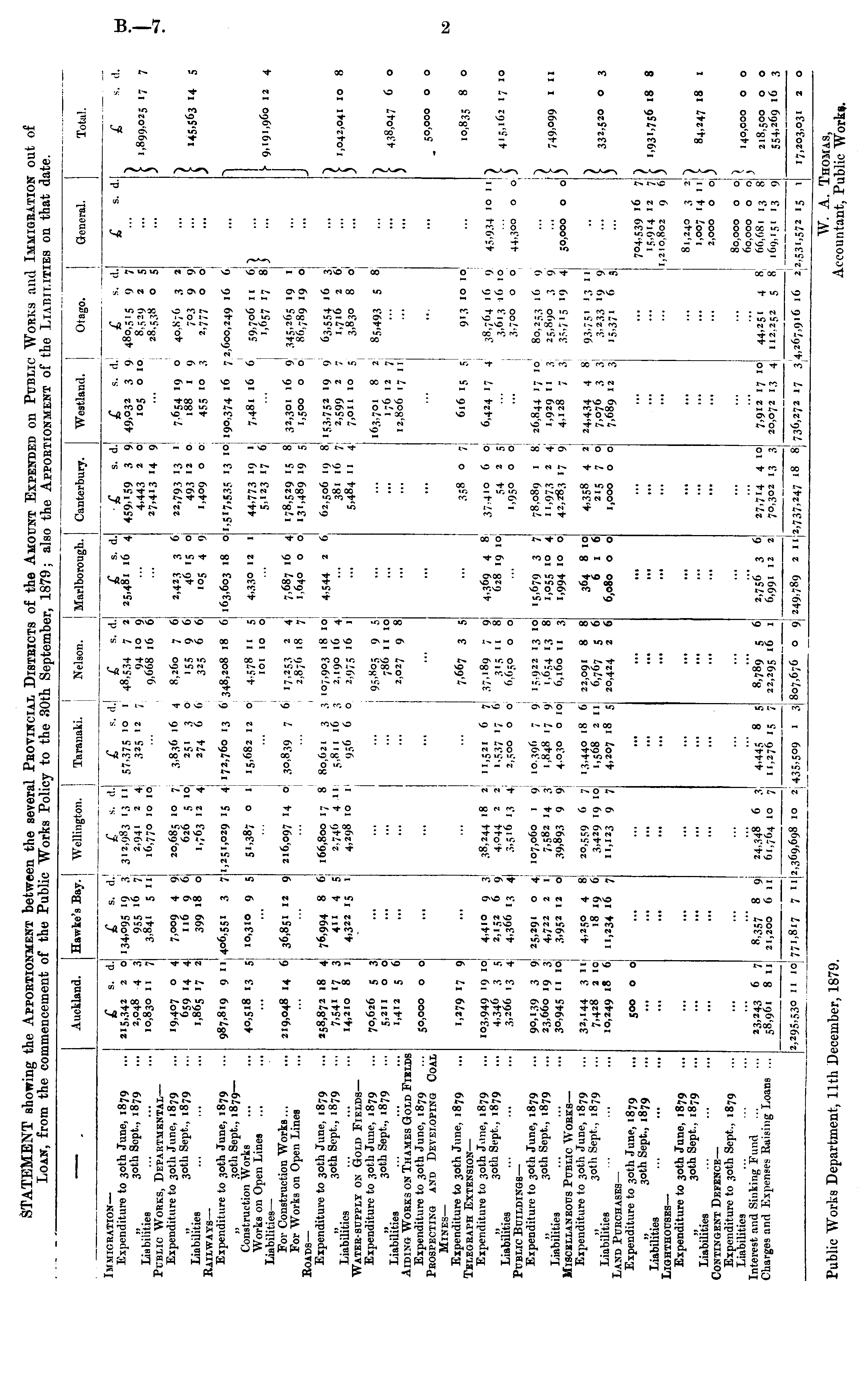 STATEMENT showing the APPORTIONMENT between the several Provincial DISTRICTS of the AMOUNT EXPENDED on PUBLIC WORKS and IMMIGRATION out of LOAN, from the commencement of the Public Works Policy to the 30th September, 1879; also the APPORTIONMENT of the LIABILITIES on that date.