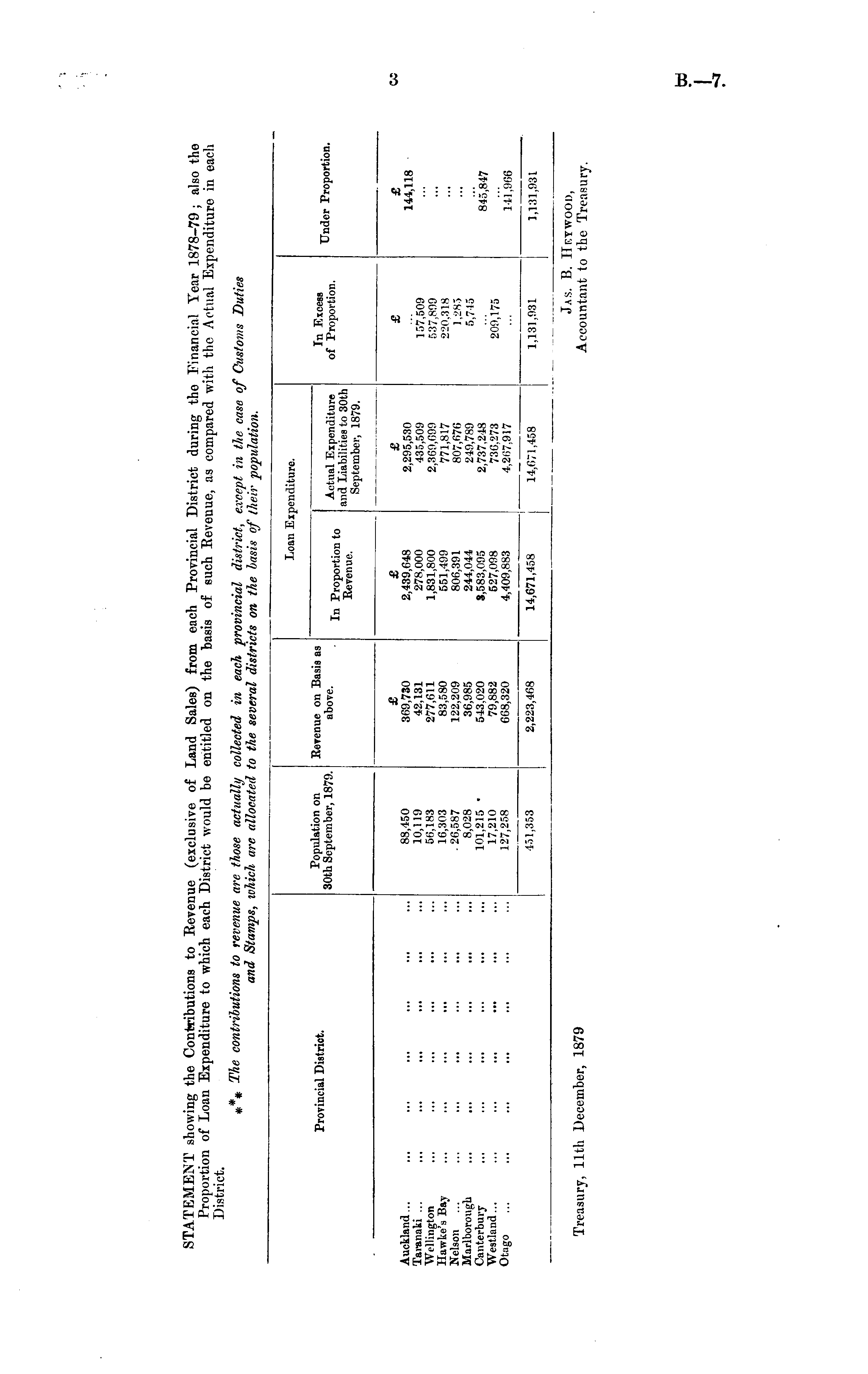 Loan Expenditure. Provincial District. Population on 30th September, 1879. Revenue on Basis as above. In Excess of Proportion. Under Proportion. In Proportion to Revenue. Actual Expenditure and liabilities to 30th September, 1879. Vuckland... raranaki ... Wellington Hawke's Bay Selson Marlborough -anterbury IVestlnnd... 88,450 10,119 58,183 16,303 . 26,587 8,028 101.215 • 17,210 127,258 £ 369,730 42,131 277,611 83,580 122,209 36,985 543,020 79,882 668,320 £ 2,439,648 278,000 1,831,800 551,199 806,391 244,044 8,583,095 527,098 4,409,883 £ 2,295,530 435,509 2,369,699 771,817 807,676 249,789 2,737,248 736,273 4,267,917 £ 157,509 637,899 220.318 1,285 5,715 £ 144,118 209,175 845,847 )tugo 111.966 451,353 2,223,468 14,671,458 14,671 ,458 1,131,931 1,131,931 Treasury, lltlr December, 1879 J AS. B. Heywood, Accountant to the Treasur