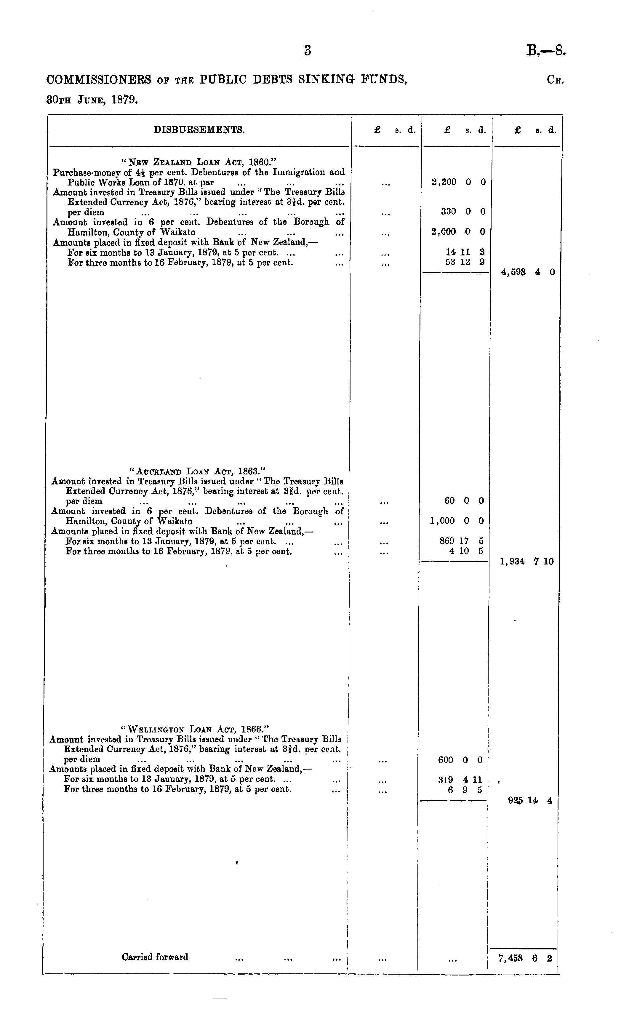 DISBURSEMENTS. £ s. d. £ s. d. £ «. d. "New Zealand Loan Act, 1860." Purchase-money of 44 per cent. Debentures of the Immigration and Public Works Loan of 1870, at par Amount invested in Treasury Bills issued under "The Treasury Bills Extended Currency Act, 1870," bearing interest at 3Jd. per cent. per diem Amount invested in 6 per cent. Debentures of the Borough of Hamilton, County of Waikato Amounts placed in fixed deposit with Bank of New Zealand, — For six months to 13 January, 1879, at 5 per cent. ... For three months to 16 February, 1879, at 5 per cent. 2,200 0 0 330 0 0 2,000 0 0 14 11 3 53 12 9 4,598 4 0 "Auckland Loan Act, 1863." Amount invested in Treasury Bills issued under " The Treasury Bills Extended Currency Act, 1876," bearing interest at 3fd. per cent. per diem Amount invested in 6 per cent. Debentures of the Borough of Hamilton, County of Waikato Amounts placed in fixed deposit with Bank of New Zealand, — For six montlis to 13 January, 1879, at 5 per cent. ... For three months to 16 February, 1879, at 5 per cent. 60 0 0 1,000 0 0 869 17 5 4 10 5 1,934 7 10 "Wellington Loan Act, 1866." Amount invested in Treasury Bills issued under " The Treasury Bills Extended Currency Act, 1876," bearing interest at 3|d. per cent. per diem Amounts placed in fixed deposit with Bank of New Zealand,— For six months to 13 January, 1879, at 5 per cent. ... For three months to 16 February, 1879, at 5 per cent. 600 0 0 319 4 11 6 9 5 I 925 14 4 t Carried forward 7,458 6 2