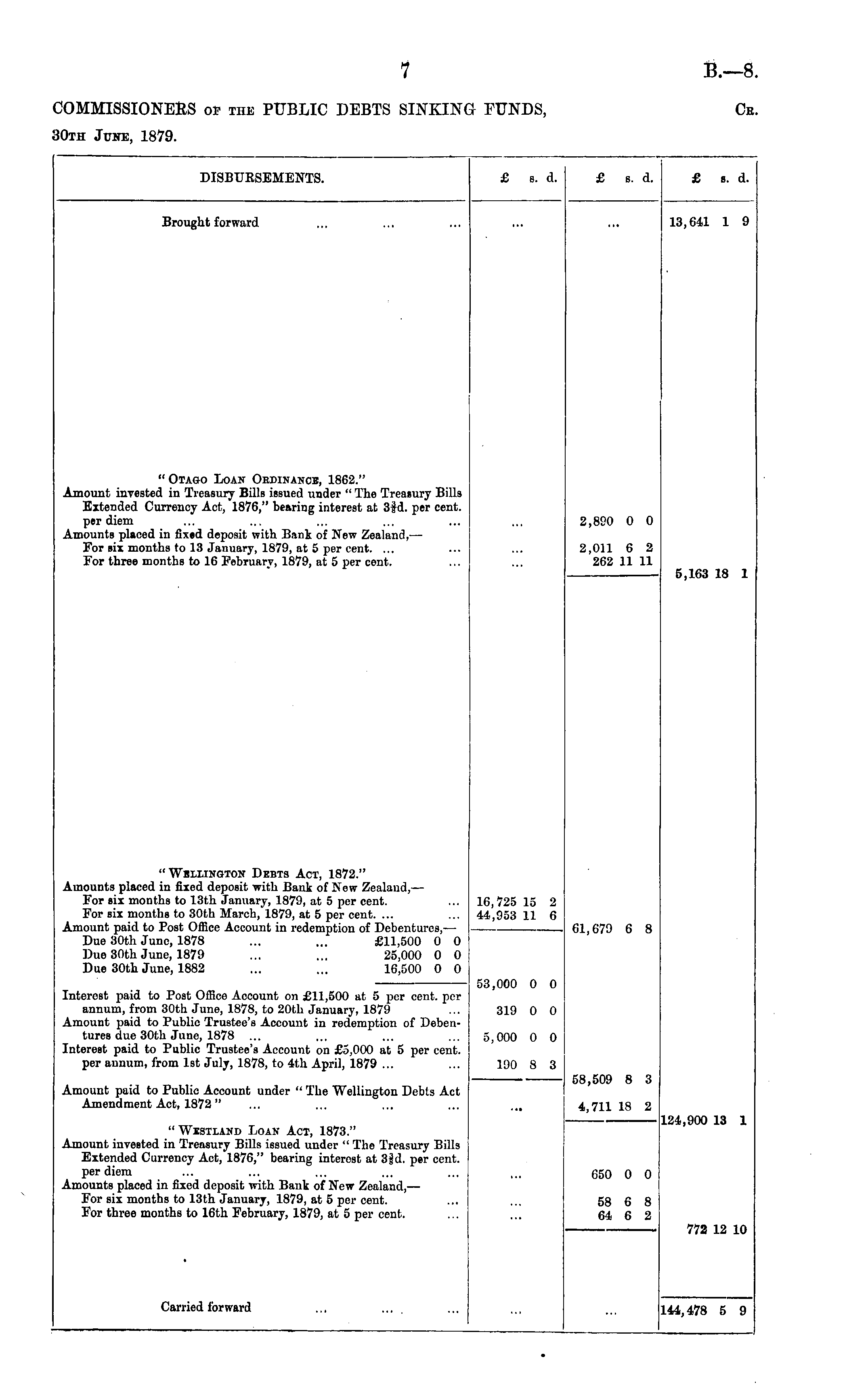 DISBUESEMENTS. £ s. d. £ s. A. £ s. A. Brought forward 13,641 1 9 " Otago Loan Oedinance, 1862." Amount invested in Treasury Bills issued under " The Treasury Bills Extended Currency Act, 1876," bearing interest at 3jd. per cent. per diem Amounts placed in fixed deposit with Bank of New Zealand, — For six months to 13 January, 1879, at 5 per cent. ... For three months to 16 February, 1879, at 5 per cent. 5,163 18 1 2,890 0 0 2,011 6 2 262 11 11 " Wellington Debt3 Act, 1872." Amounts placed in fixed deposit with Bank of Now Zealand, — For six months to 13th January, 1879, at 5 per cent. For six months to 30th March, 1879, at 5 per cent. ... Amount paid to Post Office Account in redemption of Debentures,— Due 30th June, 1878 ... ... £11,500 0 0 Duo 30th June, 1879 ... ... 25,000 0 0 Due 30th June, 1882 ... ... 16,500 0 0 16,725 15 2 44,953 11 6 61,679 6 8 53,000 0 0 Interest paid to Post Office Account on £11,500 at 5 per cent, per annum, from 30th June, 1878, to 20th January, 1879 Amount paid to Public Trustee's Account in redemption of Debentures due 30th June, 1878 ... Interest paid to Public Trustee's Account on £5,000 at 5 per cent. per annum, from 1st July, 1878, to 4th April, 1879 ... 319 0 0 5,000 0 0 190 8 3 Amount paid to Public Account under " The Wellington Debts Act Amendment Act, 1872 " 58,509 8 3 4,711 18 2 •' Westland Loan Act, 1873." Amount invested in Treasury Bills issued under " The Treasury Bills Extended Currency Act, 1876," bearing interest at 3|d. per cent. per diem Amounts placed in fixed deposit with Bank of New Zealand, — For six months to 13th January, 1879, at 5 per cent. For throe months to 16th February, 1879, at 5 per cent. 124,900 13 1 050 0 0 58 6 8 64 6 2 772 12 10 Carried forward ... .... 144,478 5 9