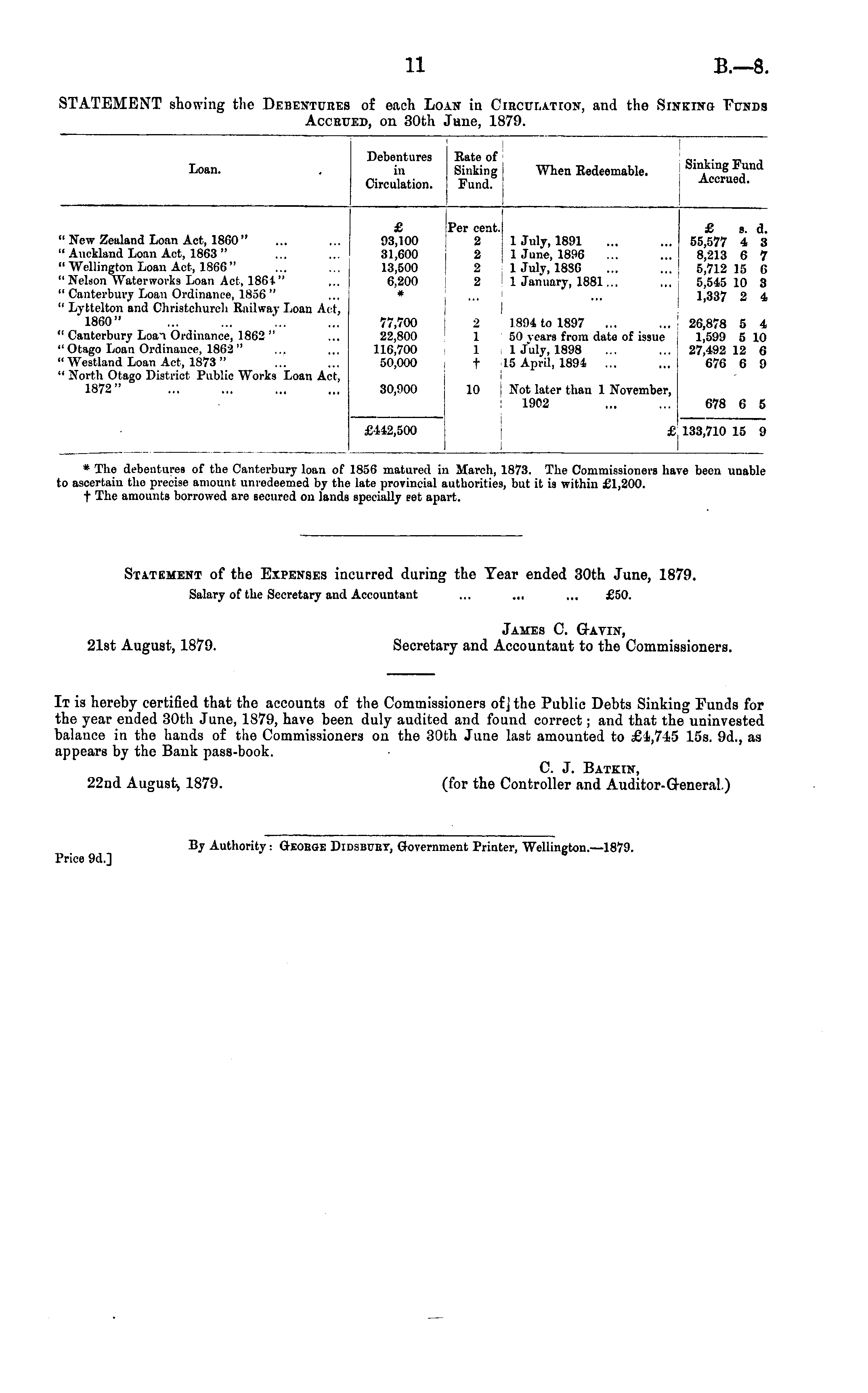 * The debentures of the Canterbury loan of 1856 matured in March, 1873. The Commissioners have been unable to ascertain the precise amount unredeemed by the late provincial authorities, hut it is within £1,200. t The amounts borrowed are secured on lands specially set apart. Statement of the Expenses incurred during the Tear ended 30th June, 1879. Salary of the Secretary and Accountant ... ... ... £50. James C. Gavin, 21st August, 1879. Secretary and Accountant to the Commissioners. It is hereby certified that the accounts of the Commissioners of j the Public Debts Sinking Funds for the year ended 30th June, 1879, have been duly audited and found correct; and that the uninvested balance in the hands of the Commissioners on the 30th June last amounted to £1,715 15s. 9d., as appears by the Bank pass-book. C. J. Batkin, 22nd August, 1879. (for the Controller and Auditor-General.) By Authority : Oeokge Didsbubt, Government Printer, Wellington.—lB79. Price 9d.] ' S