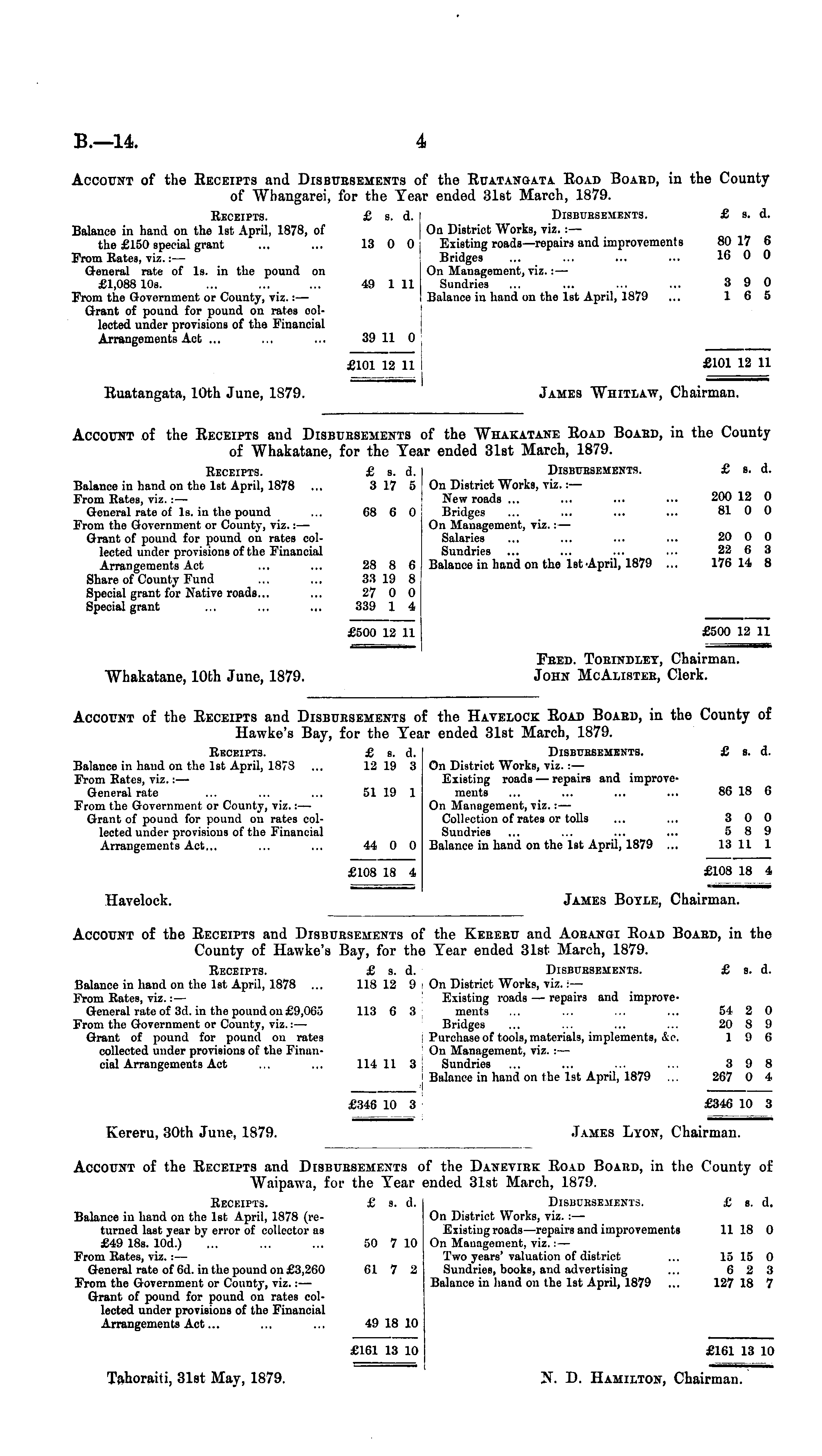 Account of the Eeceipts and Disbuesements of the Euatanoata Eoad Board, in the County of Whangarei, for the Year ended 31st March, 1879. Receipts. £ s. d. : Disbursements. £ s. d. Balance in hand on the Ist April, 1878, of | On District Works, yiz. :— the £150 special grant ... ... 13 00 j Existing roads—repairs and improvements 80 17 6 From Rates, viz.:— Bridges ... ... ... ... 16 0 0 General rate of Is. in the pound on On Management, viz.: — £1,088 108. ... ... ... 49 111 Sundries ... ... ..." ... 3 9 0 From the Government or County, viz.: — Balance in hand on the Ist April, 1879 ... 16 5 Grant of pound for pound on rates collected under provisions of the Financial Arrangements Act ... ... ... 39 11 0 £101 12 11 £101 12 U Euatangata, 10th June, 1579. James Whitlaw, Chairman.