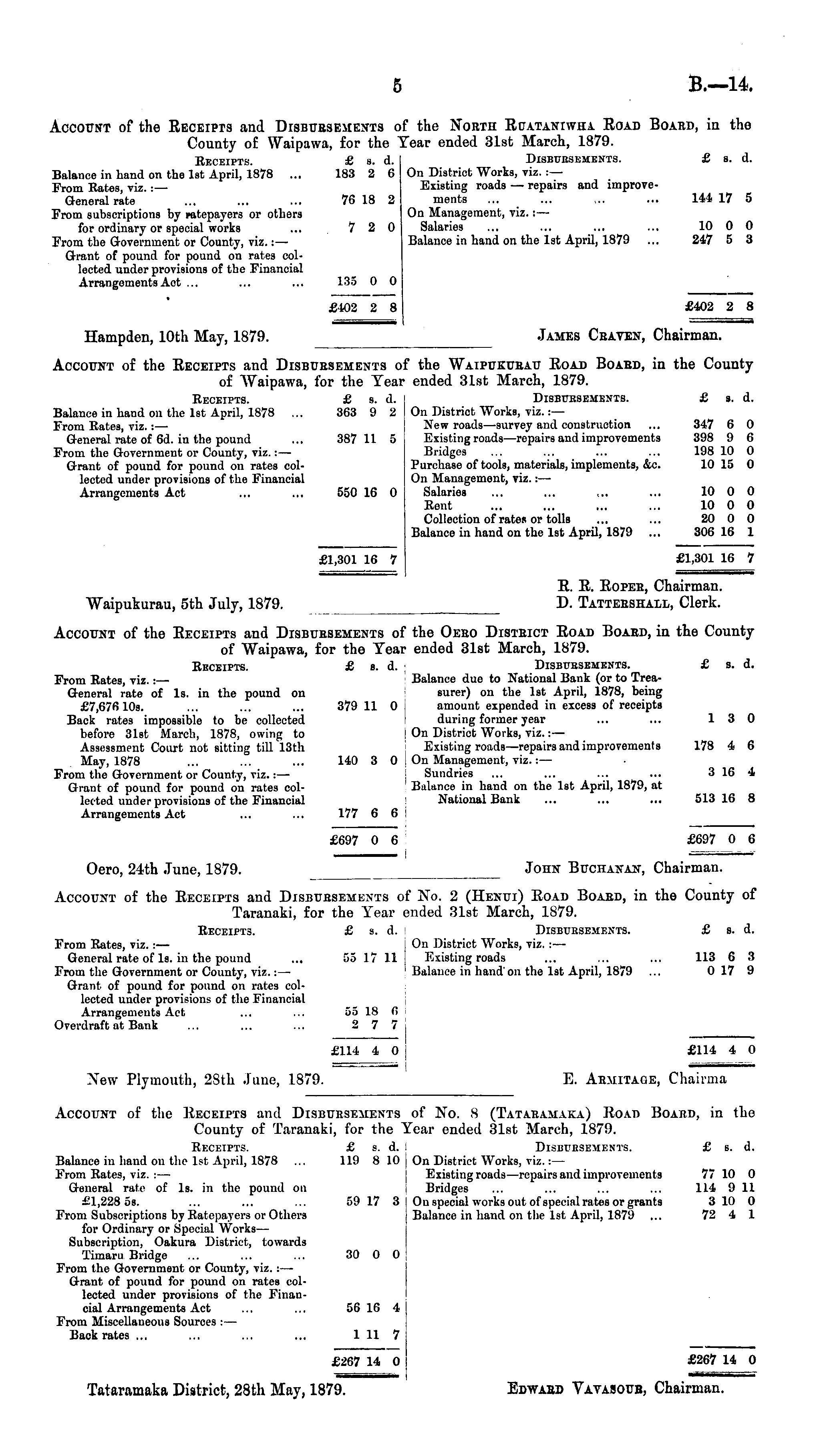 Account of the Eeceipts and Disbursements of No. 8 (Tataramaka) Eoad Board, in the County of Taranaki, for the Year ended 31st March, 1879. Receipts. £ s. d. Disbursements. £ s. d. Balance in baud on the Ist April, 1878 ... 119 810j On District Works, viz. i— From Rates, viz. : — Existing roads—repairs aud improvements 77 10 0 General rate of Is. in the pound on Bridges ... ... ... ... 114 911 £1,228 ss. ... ... ... 59 17 3| Ou special works out of special rates or grants 3 10 0 From Subscriptions by Ratepayers or Others Balance in hand on the Ist April, 1879 ... 72 4 1 for Ordinary or Special Works — Subscription, Oakura District, towards Timaru Bridge ... ... ... 30 0 0 From the Government or County, viz. : —• Grant of pound for pound on rates collected under provisions of the Financial Arrangements Act ... ... 56 16 4 From Miscellaneous Sources :— Back rates ... ... ... ... 1 11 7 £267 14 0 J £267 14 0 Tataramaka District, 28th May, 1879. Edward Vavasour, Chairman.