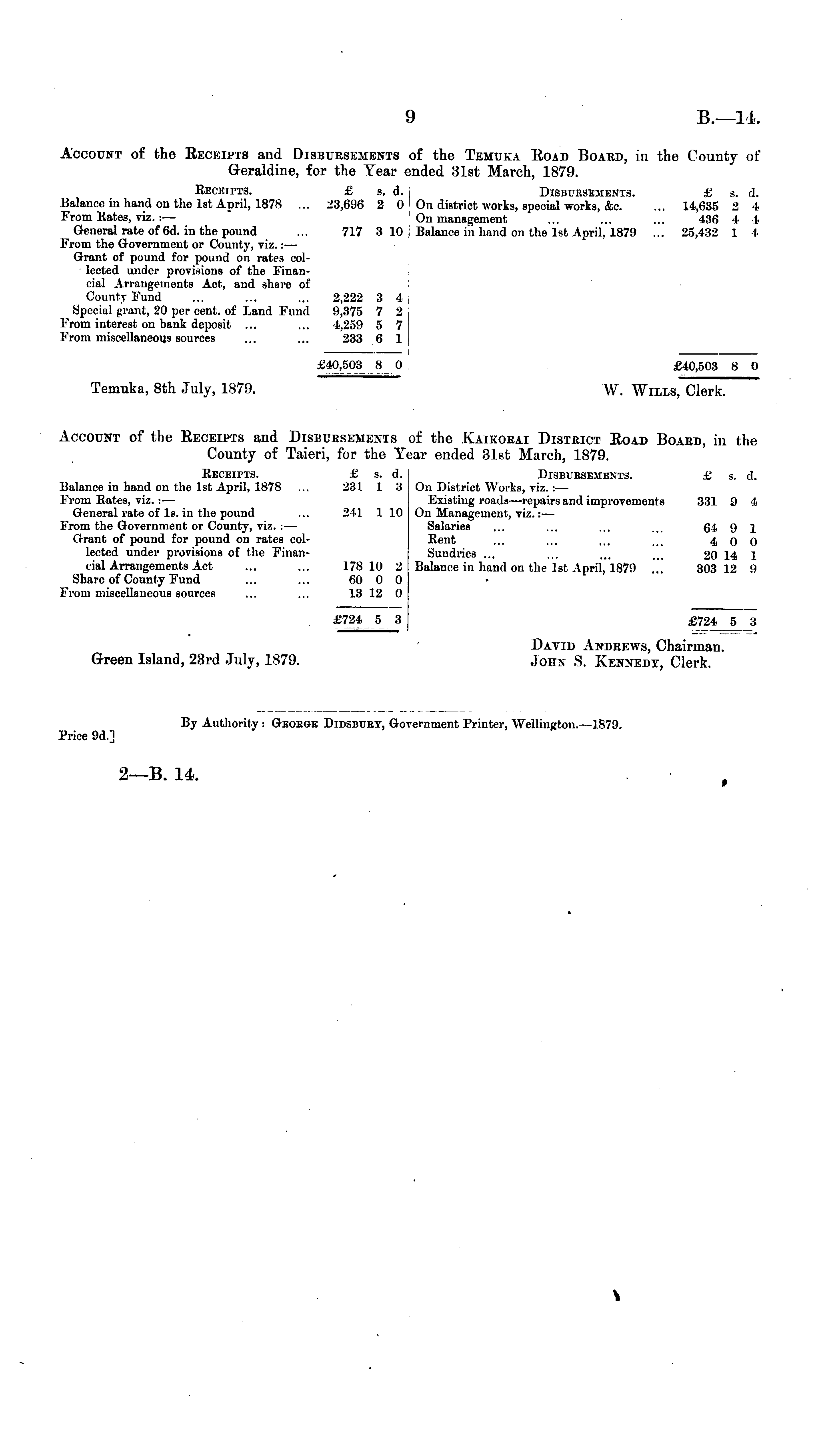 Account of the Eeceipts aud Disbursements of the Temuka Eoad Board, in the County of Geraldine, for the Year ended 31st March, 1879. Receipts. £ s. d. Disbursements. £ s. d. Balance in hand on the Ist April, 1878 ... 23,696 2 0 On district works, special works, &c. ... 14,635 2 4 From Rates, viz. : — On management ... ... ... 436 4 4 General rate of 6d. in the pound ... 717 310 | Balance in hand on the Ist April, 1879 ... 25,432 1 I Prom the Government or County, viz.: — Grant of pound for pound on rates collected under provisions of the Financial Arrangements Act, and share of County Fund ... ... ... 2,222 3 4 Special prant, 20 per cent, of Land Fund 9,375 7 2 From interest on bank deposit ... ... 4,259 5 7 From miscellaneous sources ... ... 233 6 1 I £40,608 8 0 £40,503 8 0 Temuka, Bth .Inly, 1879. W. Wills, Clerk. Account of the Eeceipts and Disbursements of the Kaikorai District Eoad Board, in the County of Taieri, for the Year ended 3lst March, 1879. Receipts. £ s. d. Disbursements. £ s. d. Balance in hand on the Ist April, 1878 ... 231 1 3 On District Works, viz.:— From Rates, viz. : — Existing roads—repairs and improvements 331 9 4 General rate of Is. in the pound ... 241 1 10 On Management, viz.: — From the Government or County, viz. : — Salaries ... ... ... ... 64 9 1 Grant of pound for pound on rates col- Rent ... ... ... 4 0 0 lected under provisions of the Finan- Sundries ... ... ... 20 14 1 cial Arrangements Act ... ... 178 10 2 Balance in hand on the Ist April, 1879 ... 303 12 9 Shave of County Fund ... ... 60 0 0 From miscellaneous sources ... ... 13 12 0 £724 5 3 £724 5 3 Dayid Andrews, Chairman. Green Island, 23rd July, 1879. John S. Kennedy, Clerk. By Authority : George Didsbury, Government Printer, Wellington.—lS79. Price 9d.] 2—B. 14. . f
