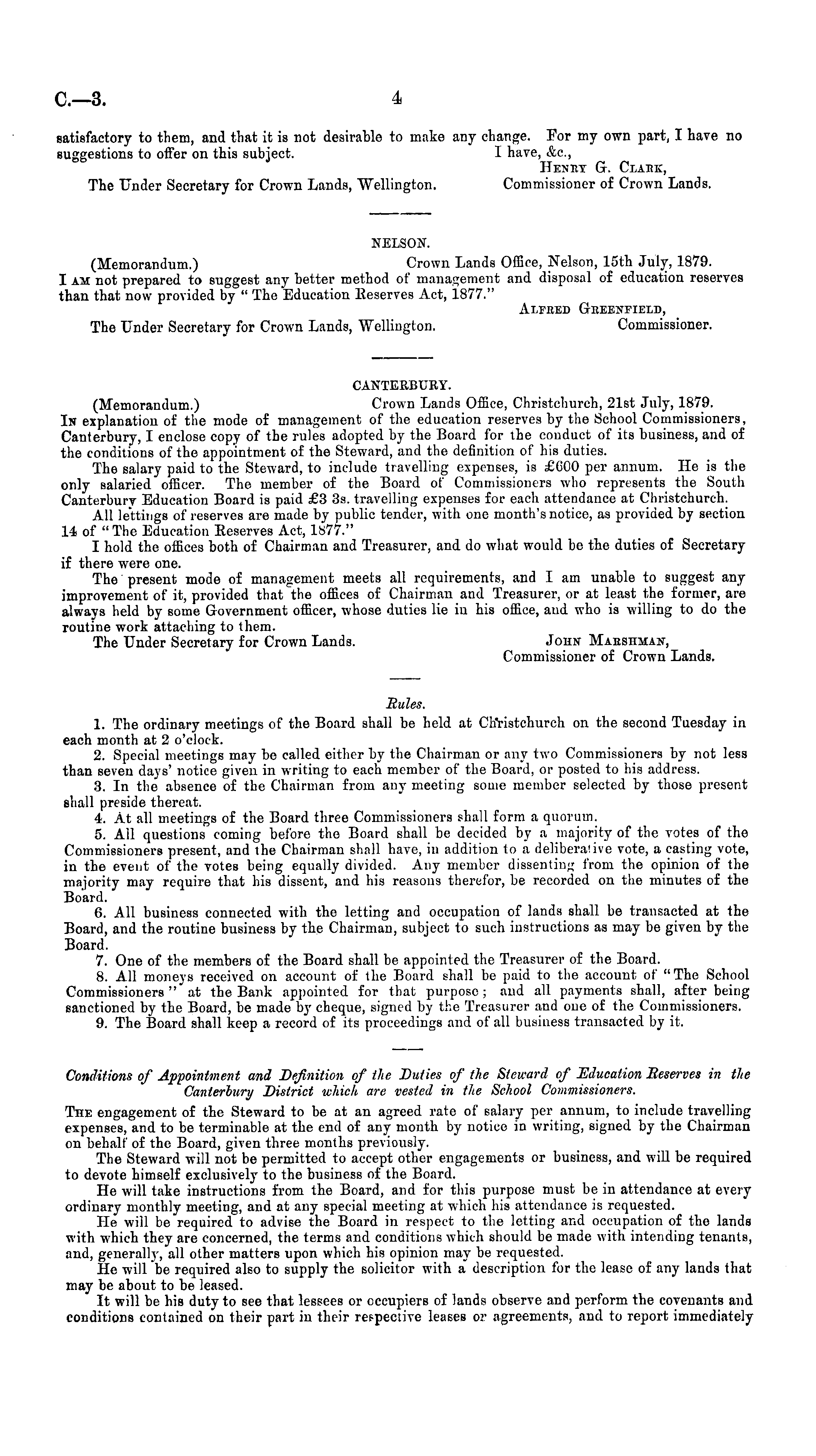 CANTERBURY. (Memorandum.) Crown Lands Office, Christchurch, 21st July, 1579. In explanation of the mode of management of the education reserves by the School Commissioners, Canterbury, I enclose copy of the rules adopted by the Board for the conduct of its business, and of the conditions of the appointment of the Steward, and the definition of his duties. The salary paid to the Steward, to include travelling expenses, is £GOO per annum. He is the only salaried officer. The member of the Board of Commissioners who represents the South Canterbury Education Board is paid £3 3s. travelling expenses for each attendance at Christchurch. All lettings of reserves are made by public tender, with one month's notice, as provided by section 14 of "The Education Eeserves Act, 1877." I hold the offices both of Chairman and Treasurer, and do what would be the duties of Secretary if there were one. The present mode of management meets all requirements, and I am unable to suggest any improvement of it, provided that the offices of Chairman and Treasurer, or at least the former, are always held by some Government officer, whose duties lie in his office, and who is willing to do the routine work attaching to them. The Under Secretary for Crown Lands. Joiin Maeshman, Commissioner of Crown Lands.