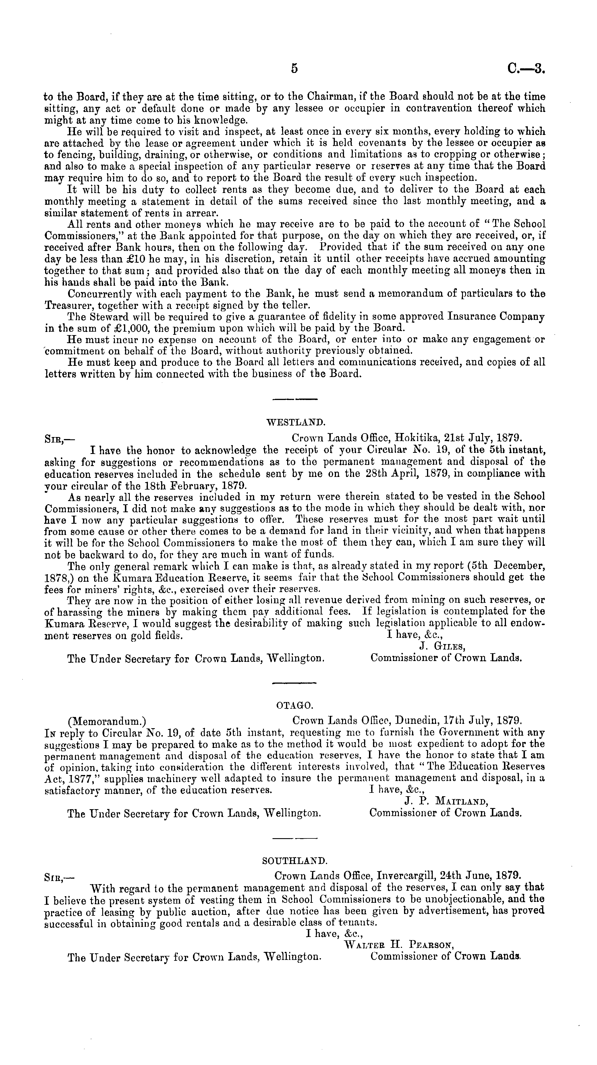SOUTHLAND. S in> — Crown Lands Office, Invercargill, 2-lth June, 1879. "With regard to the permanent management and disposal of the reserves, I can only say that I believe the present system of vesting them in School Commissioners to be unobjectionable, and the practice of leasing by public auction, after due notice has been given by advertisement, has proved successful in obtaining good rentals and a desirable class of tenants. I have, &c, Walter H. Pearson, The Under Secretary for Crown Lands, Wellington. Commissioner of Crown Lands.