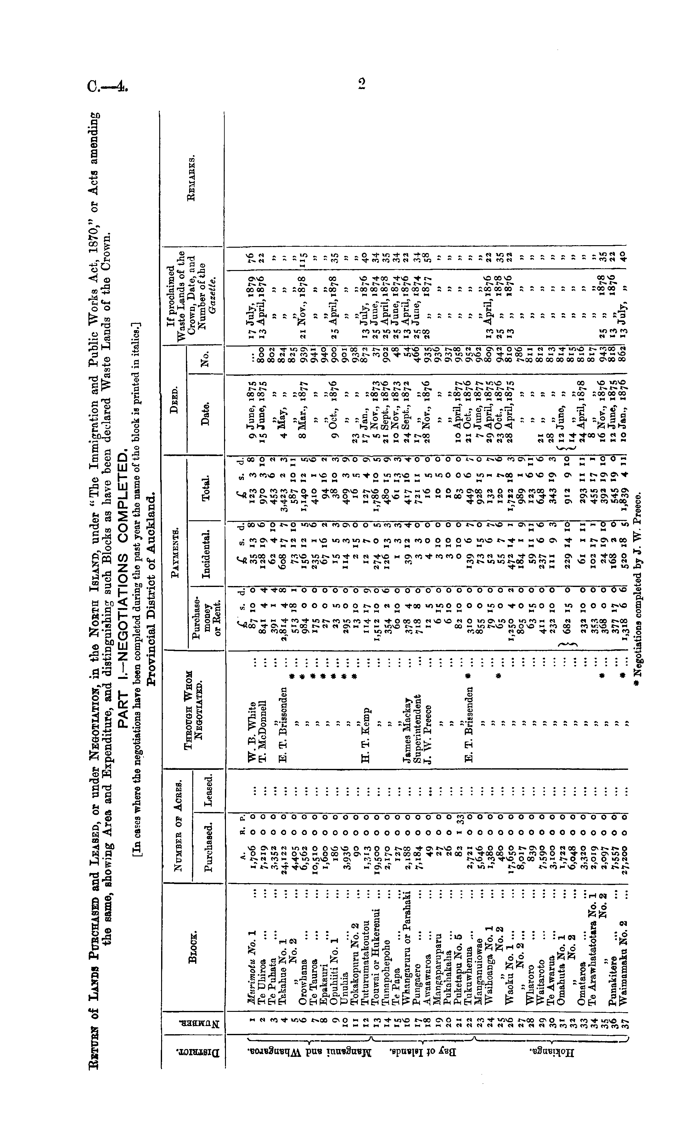 Retuen of Lands Pubchased and Leased, or under Negotiation, in the North Island, under "The Immigration and Public AYorks Act, 1870," or Acts amending the same, showing Area and Expenditure, and distinguishing such Blocks as have been declared Waste Lands of tho Crown. PART 1.-NEGOTIATIONS COMPLETED. [In ca~cs where the negotiations have been completed during the past year tho name of tho block is printed in italics.] Provincial District of Auckland.