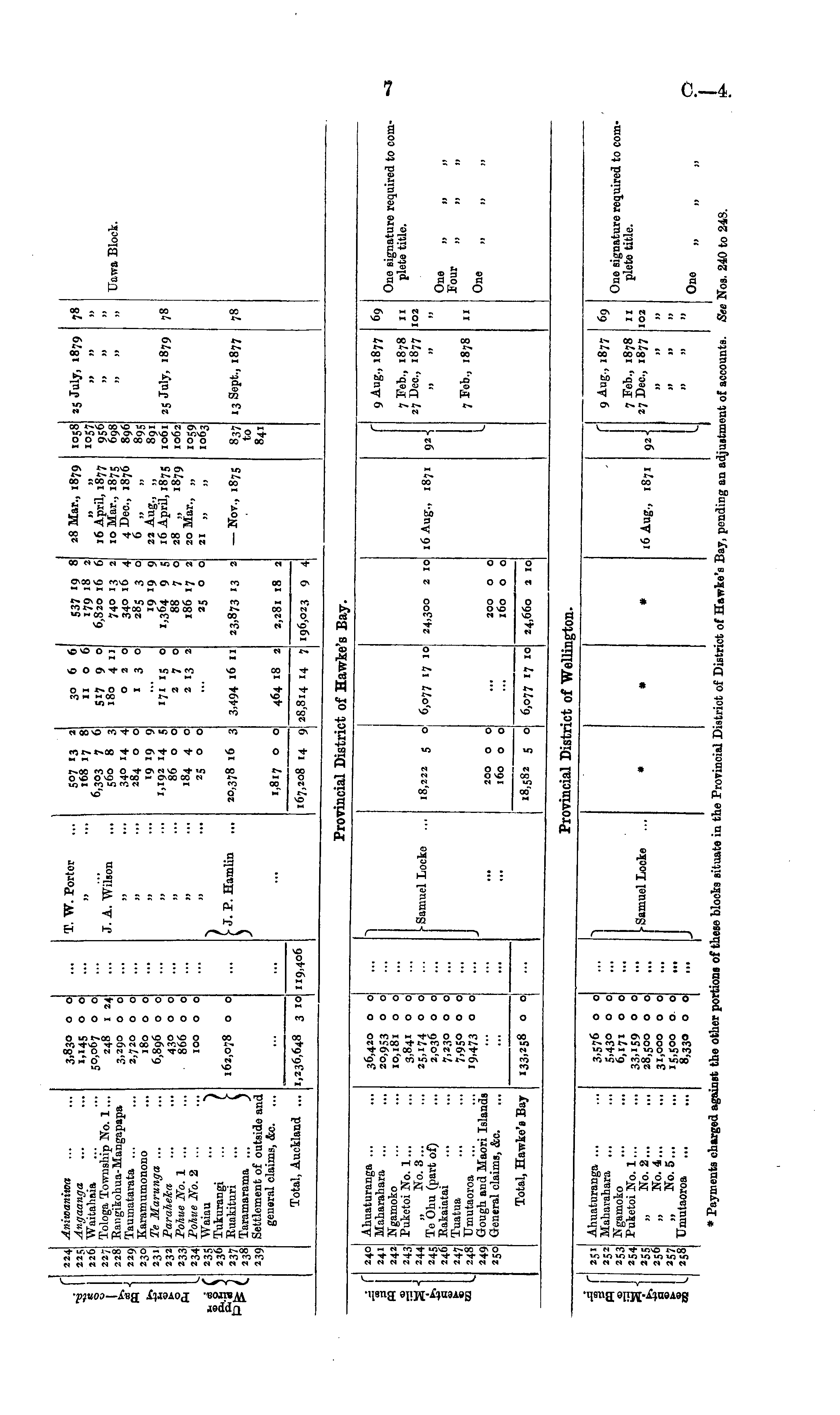 § 25' 252 253 254 255 256 257 2 5 8 Ahnaturanga ... Maharahara ,., Ngamoko PuketoiNo. 1... No. 2... No. 4... „ No. 5... Umutaoroa ... 3,57 6 o ° 5,430 o o 6,171 o o 33,159 o o 28,500 o o ... 31,000 o o 15,500 o o ... 8,33° 00 ■Samuel Locke # 16 Aug., 1871 * 92-j 9 Aug., 1877 7 Feb., 1878 27 Dec, 1877 69 II 102 One signature required to coi plete title. ■ * „ „ J> J iese blocks situate in tl ie Provincial Di istrict of Disti ict of Hawke's J» JJ JJ JJ Jj II One „ „ „ * Payments charged t 1st the other portions of tl lay, pending an a I tent of accounts. 1 justmi Noa. 240 to 248. an ai See