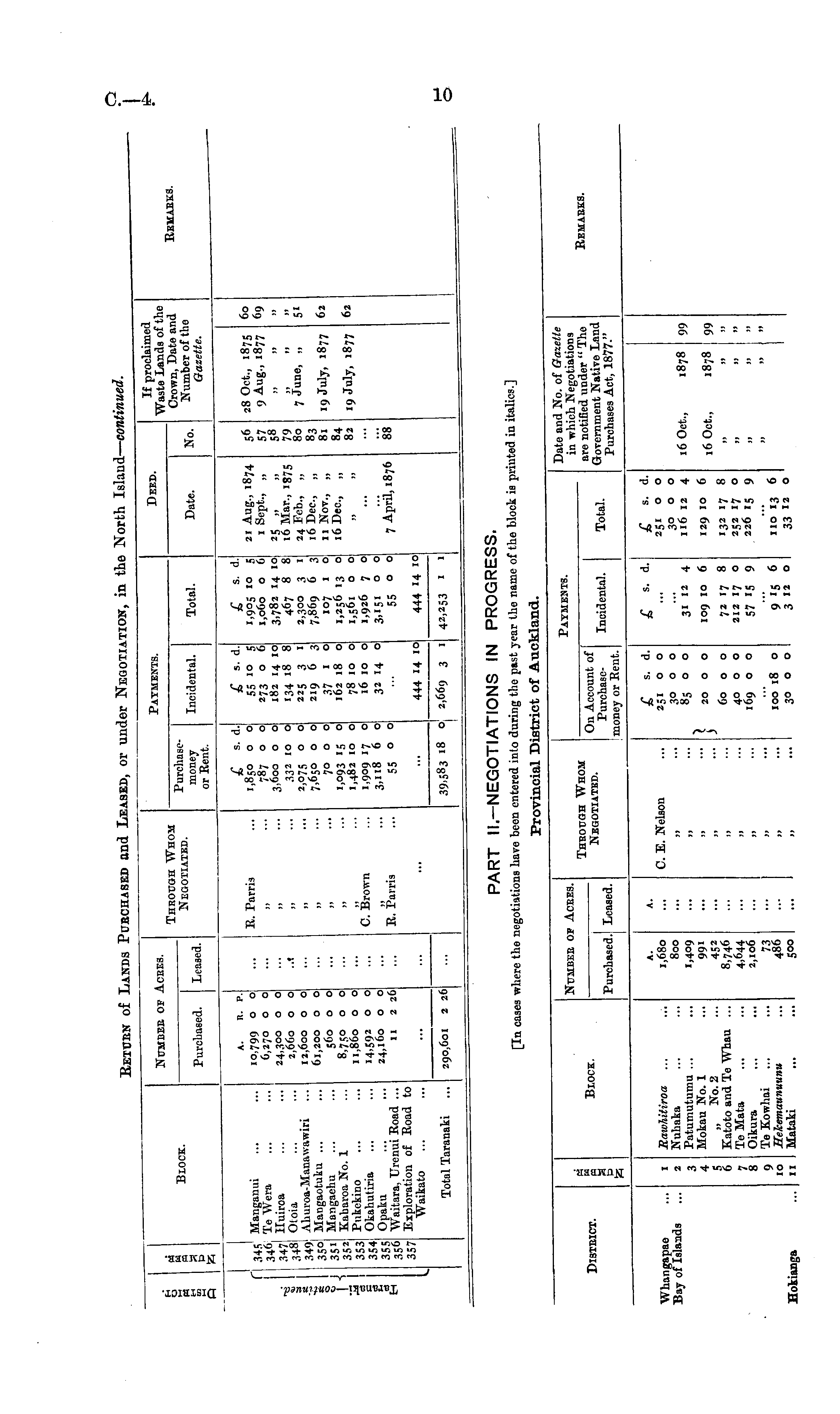 M rn P M y Numbee op Aches. Payments. Deed. If proclaimed Waste Lands of the Crown, Date and Number of the Gazette. Eemaeks. Biock. Negotiated. Purchasemoney or Kent. Incidental. Total. Date. No. Purchased. Leased. a a H 345 34* 347 348| 349' 35° 35' 352 353 354 355 356 357 Manganui Te Wen Iluiroa Oloia Ahuroa-Manawawiri Mangaotuku ... Mangaehu Kaharoa No. 1 Pukekino Okahutiria Opaku Waitara, Urcnui Koad ... Exploration of Boad to Waikato A. 11. p. 10,799 o o 6,270 o o 24,300 o o 2,660 o o 12,600 o o 61,200 o o 560 o o 8,750 o o 11,860 o o 14,592 o o 24,160 o o II 2 26 ... ... ..t E. Parris JJ JJ JJ J) JJ £ s. d. 1,850 o o 787 o o 3,600 o o 332 10 o 2,075 ° o 7,650 o o 70 o o 1,093 '5 o 1,482 10 o 1,909 17 o 3,118 6 o 55 o o £ s. d. 55 10 5 273 o 6 182 14 10 134 18 8 225 3 1 219 6 3 37 ' ° 162 18 o 78 10 o 16 10 o £ s. d. 1,905 10 5 1,060 o 6 3,782 14 10 467 8 8 2,300 3 1 7,869 6 3 107 1 o 1,256 13 o 1,561 o o 1,926 7 o 3,'5' o o 55 o o 21 Aug., 1874 1 Sept., „ 25 „ 16 Mar., 1875 24 Feb., „ 16 Dec, „ 1 1 Nov., „ 16 Dec, „ 56 57 79 83 84 82 28 Oct., 1875 9 Aug., 1877 jj jj jj jj 7 June, „ 19 July, 1877 60 („, JJ JJ 5' (,2 ... Jl ... JJ 19 July, 1877 62 C. Brown ,, jj j» E. Parris 32 14 o 7 April, 1876 88 '" ... 39,583 '8 o 444 '4 10 2,669 3 1 444 '4 10 290,601 2 26 ! Total Taranaki ... 42,253 ' " PART ll.-NEGOTIATIONS IN PROGRESS. [In cases where the negotiations have been entered into during tho past year the name of the block is printed in italics.] Provincial District of Auckland. H - y Block. NfJIBEE OF ACEES. Theottgii Whom Negotiated. Paysiekts. Date and No. of Gazelle in which Negotiations are notified under " The Government Native Land Purchases Act, 1877." Bemabks. DlSTEICT. Leased. On Account of Purchasemoney or Bent. Incidental. Total. Purchased.' A. 1,680 80O 1,409 99' 452 8,746 4,644 2,106 73 486 500 A. £ 1. d. 251 o o 30 o o 85 o o £ s. d. £ s. d. 251 o o 30 o o Il6 12 4 Whangapao Bay of Islands 1 Rawhitiroa Nuhaka Patumutumu ... Mokau No. 1 „ No. 2 Katoto and Te Whau ... Te Mata Oikura Te Kowhai Hekemaunuunu Mataki C. E. Nelson 2 jj 3' '2 4 16 Oct., 1878 99 3 4 5 6 7 8 9 10 jj j 20 o o 109 10 6 129 10 6 16 Oct., 1878 JJ 99 u u 60 o o 40 o o 169 o o 72 17 8 212 17 o 57 '5 9 132 17 8 252 17 o 226 15 9 jj jj JJ Hokianga jj j» 100 18 o 30 o o 9 '5 6 3 12 o no 13 6 33 12 o u jj jj jj JJ JJ jj Hokianj 11 jj