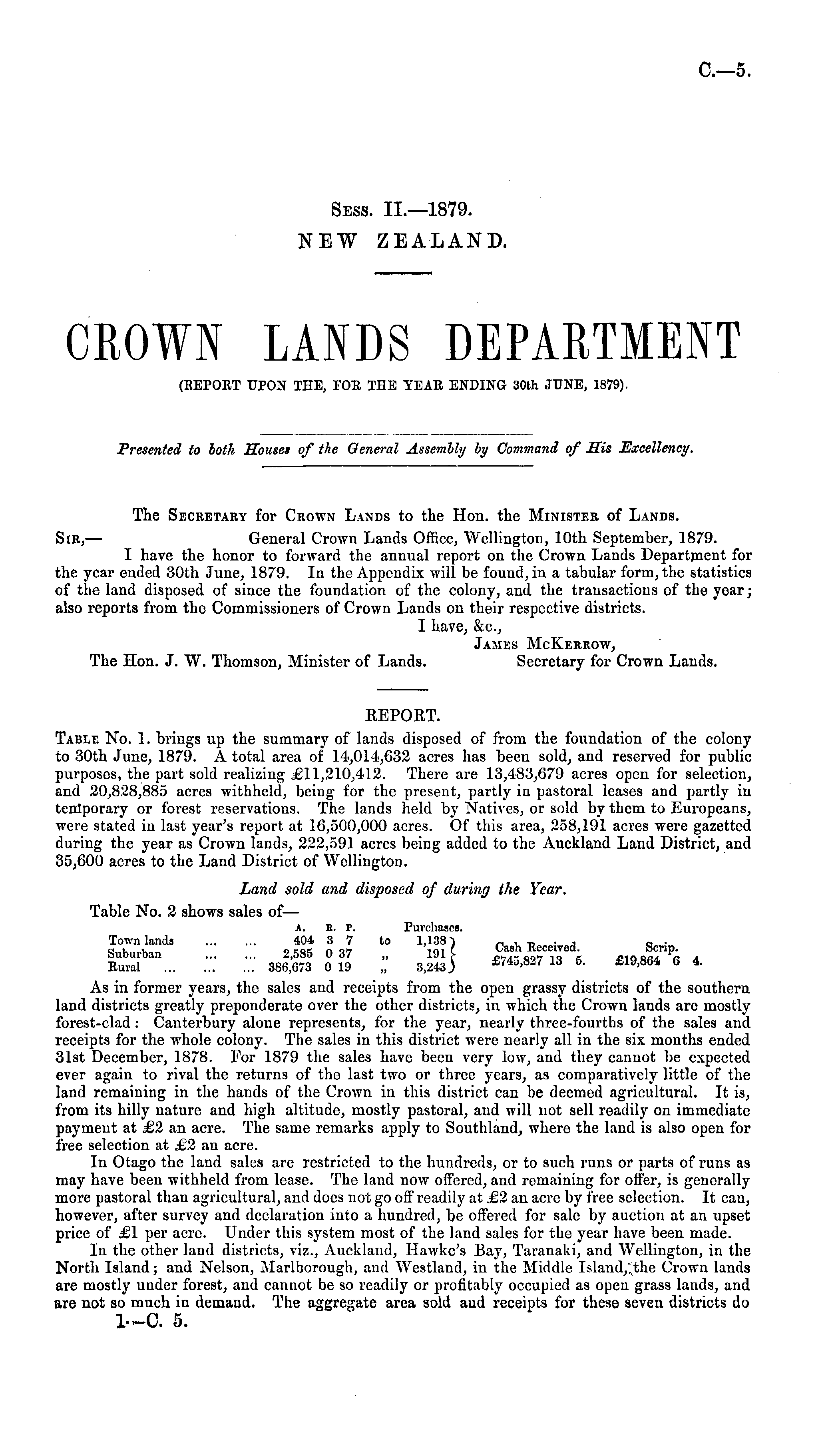The Secretary for Crown Lands to the Hon. the Minister of Lands. Sir, — General Crown Lands Office, Wellington, 10th September, 1879. I have the honor to forward the annual report on the Crown Lands Department for the year ended 30th June, 1879. In the Appendix will be found, in a tabular form, the statistics of the land disposed of since the foundation of the colony, and the transactions of the year; also reports from tho Commissioners of Crown Lands on their respective districts. I have, &c, James McKerrow, The Hon. J. W. Thomson, Minister of Lands. Secretary for Crown Lands. REPORT. Table No. 1. brings up the summary of lands disposed of from the foundation of the colony to 30th June, 1879. A total area of 14,014,632 acres has been sold, and reserved for public purposes, the part sold realizing £11,210,412. There are 13,483,679 acres open for selection, and 20,828,885 acres withheld, being for the present, partly in pastoral leases and partly in tenlporary or forest reservations. The lands held by Natives, or sold by them to Europeans, were stated in last year's report at 16,500,000 acres. Of this area, 258,191 acres were gazetted during the year as Crown lands, 222,591 acres being added to the Auckland Land District, and 35,600 acres to the Land District of Wellington. Land sold and disposed of during the Year. Table No. 2 shows sales of— A. R. P. Purchases. Town lands 404 3 7 to 1,138) n , „ . , -_, Suburban 2,585 037 „ 191 [ S^ll^l r *,**%?% _ Rural 386,673 019 „ 3,243 ) *'*>.837 13 5. £19,864 64. As in former years, the sales and receipts from the open grassy districts of the southern land districts greatly preponderate over the other districts, in which the Crown lands are mostly forest-clad : Canterbury alone represents, for the year, nearly three-fourths of the sales and receipts for the whole colony. The sales in this district were nearly all in the six months ended 31st December, 1878. For 1879 the sales have been very low, and they cannot be expected ever again to rival the returns of the last two or three years, as comparatively little of the land remaining in the hands of the Crown in this district can be deemed agricultural. It is, from its hilly nature and high altitude, mostly pastoral, and will not sell readily on immediate payment at £2 an acre. The same remarks apply to Southland, where the land is also open for free selection at £2 an acre. In Otago the land sales are restricted to the hundreds, or to such runs or parts of runs as may have been withheld from lease. The land now offered, and remaining for offer, is generally more pastoral than agricultural, and does not go off readily at £2 an acre by free selection. It can, however, after survey and declaration into a hundred, be offered for sale by auction at an upset price of £1 per acre. Under this system most of tbe land sales for the year have been made. In the other land districts, viz., Auckland, Hawke's Bay, Taranaki, and Wellington, in the North Island; and Nelson, Marlborough, and Westland, in the Middle Island,,the Crown lands are mostly under forest, and cannot be so readily or profitably occupied as open grass lands, and are not so much in demand. The aggregate area sold and receipts for these seven districts do I—C. 5.