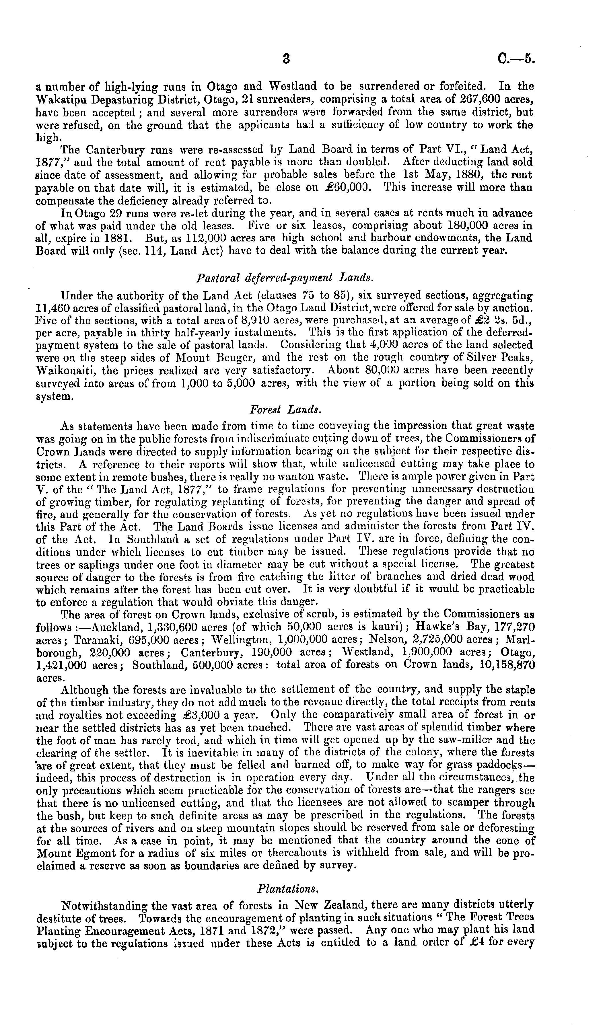a number of high-lying runs in Otago and Westland to be surrendered or forfeited. In the Wakatipu Depasturing District, Otago, 21 surrenders, comprising a total area of 267,600 acres, have been accepted; and several more surrenders were forwarded from the same district, but were refused, on the ground that the applicants had a sufficiency of low country to work tho high. The Canterbury runs were re-assessed by Land Board in terms of Part VI., " Land Act, 1877," and the total amount of rent payable is more than doubled. After deducting land sold since date of assessment, and allowing for probable sales before the Ist May, 1880, the rent payable on tbat date will, it is estimated, be close on £60,000. This increase will more than compensate the deficiency already referred to. In Otago 29 runs were re-let during tbe year, and in several cases at rents much in advance of what was paid under the old leases. Five or six leases, comprising about 180,000 acres in all, expire in 1881. But, as 112,000 acres are high school and harbour endowments, the Laud Board will only (sec. 114, Land Act) have to deal with the balance during the current year. Pastoral deferred-payment Lands. Under the authority ofthe Land Act (clauses 75 to 85), six surveyed sections, aggregating 11,460 acres of classified pastoral land, in tbe Otago Land District, were offered for sale by auction. Five of the sections, with a total area of 8,910 acres, were purchased, at an average of £2 2s. 5d., per acre, payable iv thirty half-yearly instalments. This is the first application of the deferredpayment system to the sale of pastoral lands. Considering tbat 4,000 acres ofthe land selected were on the steep sides of Mount Bcnger, and the rest on tbe rough country of Silver Peaks, Waikouaiti, the prices realized are very satisfactory. About 80,000 acres have been recently surveyed into areas of from 1,000 to 5,000 acres, with the view of a portion being sold on this system. Forest Lands. As statements have been made from time to time conveying the impression that great waste was going on in the public forests from indiscriminate cutting down of trees, the Commissioners of Crown Lands were directed to supply information bearing on tbe subject for their respective districts. A reference to their reports will show that, while unlicensed cutting may take place to some extent in remote bushes, there is really no wanton waste. There is ample power given in Part V. ofthe "The Land Act, 1877," to frame regulations for preventing unnecessary destruction of growing timber, for regulating replanting of forests, for preventing the danger and spread of fire, and generally for the conservation of forests. As yet no regulations have been issued under this Part of the Act. The Land Boards issue licenses and administer the forests from Part IV. of tho Act. In Southland a set of regulations under Part IV. are in force, defining tbe conditions under which licenses to cut timber may be issued. These regulations provide that no trees or saplings under one foot in diameter may be cut without a special license. The greatest source of danger to the forests is from fire catching the litter of branches and dried dead wood which remains after tbe forest has been cut over. It is very doubtful if it would be practicable to enforce a regulation that would obviate tbis danger. The area of forest on Crown lands, exclusive of scrub, is estimated by the Commissioners as follows :— Auckland, 1,330,600 acres (of which 50,000 acres is kauri); Hawke's Bay, 177,270 acres; Taranaki, 695,000 acres; Wellington, 1,000,000 acres; Nelson, 2,725,000 acres; Marlborough, 220,000 acres; Canterbury, 190,000 acres; Westland, 1,900,000 acres; Otago, 1,421,000 acres; Southland, 500,000 acres: total area of forests on Crown lands, 10,158,870 acres. Although the forests arc invaluable to the settlement of tbe country, and supply the staple of the timber industry, they do not add mucb to the revenue directly, the total receipts from rents and royalties not exceeding £3,000 a year. Only the comparatively small area of forest in or near the settled districts has as yet been touched. There arc vast areas of splendid timber where the foot of man has rarely trod, and which in time will get opened up by the saw-miller and the clearing ofthe settler. It is inevitable in many of the districts of the colony, where the forests are of great extent, that they must be felled and burned off, to make way for grass paddocks— indeed, tbis process of destruction is in operation every day. Under all the circumstances, the only precautions which seem practicable for the conservation of forests are—that the rangers see that there is no unlicensed cutting, and that the licensees are not allowed to scamper through the bush, but keep to such definite areas as may be prescribed in the regulations. The forests at tho sources of rivers and on steep mountain slopes should be reserved from sale or deforesting for all time. As a case in point, it may be mentioned that the country around the cone of Mount Egniont for a radius of six miles or thereabouts is withheld from sale, and will be proclaimed a reserve as soon as boundaries are defined by survey. Plantations. Notwithstanding the vast area of forests in New Zealand, there are many districts utterly destitute of trees. Towards the encouragement of planting in such situations " The Forest Trees Planting Encouragement Acts, 1871 and 1872," were passed. Any one who may plant his land subject to the regulations issued under these Acts is entitled to a land order of £4 for every