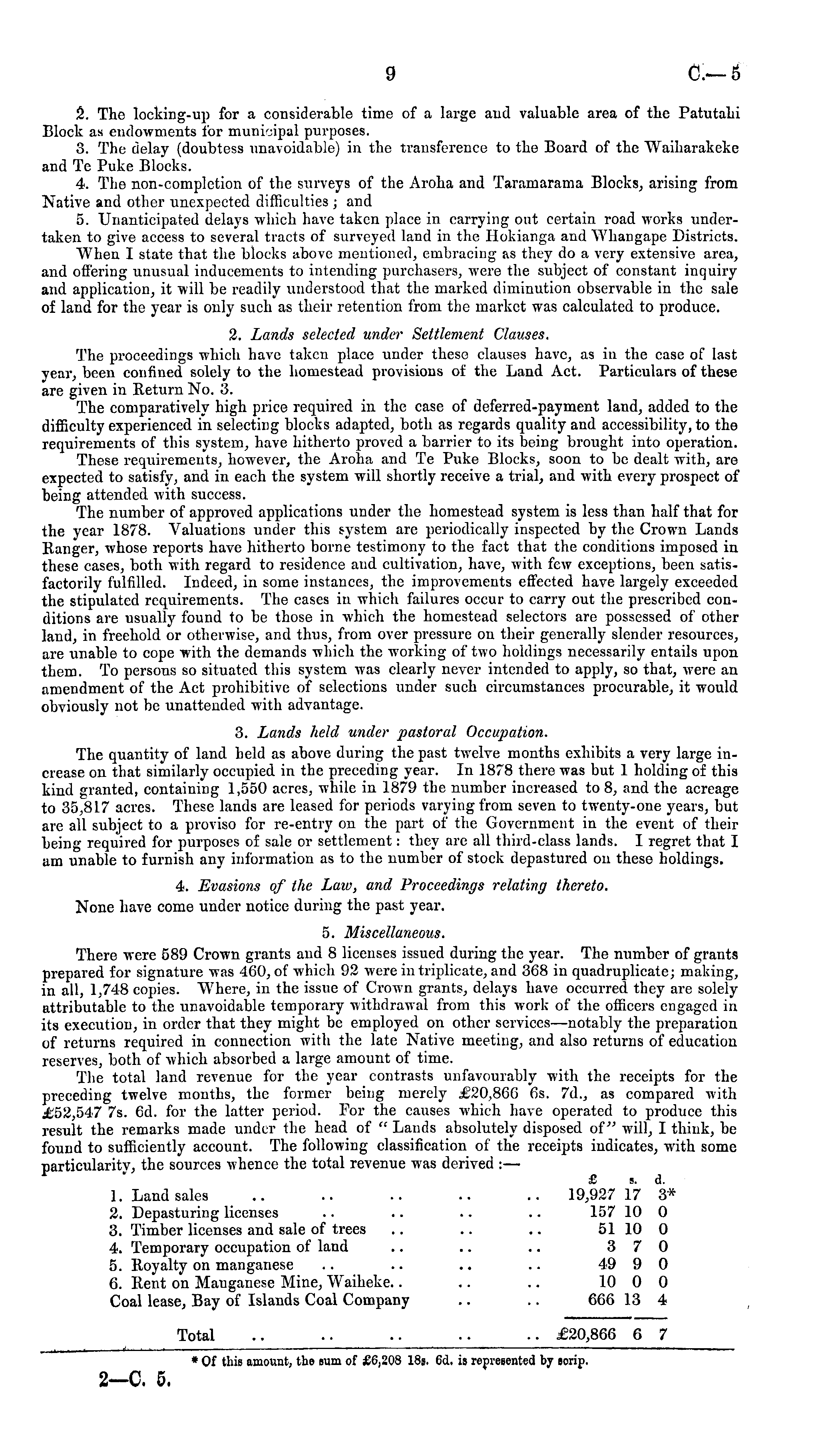 2. The locking-up for a considerable time of a large aud valuable area of the Patutahi Block as endowments for municipal purposes. 3. The delay (doubtess unavoidable) in the transference to the Board of the "Waiharakeke and Te Puke Blocks. 4. Tbe non-completion of tbe surveys of the Aroha and Taramarama Blocks, arising from Native and other unexpected difficulties; and 5. Unanticipated delays which have taken place in carrying out certain road works undertaken to give access to several tracts of surveyed land in the Hokianga and WhaDgape Districts. "When I state that the blocks above mentioned, embracing as they do a very extensive area, and offering unusual inducements to intending purchasers, were the subject of constant inquiry and application, it will be readily understood that the marked diminution observable in the sale of land for the year is only such as their retention from the market was calculated to produce. 2. Lands selected under Settlement Clauses. The proceedings which have taken place under these clauses have, as in the case of last year, been confined solely to the homestead provisions of the Land Act. Particulars of these are given in Return No. 3. The comparatively high price required in the case of deferred-payment land, added to the difficulty experienced in selecting blocks adapted, both as regards quality and accessibility, to tho requirements of tbis system, have hitherto proved a barrier to its being brought into operation. These requirements, however, the Aroha and Te Puke Blocks, soon to be dealt with, are expected to satisfy, and in each the system will shortly receive a trial, and with every prospect of being attended with success. The number of approved applications under tho homestead system is less than half that for the year 1878. Valuations under this system are periodically inspected by the Crown Lands Ranger, whose reports have hitherto borne testimony to the fact that the conditions imposed in these cases, both with regard to residence and cultivation, have, with few exceptions, been satisfactorily fulfilled. Indeed, in some instances, the improvements effected have largely exceeded tbe stipulated requirements. The cases in which failures occur to carry out the prescribed conditions are usually found to be those in which the homestead selectors are possessed of other laud, in freehold or otherwise, and thus, from over pressure on their generally slender resources, are unable to cope with tbe demands which the working of two holdings necessarily entails upon them. To persons so situated this system was clearly never intended to apply, so that, were an amendment of the Act prohibitive of selections under such circumstances procurable, it would obviously not be unattended with advantage. 3. Lands held under pastoral Occupation. The quantity of land held as above during the past twelve months exhibits a very large increase on that similarly occupied in the preceding year. In 1878 there was but 1 holding of this kind granted, containing 1,550 acres, while in 1879 the number increased to 8, and the acreage to 35,817 acres. These lands are leased for periods varying from seven to twenty-one years, but arc all subject to a proviso for re-entry on the part of tbe Government in the event of their being required for purposes of sale or settlement: they are all third-class lands. I regret tbat I am unable to furnish any information as to the number of stock depastured on these holdings. 4. Evasions of the Laiv, and Proceedings relating thereto. None have come under notice during the past year. 5. Miscellaneous. There were 589 Crown grants and 8 licenses issued during tbe year. Tbe number of grants prepared for signature was 460, of which 92 were in triplicate, and 368 in quadruplicate; making, in all, 1,748 copies. "Where, in the issue of Crown grants, delays have occurred tbey are solely attributable to the unavoidable temporary withdrawal from this work of the officers engaged in its execution, in order that they might be employed on other services—notably the preparation of returns required in connection with the late Native meeting, and also returns of education reserves, both of which absorbed a large amount of time. The total land revenue for tbe year contrasts unfavourably with the receipts for the preceding twelve months, the former being merely £20,866 6s. 7d., as compared with £52,547 7s. Cd. for the latter period. For the causes which have operated to produce this result the remarks made under the head of " Lands absolutely disposed of" will, I think, be found to sufficiently account. The following classification of the receipts indicates, with some particularity, the sources whence the total revenue was derived : — £ s. d. 1. Land sales .. .. .. .. .. 19,927 17 3* 2. Depasturing licenses .. .. .. .. 157 10 0 3. Timber licenses and sale of trees .. .. .. 51 10 0 4. Temporary occupation of land .. .. .. 3 7 0 5. Royalty on manganese .. .. .. .. 49 9 0 6. Rent on Manganese Mine, Waikeke.. .. .. 10 0 0 Coal lease, Bay of Islands Coal Company .. .. 666 13 4 Total •• •• •• •• •• £20,866 6 7
