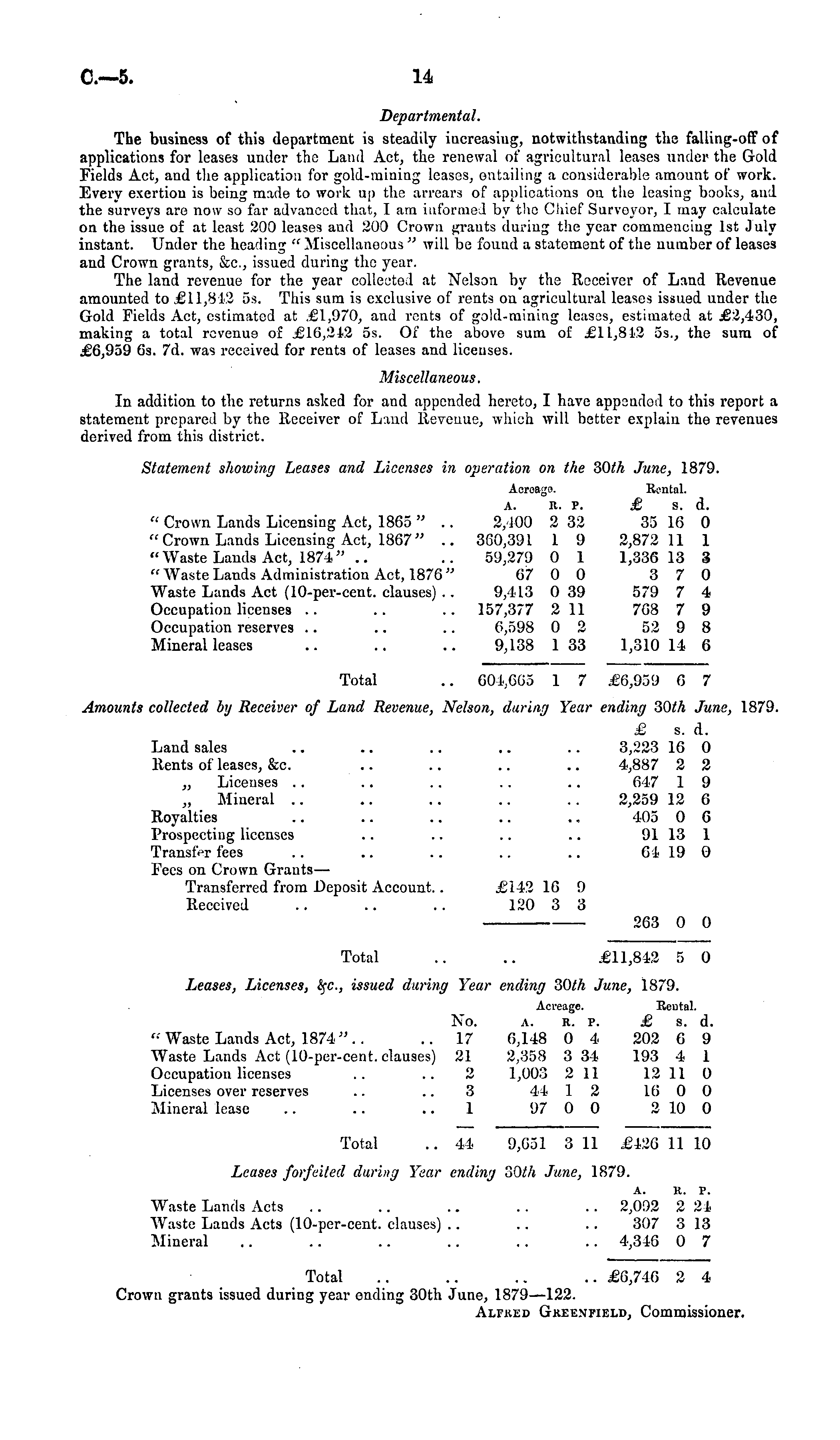 The business of this department is steadily increasing, notwithstanding the falling-off of applications for leases under the Land Act, the renewal of agricultural leases under the Gold Fields Act, and the application for gold-mining leases, entailing a considerable amount of work. Every exertiou is being made to work up the arrears of applications ou the leasing books, and the surveys are now so far advanced that, I am informed by the Chief Surveyor, I may calculate on the issue of at least 200 leases and 200 Crown grants during the year commencing Ist July instant. Under the heading " Miscellaneous " will be found a statement of the number of leases aud Crown grants, &c., issued during the year. The land revenue for the year collected at Nelson by the Receiver of Land Revenue amounted to £11,812 ss. This sura is exclusive of rents on agricultural leases issued under the Gold Fields Act, estimated at £1,970, and rents of gold-mining leases, estimated at £2,130, making a total revenue of £16,242 ss. Of the above sum of £11,812 55., the sum of £6,959 6s. 7d. was received for rents of leases and licenses. Miscellaneous. In addition to the returns asked for and appended hereto, I have appended to this report a statement prepared by the Receiver of Laud Revenue, which will better explain the revenues derived from this district. Statement showing Leases and Licenses in operation on the 30th June, 1879. Acroago. Rental. A. It. P. £ S. d. " Crown Lands Licensing Act, 1865 " .. 2/100 2 32 35 16 0 "Crown Lands Licensing Act, 1867" .. 360,391 1 9 2,872 11 1 "Waste Lands Act, 1874" .. .. 59,279 0 1 1,336 13 3 " Waste Lands Administration Act, 1870 " 67 0 0 3 7 0 Waste Lands Act (10-per-cent. clauses).. 9,413 039 579 7 4 Occupation licenses .. .. .. 157,377 211 768 7 9 Occupation reserves .. .. .. 6,598 0 2 52 9 8 Mineral leases .. .. .. 9,138 1 33 1,310 14 6 Total .. 601,665 1 7 £6,959 6 7 Amounts collected by Receiver of Land Revenue, Nelson, during Year ending 30th June, 1879. £ s. d. Land sales .. .. .. .. .. 3,223 16 0 Rents of leases, &c. .. .. .. .. 4,887 2 2 „ Licenses . . .. .. .. .. 647 1 9 Mineral .. .. .. .. .. 2,259 1.2 6 Royalties .. .. .. .. .. 405 0 6 Prospecting licenses .. .. .. .. 91 13 I Transfer fees .. .. .. .. .. 61 19 0 Fees on Crown Grants — Transferred from Deposit Account.. £142 16 9 Received .. .. .. 120 3 3 263 0 0 Total .. .. £11,812 5 0 Leases, Licenses, fyc, issued during Year ending 30th June, 1879. Acreage. Rental. No. A. R. P. £ S. d. "Waste Lands Act, 1874".. .. 17 6,148 0 4 202 6 9 Waste Lands Act (10-per-eent. clauses) 21 2,358 334 193 4 1 Occupation licenses .. .. 2 1,003 211 12 11 0 Licenses over reserves .. .. 3 1112 16 0 0 Mineral lease .. .. 1 97 0 0 2 10 0 Total .. 44 9,651 311 £426 1110 Leases forfeited during Year ending 30th June, 1879. A. E. P. Waste Lands Acts .. .. .. .. .. 2,092 224 Waste Lands Acts (10-per-cent. clauses) .. .. .. 307 3 13 Mineral .. .. .. .. .. .. 4,316 0 7 Total .. .. .. .. £6,746 2 4 Crown grants issued during year ending 30th June, 1879—122. Alfred Greenfield, Commissioner.