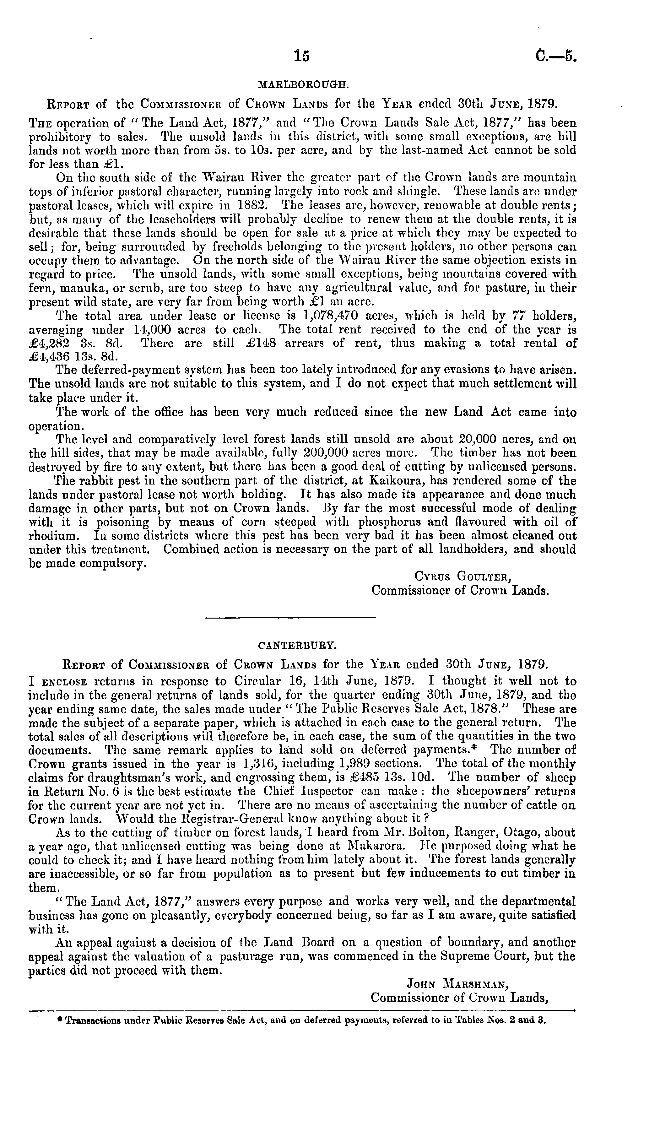 MARLBOROUGH. Report of the Commissioner of Crown Lands for the Year ended 30th June, 1879. The operation of "The Land Act, 1877," and "The Crown Lands Sale Act, 1877," has been prohibitory to sales. The unsold lands in this district, with some small exceptions, are bill lands not worth more than from ss. to 10s. per acre, and by the last-named Act cannot be sold for less than £1. On the south side of the Wairau River the greater part of the Crown lands arc mountain tops of inferior pastoral character, running largely into rock and shingle. These lands are under pastoral leases, which will expire in 1882. Tbe leases are, however, renewable at double rents; but, as many of the leaseholders will probably decline to renew them at the double rents, it is desirable that these lands should be open for sale at a price at which they may be expected to sell; for, being surrounded by freeholds belonging to tbe present holders, no other persons can occupy them to advantage. On the north side of the Wairau River the same objection exists in regard to price. The unsold lands, with some small exceptions, being mountains covered with fern, manuka, or scrub, arc too steep to have any agricultural value, and for pasture, in their present wild state, are very far from being worth £1 an acre. The total area under lease or license is 1,078,470 acres, which is held by 77 holders, averaging under 14,000 acres to each. The total rent received to the end of the year is £4,282 3s. Bd. There are still £148 arrears of rent, thus making a total rental of £1,436 13s. Bd. The deferred-payment system has been too lately introduced for any evasions to have arisen. The unsold lauds are not suitable to this system, and I do not expect that much settlement will take place under it. The work of the office has been very much reduced since the new Land Act came into operation. The level and comparatively level forest lands still unsold are about 20,000 acres, and on the hill sides, that may be made available, fully 200,000 acres more. The timber has not been destroyed by fire to any extent, but there has been a good deal of cutting by unlicensed persons. The rabbit pest in the southern part of the district, at Kaikoura, has rendered some of the lands under pastoral lease not worth holding. It has also made its appearance and done much damage in other parts, but not on Crown lands. By far the most successful mode of dealing with it is poisoning by means of corn steeped with phosphorus and flavoured with oil of rhodium. Iv some districts where tbis pest has been very bad it has been almost cleaned out under this treatment. Combined action is necessary on tbe part of all landholders, and should be made compulsory. Cyrus Goulter, Commissioner of Crown Lands.