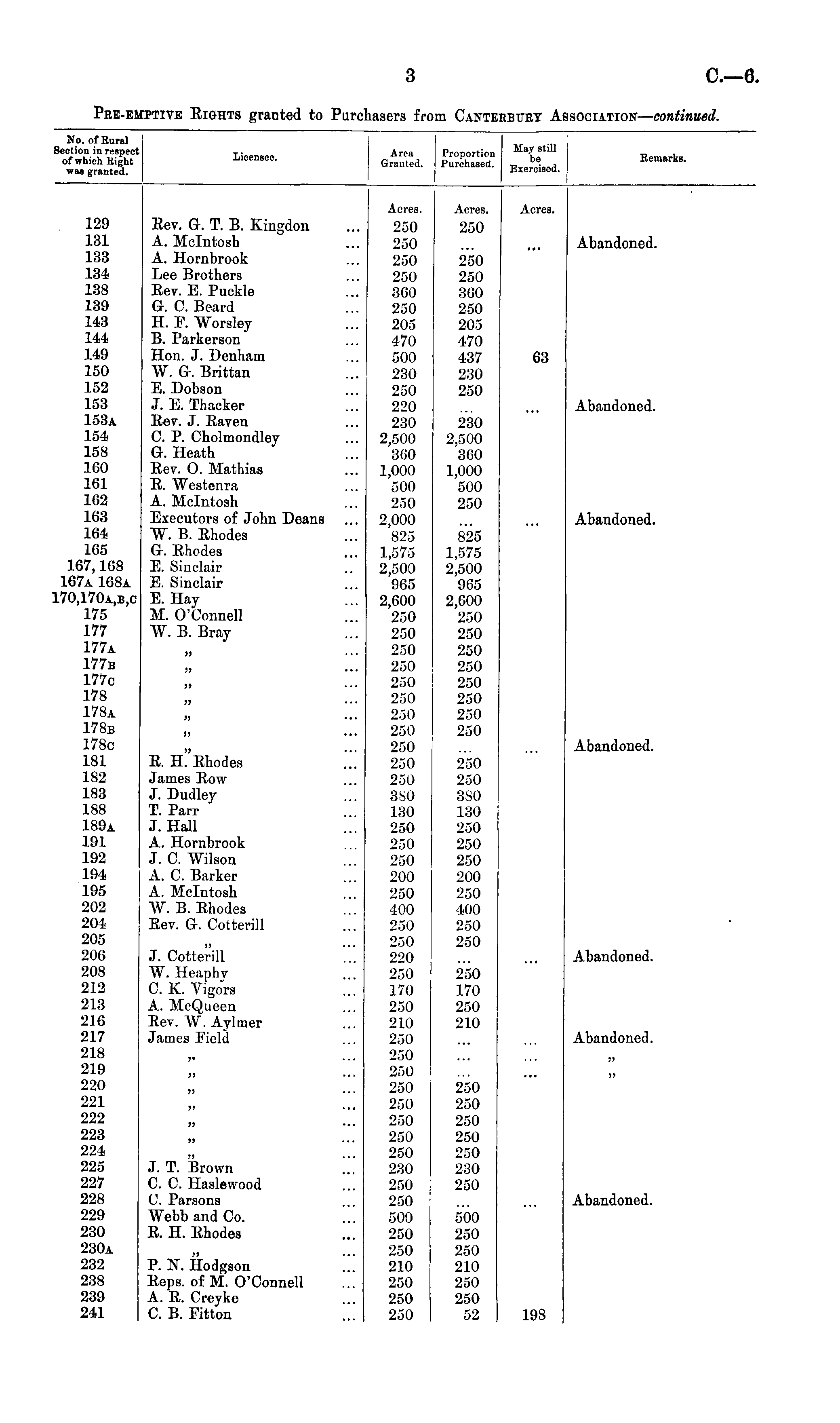 Pre-emptive Eights granted to Purchasers from Canteebuey Association— continued. No. of Rural I Section in lvsnect t- Ari>a Prnnnrtinn May StUl ofwhichKi|ht L.eeosee. ££§«£» be Bemarka. was granted. JSxerciaea. Acres. Acres. Acres. . 129 Eev. G. T. B. Kingdon ... 250 250 131 A. Mclntosb ... 250 ... ... Abandoned. 133 A. Hornbrook ... 250 250 134 Lee Brothers ... 250 250 138 Eev. E. Puckle ... 3G0 3G0 139 G. C. Beard ... 250 250 143 H. F. Worsley ... 205 205 144 B. Parkerson ... 470 470 149 Hon. J. Denham ... 500 437 63 150 W. Gr. Brittan ... 230 230 152 E. Dobson ... 250 250 153 J. E. Thacker ... 220 ... ... Abandoned. 153a Eev. J. Eaven ... 230 230 154 C. P. Cholmondley ... 2,500 2,500 158 Gr. Heath ... 300 3G0 160 Eev. O. Mathias ... 1,000 1,000 161 E. Westenra ... 500 500 162 A. Mclntosh ... 250 250 163 Executors of John Deans ... 2,000 ... ... Abandoned. 164 W. B. Ehodes ... 825 825 165 Gr. Ehodes ... 1,575 1,575 167,168 E. Sinclair .. 2,500 2,500 167a 168a E. Sinclair ... 965 965 170,170a,b,c E. Hay ... 2,600 2,600 175 M. O'Connell ... 250 250 177 W. B. Bray ... 250 250 177a „ ... 250 250 177b „ ... 250 250 177c „ ... 250 250 178 „ ... 250 250 178a „ ... 250 250 178b „ ... 250 250 178c „ ... 250 ... . . Abandoned. 181 E. H. Ehodes ... 250 250 182 James Eow ... 250 250 183 J. Dudley ... 3S0 380 188 T. Parr ... 130 130 1S9a J. Hall ... 250 250 191 A. Hornbrook ... 250 250 192 J.C.Wilson ... 250 250 194 A. C. Barker ... 200 200 195 A. Mclntosh 250 250 202 W. B. Ehodes ... 400 400 204 Eev. G. Cotterill ... 250 250 205 „ ... 250 250 206 J. Cotterill . 220 . . .. Abandoned. 208 W. Heaphy ... 250 250 212 C. K. Vigors ... 170 170 213 A. McQueen ... 250 250 216 Eev. W. Aylmer ... 210 210 217 James Field ... 250 ... . Abandoned. 218 „ ... 250 219 „ ... 250 220 „ ... 250 250 221 „ ... 250 250 222 „ ... 250 250 223 „ ... 250 250 224 „ ... 250 250 225 J. T. Brown ... 230 230 227 C. C. Haslewood ... 250 250 228 U. Parsons ... 250 ... Abandoned. 229 Webb and Co. ... 500 500 230 E. H. Ehodes ... 250 250 230a „ ... 250 250 232 P. ]N T. Hodgson ... 210 210 238 Eeps. of M. O'Connell ... 250 250 239 A. E. Creyke ... 250 250 241 C. B. Fitton ... 250 52 198