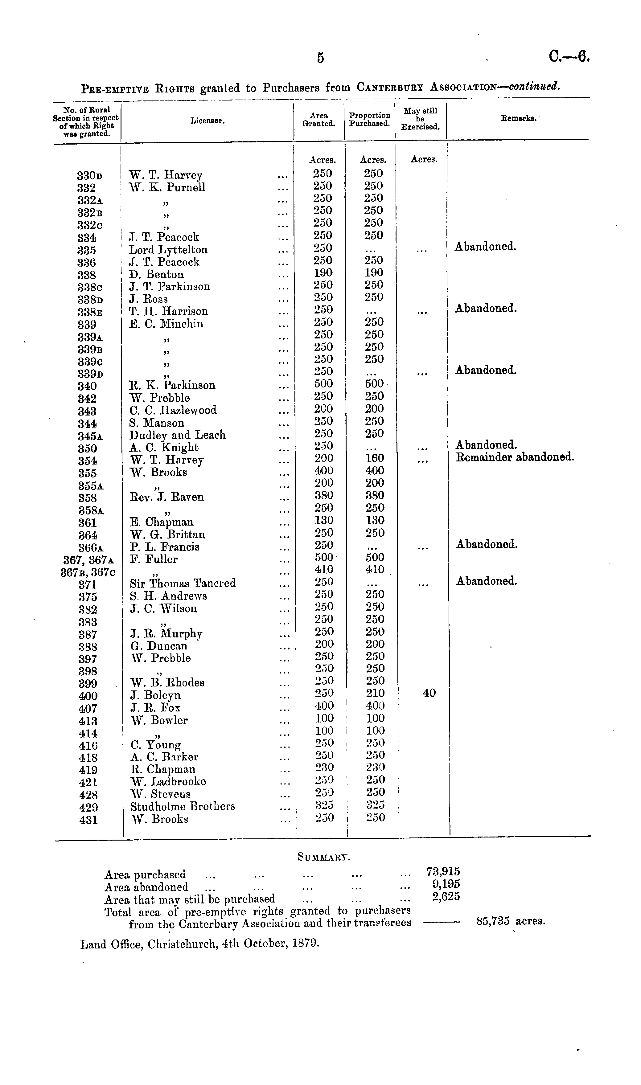 Summary. Area purchased ... ... ... ... •■• <3,915 Area abandoned ... ... ... ■■• •■• 9,195 Area that may still be purchased ... ... ■•• 2,G25 Total area of pre-emptive rights granted to purchasers from the Canterbury Association aud their transferees 85,735 acres. Laud Office, Christchurch, 4th October, 1879.