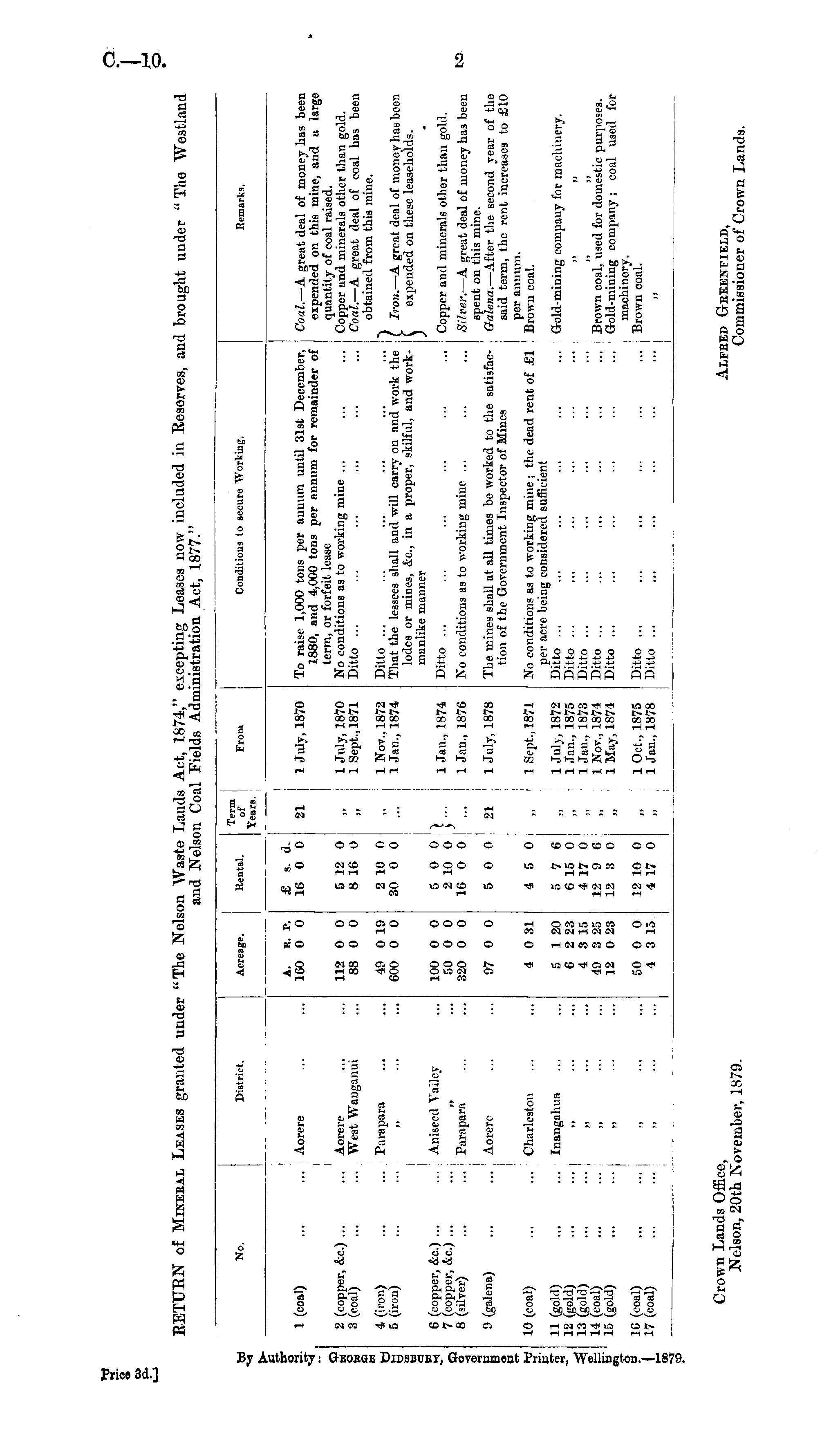 Crown Lands Office, Aifeed Gteeenfield, Nelson, 20th November, 1S79. Commissioner of Crowa Lands.