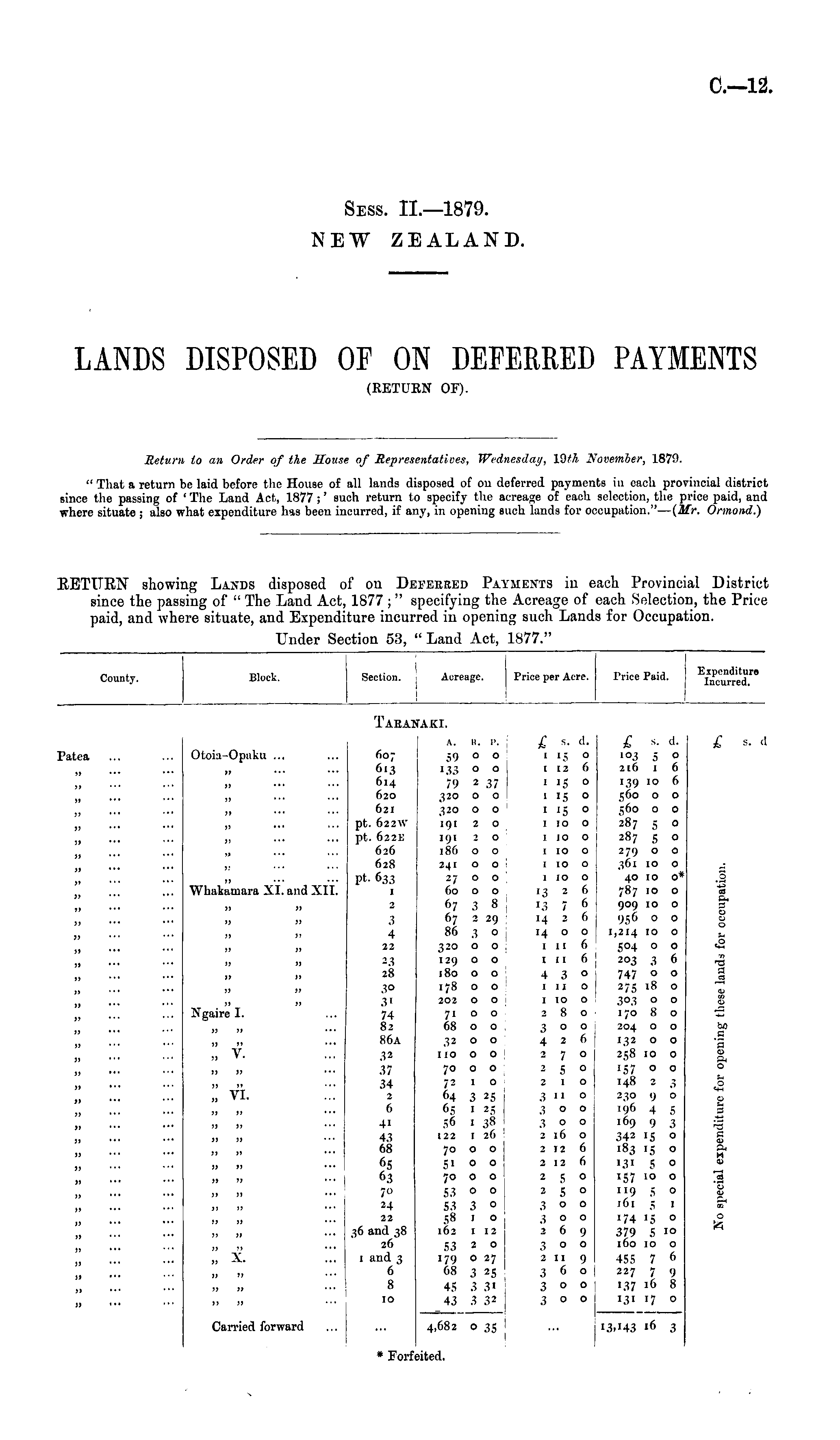 " That a return be laid before the House of all lands disposed of on deferred payments in each provincial district since the passing of ' The Land Act, 1877;' such return to specify the acreage of each selection, the price paid, and where situate ; also what expenditure has been incurred, if any, in opening such lands for occupation."— (Mr. Ormond.)