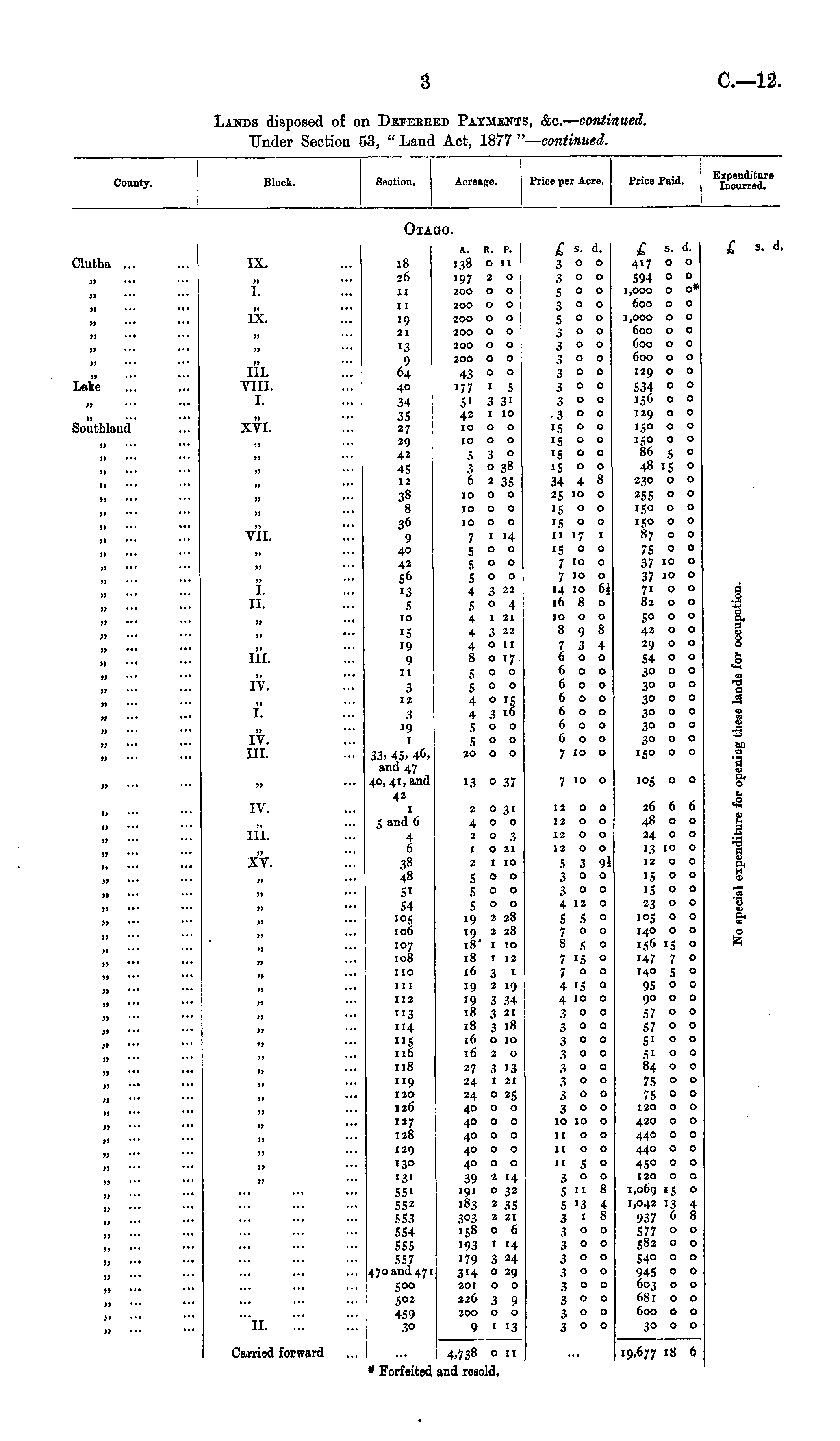 County. Block. Section. Acreage. Price per Acre. Price Paid. Expenditure Incurred. Otai .GO. Clutha ... JJ •«• J) JJ >J •«• JJ ••• Late jj ii ... Southland jj u ••■ jj ••• jj j> ■•• IX. JJ I. IX. JJ JJ III. VIII. I. XVI. )J JJ JJ 11 11 18 26 11 11 19 21 13 9 64 40 34 35 27 29 42 45 12 38 8 36 9 40 42 56 13 5 10 15 19 9 11 A. R. P. 138 O II 197 2 0 200 o o 200 0 O 200 o o 200 o o 200 O O 200 O O 43 o o 177 1 s 51 3 31 42 1 10 10 o o 1000 530 3 ° 38 6 2 35 10 o o 1000 1000 7 1 14 S o o goo 500 4 3 22 5 ° 4 4 1 21 4 3 22 4 o 11 8 o 17 5 o o 500 4 o 15 4 3 16 goo 500 20 O O £ »• d. 3 ° ° 300 500 300 S o o 300 300 300 300 300 300 3 ° o IS 00 15 o o IS o o 15 o o 34 4 8 25 10 o IS o o IS o o 11 17 1 15 ° ° 7 10 o 7 10 o 14 10 6; 16 8 o 1000 898 7 3 4 600 600 600 600 600 600 600 7 10 o £ s. d. 417 o o 594 o ° 1,000 o o* 600 o o 1,000 o o 600 o o 600 o o 600 o o 129 o o 534 ° ° 156 o o 129 o o 150 o o 150 o o 86 5 o 48 15 o 230 o o 255 ° ° 150 o o ISO o o 87 o o 75 o o 37 i° ° 37 i° ° 7100 82 o o 50 o o 42 o o 29 o o 54 o ° 3° ° ° 30 o o 3° ° ° 30 o o 30 o o 30 o o 150 o o £ s. d. jj 11 jj v'ii. j» jj ii ... jj jj j, jj i. ii. .2 -_-- 7_ a o o o '-H a DO fl JB o on I tL fl | o f U s B 1 o I *-• .2 'o I 09 o d. jj jj *•• JJ jj 11 jj ••• JJ III. jj ■•• >j IV. 3 12 3 19 1 33i 45. 46, and 47 40, 41, and 42 1 5 and 6 JJ JJ JJ I. JJ J) JJ IV. III. JJ JJ M 13 o 37 7 10 o 105 o o )J IV. 2 0 31 400 203 1 0 21 2 I IO S O O 5OO S o o 19 2 28 19 2 28 18' 1 10 18 1 12 16 3 1 19 2 19 •9 3 34 18 3 21 18 3 18 16 o 10 1620 27 3 13 24 1 21 24 O 2S 40 o o 40 o o 40 o o 40 o o 40 o o 39 2 14 191 o 32 183 2 35 303 2 21 158 o 6 193 1 14 179 3 24 1 314 o 29 201 o o 226 3 9 200 o o 9 1 13 i 4.738 o 11 1 and resold. 12 OO 26 6 6 48 o o 24 o o 13 IO o 1200 J) JJ JJ ••• JJ JJ ••• JJ J, ... »> 11 ••■ JJ JJ *•* JJ JJ JJ JJ it jj j» jj •*• III. JJ XV. 11 11 11 11 11 11 JJ JJ J> JJ 11 11 11 JJ JJ JJ 4 6 38 48 51 54 i°5 106 107 108 no in 112 "3 114 "5 116 118 119 120 126 127 128 129 130 131 55i 552 553 554 555 557 470 and 471 500 502 459 30 12 OO I2 0 0 12 OO 5 3 9* 300 300 4 12 o 5 8 0 700 850 7 15 o 700 4 15 ° 4 10 o 300 300 300 300 300 3O0 300 300 10 10 o 11 o o 1100 11 5 ° 300 5 11 8 5 13 4 3 1 8 300 300 300 goo 300 300 300 300 15 o o 15 o o 23 o o 105 o o 140 o o I56 '5 ° 147 7 o 14° 5 ° 95 o o 90 o o 57 o o 57 o o 51 ° ° 51 0 o 84 o o 75 o o 75 ° o 120 o o 420 o o 440 o o 440 o o 450 o o 120 O O 1,069 15 o 1,042 13 4 937 6 8 577 ° o 582 o o 540 o o 945 0 o 603 o o 681 00 600 o o 30 o o 19,677 18 6 j» ••' it JJ ii JJ 11 J» H JJ ii JJ jj II jj JJ jj jj jj jj jj '*• U jj 11 jj ••• jj "*II. '.'.', ij Carried forward * Forfeited