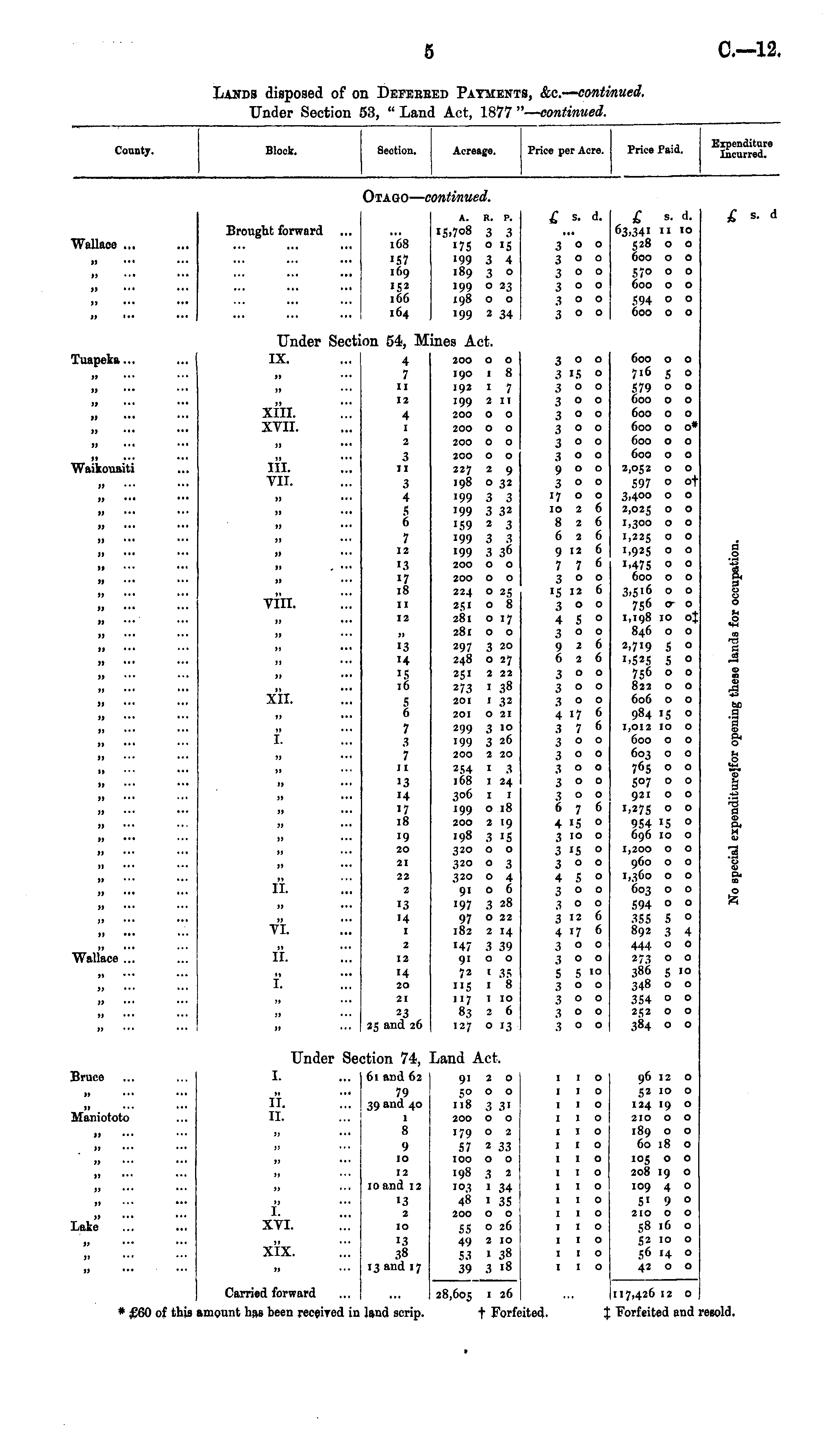 County. Block. Section. Acreage. Price per Acre. Price Paid. Expenditure Incurred. Otago— 1 •ontinued. Vallace ... »j ••• jj ••■ ••• Brought forward "168 157 169 •52 166 164 A. R. P. 15.708 3 3 175 ° 15 199 3 4 189 3 o 199 ° 23 198 o o 199 2 34 £ s- d. 300 300 300 300 300 300 £ .. d. 63,341 11 10 528 o o 600 o o 570 o o 600 o o 594 o o 600 o o £ *• d ,j ... ii ... ... u '•• ■•• fuapeka... Under Secti 'on 54, Ivj ines Act. 300 3 15 o goo 300 300 300 300 300 900 300 1700 1026 826 6 2 6 9 12 6 7 7 6 300 15 12 ° 300 4 5° 300 926 626 300 300 300 4 17 6 3 7 6 300 300 300 300 300 6 7 6 4 IS o 3 10 o 3 15 o 300 4 5° goo 300 3 12 6 4 17 6 300 300 5 5 10 300 goo 300 300 600 o o 716 5 o 579 0 o 600 o o 600 o o 600 o o* 600 o o 600 o o 2,052 o o 597 o of 3,400 o o 2,025 ° ° 1,300 o o 1,225 ° ° 1,925 o o 1,475 ° ° 600 o o 3,516 o o 756 o o 1,198 10 oj 846 o o 2,719 s o 1.525 5 ° 756 o o 822 o o 606 o o 984 15 o 1,012 10 o 600 o o 603 o o 765 o o 507 ° ° 921 o o 1,275 ° ° 954 15 ° 696 10 o 1,200 o o 960 o o 1,360 o o 603 o o 594 o ° 355 5 o 892 3 4 444 o o 273 o o 386 s 10 348 o o 354 o ° 252 o o 384 o o IX. JJ 4 7 11 12 200 o o 190 1 8 192 1 7 199 2 11 200 o o JJ xiii. '.'.'. XVII. 4 1 2 3 11 200 o o 200 0 0 11 »« Vaikouaiti JJ »•• III. VII. JJ '•■ JJ ••• JJ ••' JJ 3 4 5 6 7 12 13 17 18 11 200 o o 227 2 9 198 o 32 '99 3 3 199 3 32 159 2 3 199 3 3 '99 3 36 200 o o 200 o o 224 o 25 251 o 8 281 o 17 281 o o d a o 6 o ■n m E & o I r-t & _ 4_i B o & g <_J 'o o> po N JJ ••• JJ „ ••• JJ viii. '.'.'. jj ♦•• 12 jj j, ••• j, jj ••• jj ••• XII. 13 14 15 16 5 6 7 3 7 11 297 3 20 248 o 27 251 2 22 273 I 38 201 I 32 20I O 21 299 3 10 199 3 26 200 2 20 It ... I. JJ JJ JJ JJ ••• JJ ••• )J JJ JJ ,, JJ II. JJ 13 14 17 18 19 20 21 22 2 13 14 1 254 1 3 168 1 24 306 1 1 199 o 18 200 2 19 198 3 15 320 o o 320 o 3 320 o 4 9106 197 3 28 97 o 22 182 2 14 147 3 39 91 o o 72 1 35 115 1 8 117 1 10 83 2 6 127 o 13 JJ ••• VI. fVallace ... 11 •■• II. 2 J) ... I. 12 14 20 JJ JJ 21 23 25 and 26 JJ Jruce Under Se> I. 11. 11. ction 74, I 6r and 62 79 '■ 39 and 40 1 8 Land Act. 91 2 o 50 o o 118 3 31 200 o o 179 O 2 57 2 33 100 o o 198 3 2 i°3 1 34 48 1 35 200 o o 55 o 26 49 2 10 53 1 38 39 3 18 28,605 1 26 I I o 1 1 o I I o I I o I I o 96 12 O 52 10 o 124 19 o 210 o o 189 o o 60 18 o bfaniototo jj ••• ••* 11 ••• jj ••• ••• „ 9 10 I I o I I o jj ••• ••• » jj ■*■ *•■ jj ■•• ••• a _ake j» ••• *•• jj j, j. I. '..'. XVI. 12 10 and 12 13 2 10 13 38 13 and 17 I I o I I o 1 I o I I o I I o I I o I I o 105 o o 208 19 o 109 4 o 5i 9 ° 210 o o 58 16 o 52 IO o 56 14 o 42 O O xix. ;;; jj ••* •■• jj ••* *•• I I o Carried forward 117,42^ I2 o Forfeited and * £60 of this amount has been received in land scrip. t Forf< _ted. •esold. .