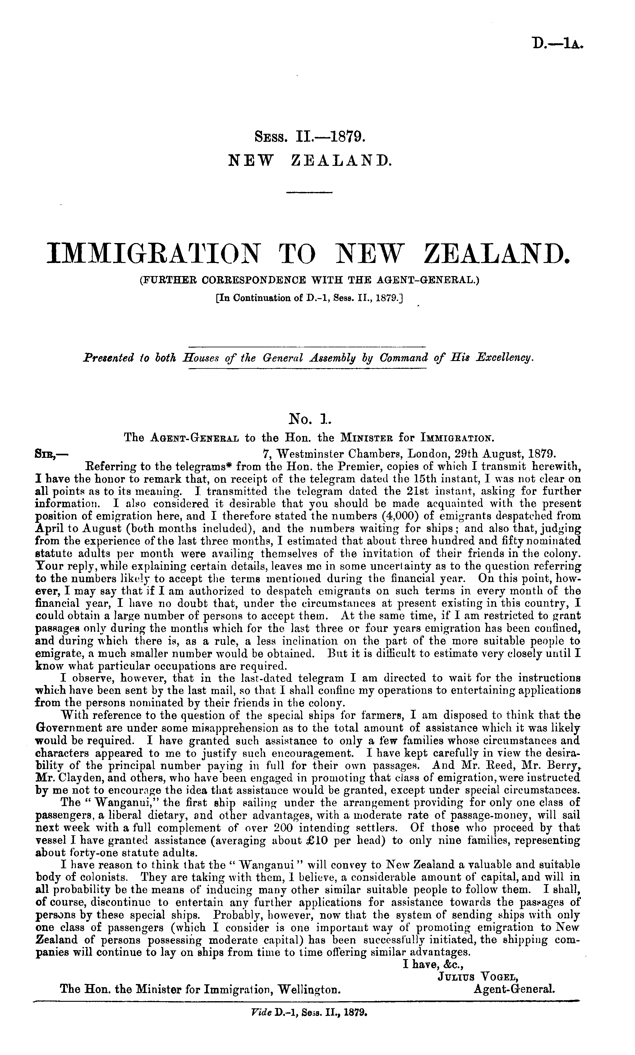 No. 1. The Agent-General to the Hon. the Minister for Immigration. Sir, — 7, "Westminster Chambers, London, 29th August, 1879. Referring to the telegrams* from the Hon. the Premier, copies of which I transmit herewith, I have the honor to remark that, on receipt of the telegram dated the 15th instant, I was not clear on all points as to its meaning. I transmitted the telegram dated the 21st instant, asking for further information. I also considered it desirable that you should be made acquainted with the present position of emigration here, and I therefore stated the numbers (4,000) of emigrants despatched from April to August (both months irrcluded), and the numbers waiting for ships; and also that, judging from the experience of tire last three months, I estimated that about three hundred and fifty nominated statute adults per month were availing themselves of the invitation of their friends in the colony. Tour reply, while explaining certain details, leaves me in some uncertainty as to the question referring to the numbers likely to accept the terms mentioned during the financial year. On this point, however, I may say that if I am authorized to despatch emigrants on such terms in every month of the financial year, I have no doubt that, under the circumstances at present existing in this country, I could obtain a large number of persons to accept them. At the same time, if lam restricted to grant passages only during the months which for the last three or four years emigration has been confined, and during which there is, as a rule, a less inclination on the part of the more suitable people to emigrate, a much smaller number would be obtained. But it is difficult to estimate very closely until I know what particular occupations are required. I observe, however, that in the last-dated telegram I am directed to wait for the instructions which have been sent by the last mail, so that I shall confine my operations to entertaining applications from the persons nominated by their friends in the colony. With reference to the question of the special ships for farmers, I am disposed to think that the Government are under some misapprehension as to the total amount of assistance which it was likely would be required. I have granted such assistance to only a few families whose circumstances and characters appeared to me to justify such encouragement. I have kept carefully in view the desirability of the principal number paying irr full for their own passages. And Mr. Reed, Mr. Berry, Mr. Clayden, and others, who have been engaged in promoting that class of emigration, were instructed by me not to encourage the idea tlrat assistance would be granted, except under special circumstances. The " "Wanganui," the first ship sailing under the arrangement providing for only one class of passengers, a liberal dietary, and other advantages, with a moderate rate of passage-money, will sail next week with a full complement of over 200 intending settlers. Of those who proceed by that vessel I have granted assistance (averaging about £10 per head) to only nine families, representing about forty-one statute adults. I have reason to think that the " Wanganui" will convey to New Zealand a valuable and suitable body of colonists. They are taking with them, 1 believe, a considerable amount of capital, and will in all probability be the means of inducing many other similar suitable people to follow them. I shall, of course, discontinue to entertain any further applications for assistance towards the passages of persons by these special ships. Probably, however, now that the system of sending ships with only one class of passengers (which I consider is one important way of promoting emigration to New Zealand of persons possessing moderate capital) has been successfully initiated, the shipping companies will continue to lay on ships from time to lime offering similar advantages. I have, &c, Julius "Vogel, The Hon. the Minister for Immigration, "Wellington. Agent-General.