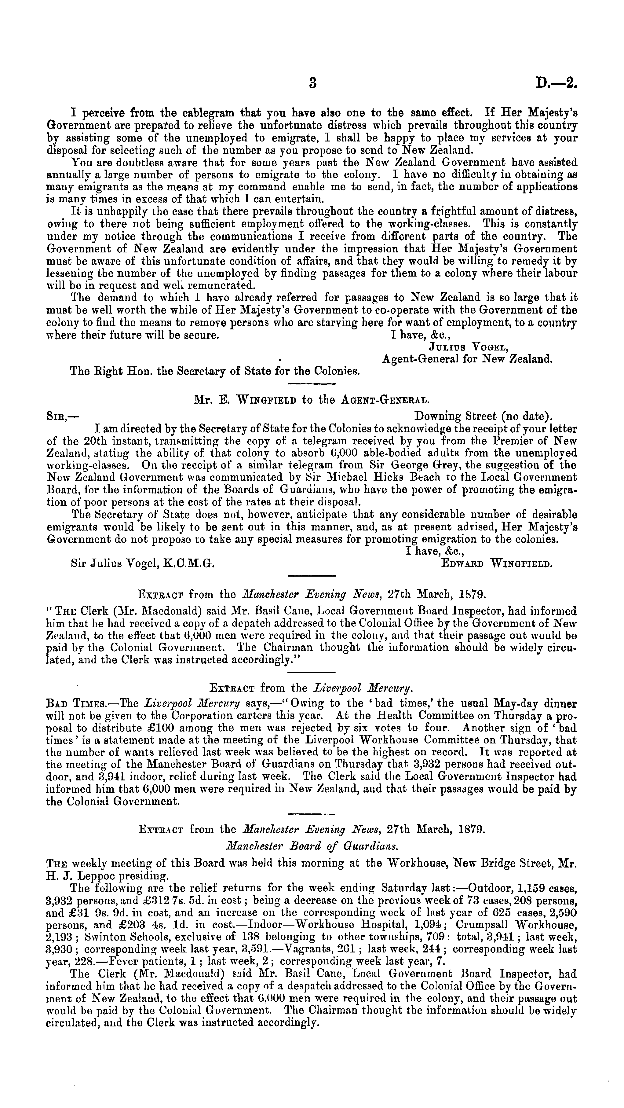 Mr. E. Wingfield to the Agent-General. Sib, — Downing Street (no date). I am directed by the Secretary of State for the Colonies to acknowledge the receipt of your letter of the 20th instant, transmitting the copy of a telegram received by you from the Premier of New Zealand, stating the ability of that colony to absorb 6,000 able-bodied adults from the unemployed working-classes. Orr the receipt of a similar telegram from Sir George Grey, the suggestion of the New Zealand Government was communicated by Sir Michael Hicks Beach to the Local Government Board, for the information of the Boards of Guardians, who have the power of promoting the emigration of poor persons at the cost of the rates at their disposal. The Secretary of State does not, however, anticipate that any considerable number of desirablo emigrants would be likely to be sent out in this manner, and, as at present advised, Her Majesty's Goverirment do not propose to take any special measures for promoting emigration to the colonies. I have, &c, Sir Julius Vogel, K.C.M.G. Edwabd Wingfield.