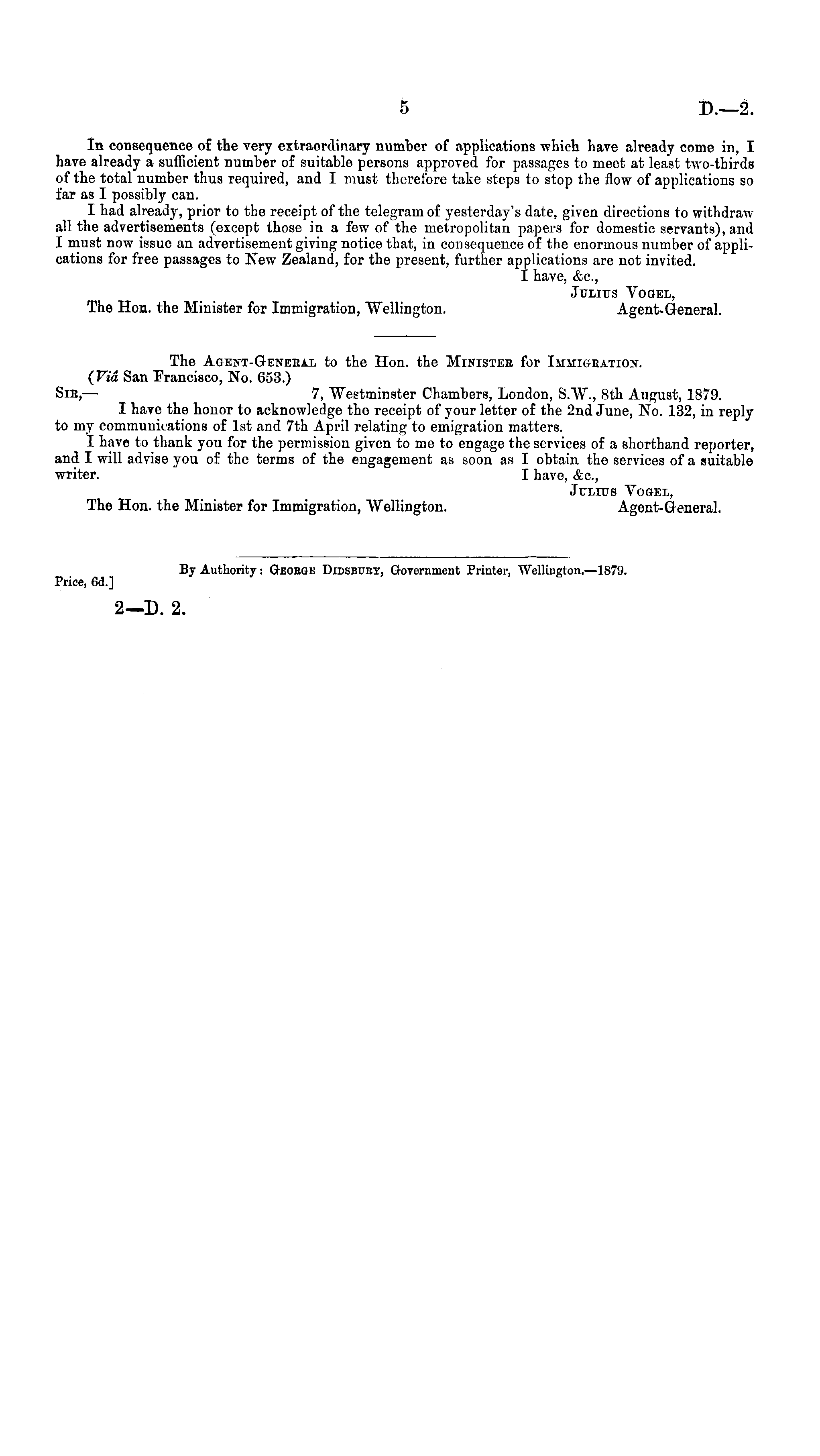 The Agent-Genebal to the Hon. the Ministee for Immigeation. (Via San Francisco, No. 653.) Sib, — 7, Westminster Chambers, London, S.W., Bth August, 1879. I have the honor to acknowledge the receipt of your letter of the 2nd June, No. 132, in reply to my communications of Ist and 7th April relating to emigration matters. I have to thank you for the permission given to me to engage the services of a shorthand reporter, and I will advise you of the terms of the engagement as soon as I obtain the services of a suitable writer. I have, &c, Julius Vogel, The Hon. the Minister for Immigration, Wellington. Agent-General.