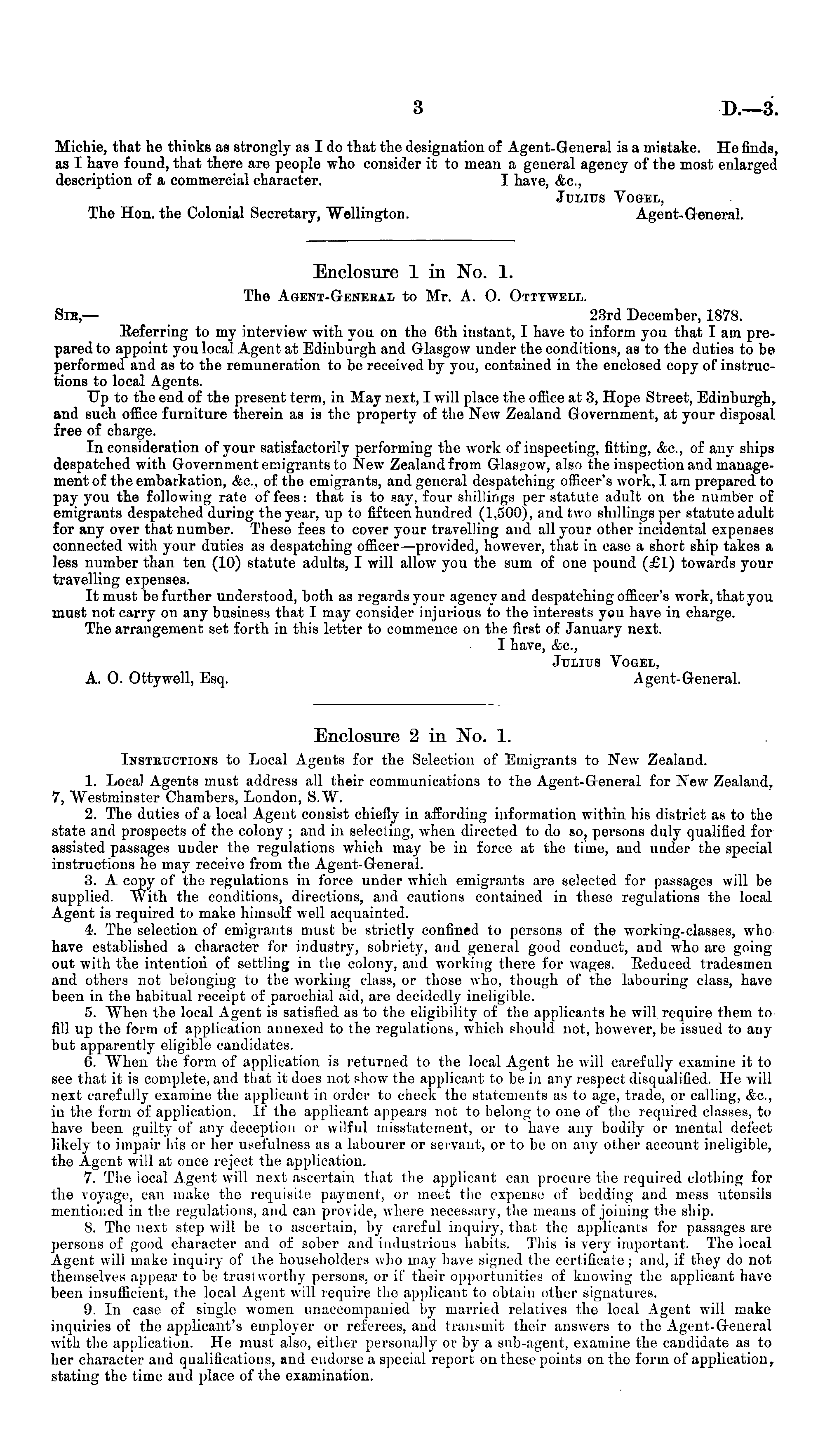 Enclosure 1 in No. 1. The Agent-Geneeal to Mr. A. O. Otttwell. Sib,— 23rd December, 1878. Eeferring to my interview with you on the 6th instant, I have to inform you that I am prepared to appoint you local Ageirt at Edinburgh and Glasgow under the conditions, as to the duties to be performed and as to the remuneration to be received by you, contained in the enclosed copy of instructions to local Agents. Up to the end of the present term, in May next, I will place the office at 3, Hope Street, Edinburgh, and such office furniture therein as is the property of the New Zealand Government, at your disposal free of charge. In consideration of your satisfactorily performing the work of inspecting, fitting, &c, of any ships despatched with Government emigrants to New Zealand from Glasgow, also the inspection and management of the embarkation, &c, of the emigrants, and general despatching officer's work, I am prepared to pay you the following rate of fees: that is to say, four shillings per statute adult on the number of emigrants despatched during the year, up to fifteen hundred (1,500), and two shillings per statute adult for any over that number. These fees to cover your travelling aird all your other incidental expenses connected with your duties as despatching officer —provided, however, that in case a short ship takes a less number than ten (10) statute adults, I will allow you the sum of one pound (£1) towards your travelling expenses. It must be further understood, both as regards your agency and despatching officer's work, that you must not carry on any business that I may consider injurious to the interests you have in charge. The arrangement set forth in this letter to commence on the first of January next. I have, &c, Julius Vogel, A. 0. Ottywell, Esq. Agent-General.
