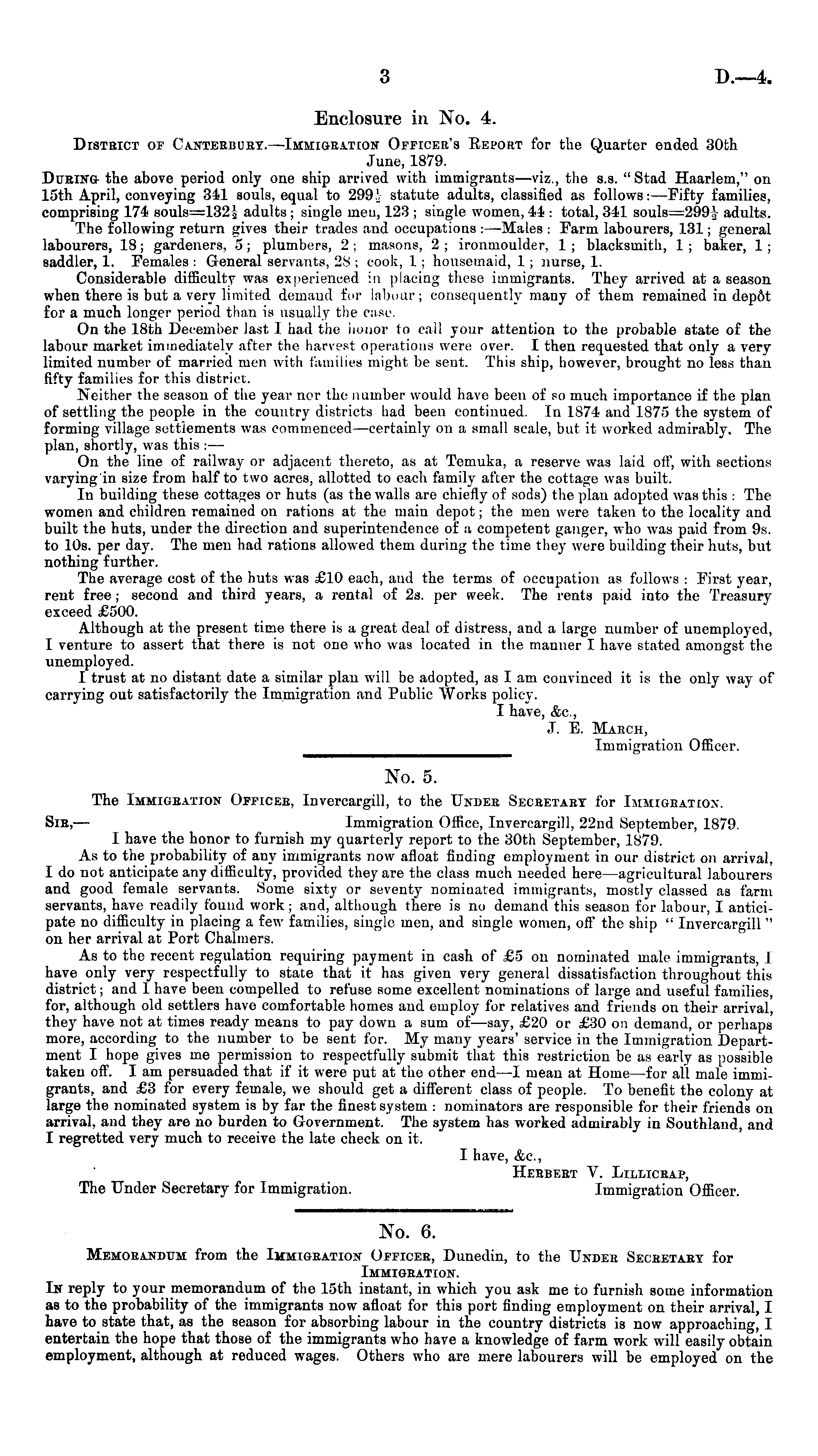 No. 6. Memorandum from the Immigration Officer, Dunedin, to the Under Secretary for Immigration. In reply to your memorandum of the 15th instant, in which you ask me to furnish some information as to the probability of the immigrants now afloat for this port finding employment on their arrival, I have to state that, as the season for absorbing labour in the country districts is now approaching, I entertain the hope that those of the immigrants who have a knowledge of farm work will easily obtain employment, although at reduced wages. Others who are mere labourers will be employed on the