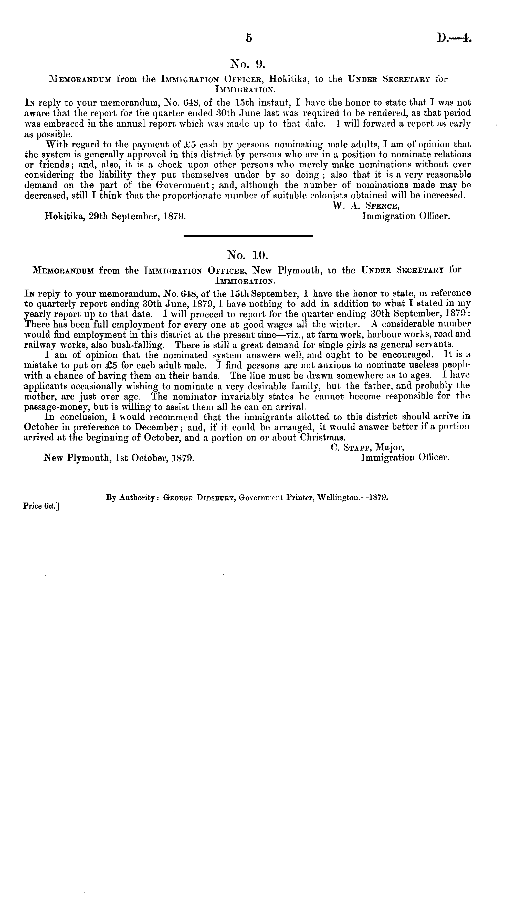No. 10. Memorandum from the Immigration Officer, New Plymouth, to the Under Secretary for Immigration. In reply to your memorandum, No. 648, of the 15th September, I have the honor to state, in reference to quarterly report ending 30th June, 1579, I have nothing to add in addition to what I stated in my yearly report up to that date. I will proceed to report for the quarter ending 30th September, ] 879 : There has been full employment for every one at good wages all the winter. A considerable number would find employment in this district at the present time —viz., at farm work, harbour works, road and railway works, also bush-falling. There is still a great demand for single girls as general servants. I am of opinion that the nominated system answers well, and ought to be encouraged. It is a mistake to put on £5 for each adult male. I find persons are not anxious to nominate useless people with a chance of having them on their hands. The line must be drawn somewhere as to ages. I have applicants occasionally wishing to nominate a very desirable family, but the father, and probably the mother, are just over age. The nominator invariably states he cannot become responsible for the passage-money, but is willing to assist them all he can on arrival. In conclusion, I would recommend that the immigrants allotted to this district should arrive in October in preference to December ; and, if it could be arranged, it would answer better if a portion arrived at the beginning of October, and a portion on or about Christmas. C. Stapp, Major, New Plymouth, Ist October, 1879. Immigration Officer.