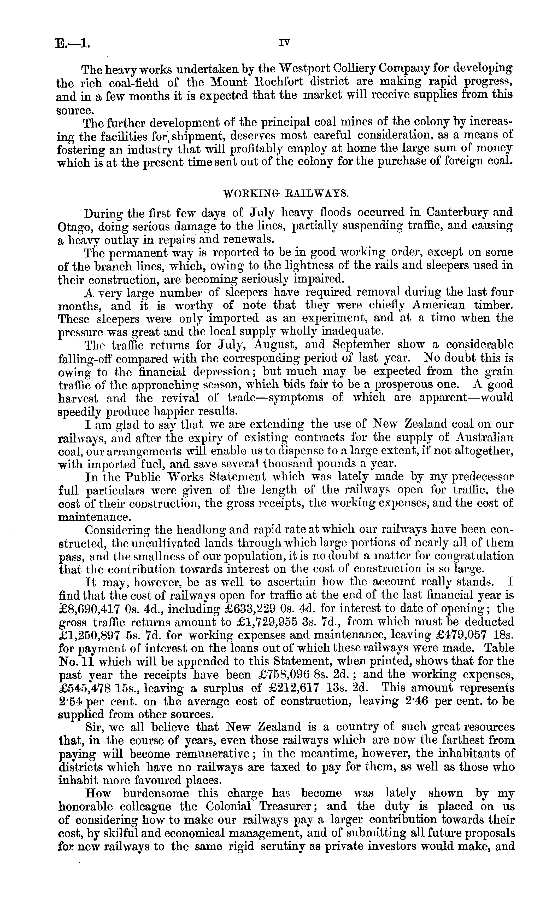 The heavy works undertaken by the Westport Colliery Company for developing the rich coal-field of the Mount Rochfort district are making rapid progress, and in a few months it is expected that the market will receive supplies from this source. The further development of the principal coal mines of the colony by increasing the facilities for ] shipment, deserves most careful consideration, as a means of fostering an industry that will profitably employ at home the large sum of money which is at the present time sent out of the colony for the purchase of foreign coal. WORKING RAILWAYS. During the first few days of July heavy floods occurred in Canterbury and Otago, doing serious damage to the lines, partially suspending traffic, and causing a heavy outlay in repairs and renewals. The permanent way is reported to be in good working order, except on some of the branch lines, which, owing to the lightness of the rails and sleepers used in their construction, are becoming seriously impaired. A very large number of sleepers have required removal during the last four months, and it is worthy of note that they were chiefly American timber. These sleepers were only imported as an experiment, and at a time when the pressure was great and the local supply wholly inadequate. The traffic returns for July, August, and September show a considerable falling-off compared with the corresponding period of last year. No doubt this is owing to the financial depression; but much may be expected from the grain traffic of the approaching season, which bids fair to be a prosperous one. A good harvest and the revival of trade—symptoms of which are apparent—would speedily produce happier results. I am glad to say that we are extending the use of New Zealand coal on our railways, and after the expiry of existing contracts for the supply of Australian coal, our arrangements will enable us to dispense to a large extent, if not altogether, with imported fuel, and save several thousand pounds a year. In the Public Works Statement which was lately made by my predecessor full particulars were given of the length of the railways open for traffic, the cost of their construction, the gross receipts, the working expenses, and the cost of maintenance. Considering the headlong and rapid rate at which our railways have been constructed, the uncultivated lands through which large portions of nearly all of them pass, and the smallness of our population, it is no doubt a matter for congratulation that the contribution towards interest on the cost of construction is so large. It may, however, be as well to ascertain how the account really stands. I find that the cost of railways open for traffic at the end of the last financial year is £8,690,417 Os. 4d., including £633,229 Os. 4d. for interest to date of opening; the gross traffic returns amount to £1,729,955 3s. 7d., from which must be deducted £1,250,897 ss. 7d. for working expenses and maintenance, leaving £479,057 18s. for payment of interest on the loans out of which these railways were made. Table No. 11 which will be appended to this Statement, when printed, shows that for the past year the receipts have been £758,096 Bs. 2d.; and the working expenses, £545,478 155., leaving a surplus of £212,617 13s. 2d. This amount represents 2-54 per cent, on the average cost of construction, leaving 2*46 per cent, to be supplied from other sources. Sir, we all believe that New Zealand is a country of such great resources that, in the course of years, even those railways which are now the farthest from paying will become remunerative; in the meantime, however, the inhabitants of districts which have no railways are taxed to pay for them, as well as those who inhabit more favoured places. How burdensome this charge has become was lately shown by my honorable colleague the Colonial Treasurer; and the duty is placed on us of considering how to make our railways pay a larger contribution towards their cost, by skilful and economical management, and of submitting all future proposals for new railways to the same rigid scrutiny as private investors would make, and