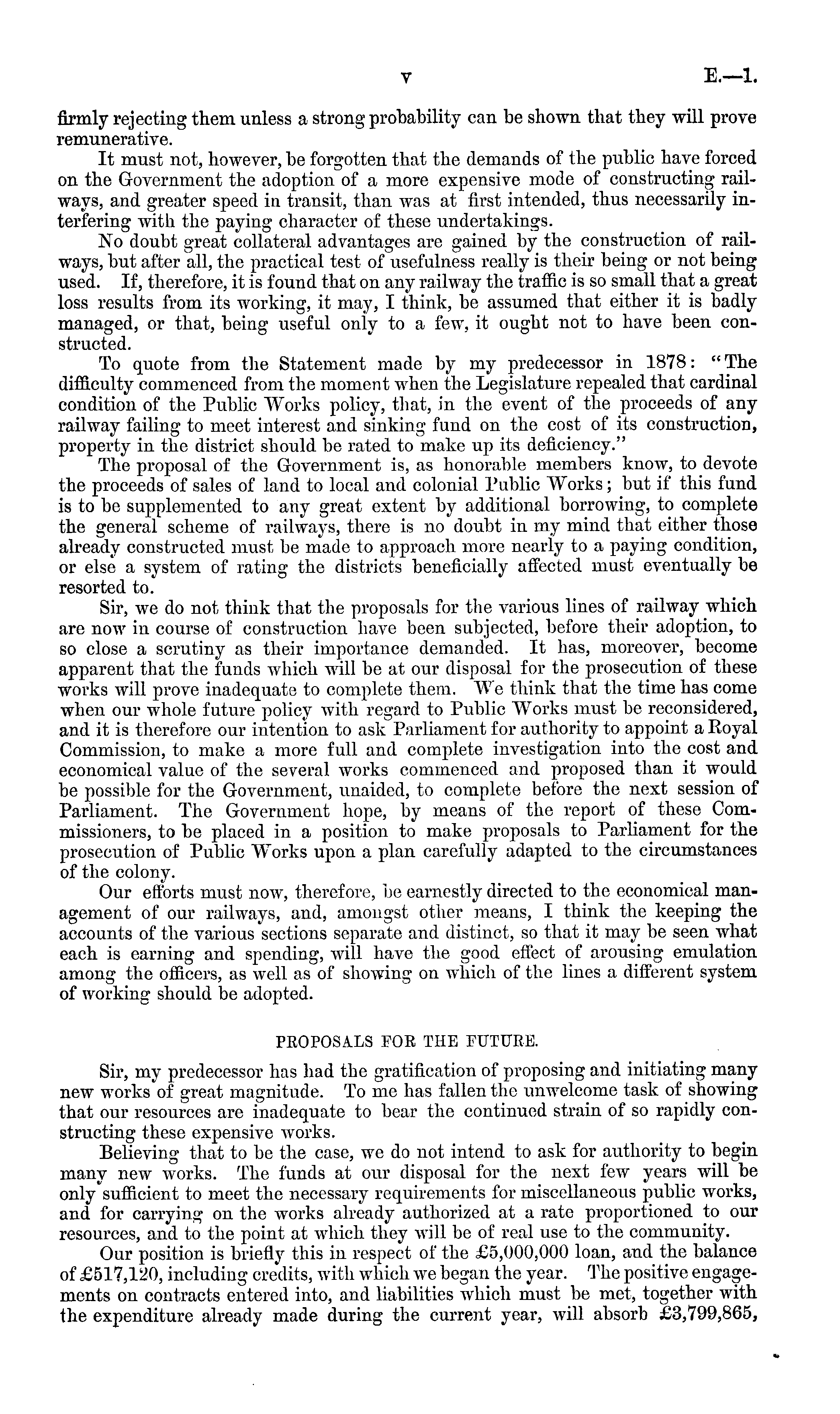 firmly rejecting them unless a strong probability can be shown that they will prove remunerative. It must not, however, be forgotten that the demands of the public have forced on the Government the adoption of a more expensive mode of constructing railways, and greater speed in transit, than was at first intended, thus necessarily interfering with the paying character of these undertakings. No doubt great collateral advantages are gained by the construction of railways, but after all, the practical test of usefulness really is their being or not being used. If, therefore, it is found that on any railway the traffic is so small that a great loss results from its working, it may, I think, be assumed that either it is badly managed, or that, being useful only to a few, it ought not to have been constructed. To quote from the Statement made by my predecessor in 1878: " The difficulty commenced from the moment when the Legislature repealed that cardinal condition of the Public Works policy, that, in the event of the proceeds of any railway failing to meet interest and sinking fund on the cost of its construction, property in the district should be rated to make up its deficiency." The proposal of the Government is, as honorable members know, to devote the proceeds of sales of land to local and colonial Public Works; but if this fund is to be supplemented to any great extent by additional borrowing, to complete the general scheme of railways, there is no doubt in my mind that either those already constructed must be made to approach more nearly to a paying condition, or else a system of rating the districts beneficially affected must eventually be resorted to. Sir, we do not think that the proposals for the various lines of railway which are now in course of construction have been subjected, before their adoption, to so close a scrutiny as their importance demanded. It has, moreover, become apparent that the funds which will be at our disposal for the prosecution of these works will prove inadequate to complete them. We think that the time has come when our whole future policy with regard to Public Works must be reconsidered, and it is therefore our intention to ask Parliament for authority to appoint a Royal Commission, to make a more full and complete investigation into the cost and economical value of the several works commenced and proposed than it would be possible for the Government, unaided, to complete before the next session of Parliament. The Government hope, by means of the report of these Commissioners, to be placed in a position to make proposals to Parliament for the prosecution of Public Works upon a plan carefully adapted to the circumstances of the colony. Our efforts must now, therefore, be earnestly directed to the economical management of our railways, and, amongst other means, I think the keeping the accounts of the various sections separate and distinct, so that it may be seen what each is earning and spending, will have the good effect of arousing emulation among the officers, as well as of showing on which of the lines a different system of working should be adopted. PROPOSALS FOR THE FUTURE. Sir, my predecessor has had the gratification of proposing and initiating many new works of great magnitude. To me has fallen the unwelcome task of showing that our resources are inadequate to bear the continued strain of so rapidly constructing these expensive works. Believing that to be the case, we do not intend to ask for authority to begin many new works. The funds at our disposal for the next few years will be only sufficient to meet the necessary requirements for miscellaneous public works, and for carrying on the works already authorized at a rate proportioned to our resources, and to the point at Avhich they will be of real use to the community. Our position is briefly this in respect of the £5,000,000 loan, and the balance of £517,120, including credits, with which we began the year. The positive engagements on contracts entered into, and liabilities which must be met, together with the expenditure already made during the current year, will absorb £3,799,865,